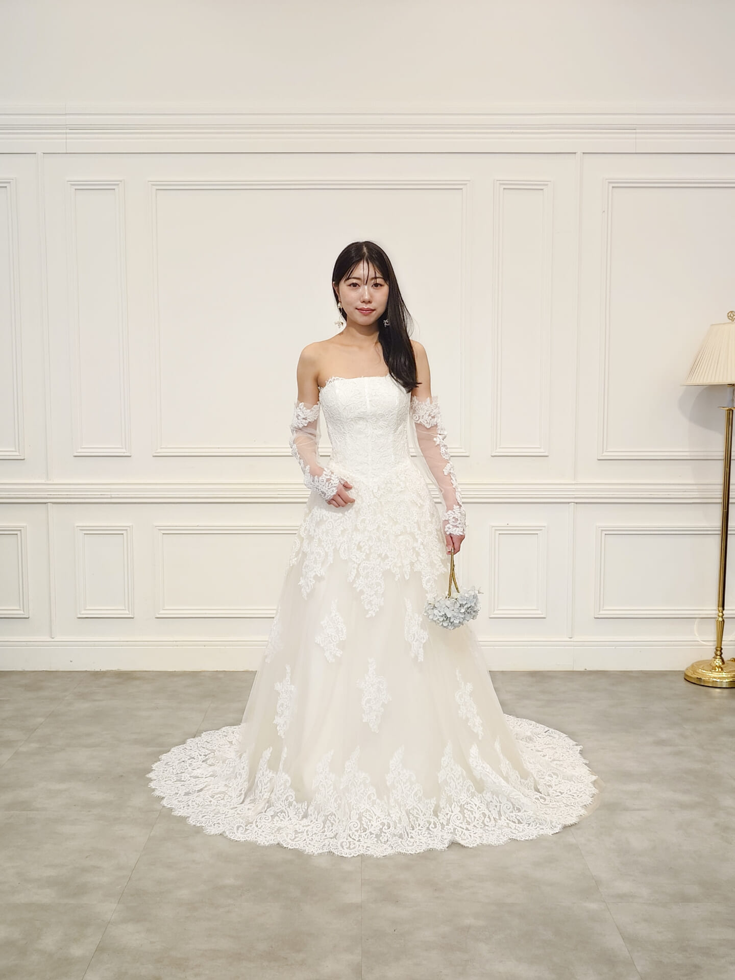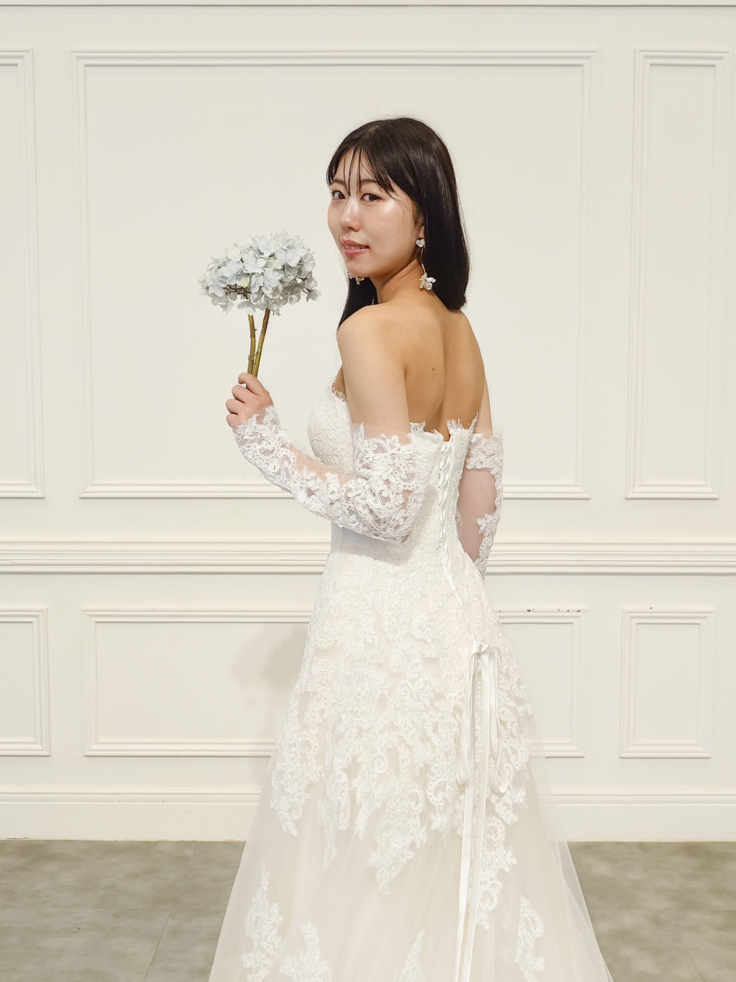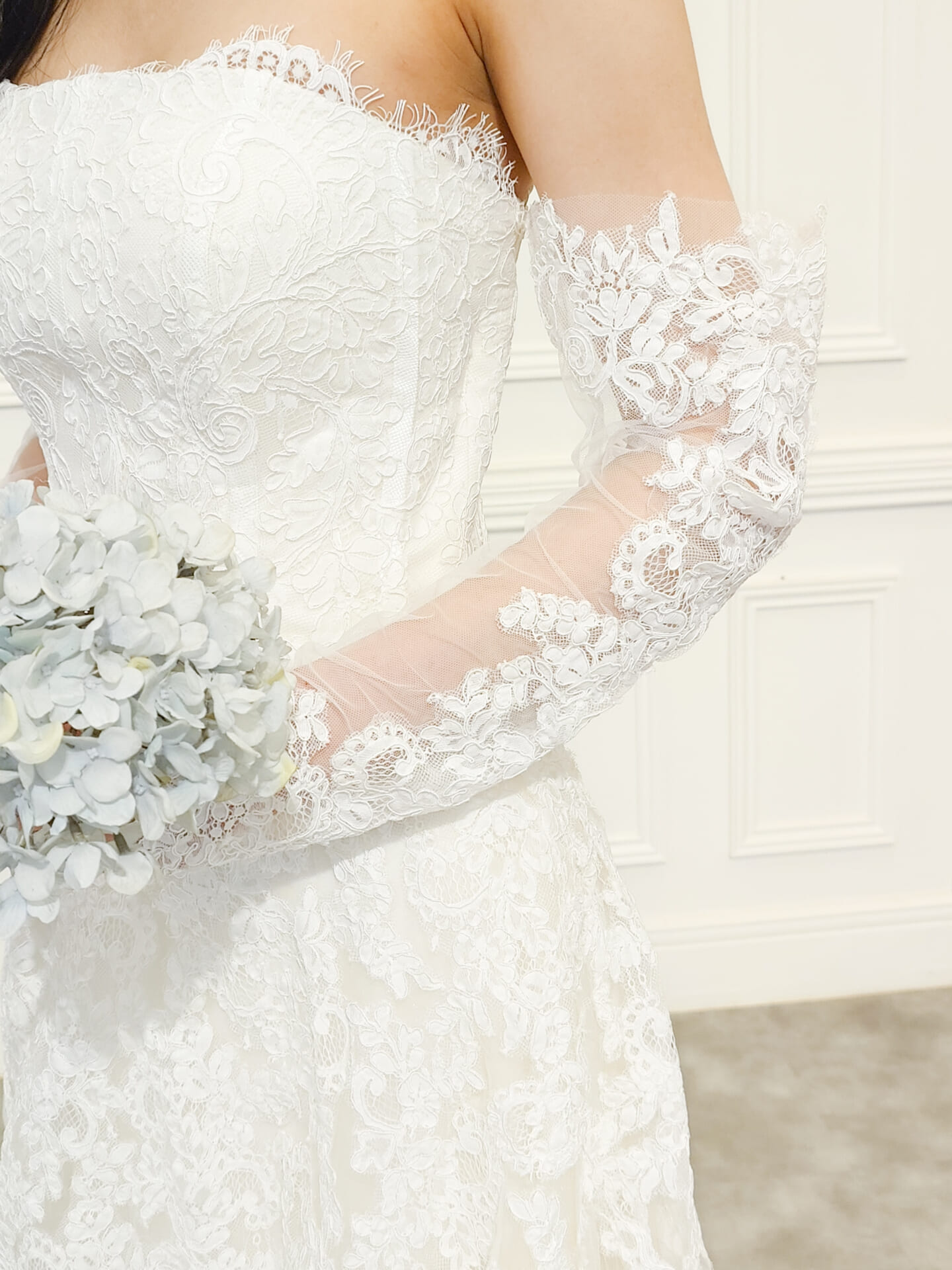 印象的なのは、取り外し可能なロングスリーブ。やわらかなチュールに繊細なレースモチーフが施されたスリーブは、手首までの長さがあり、透け感と装飾のバランスが絶妙で、手元まで美しく仕上げてくれます。挙式ではスリーブ付きで気品あるスタイルに、披露宴ではビスチェのすっきりとした装いにチェンジするなど、シーンによって表情を変えられるのも嬉しいポイントです。