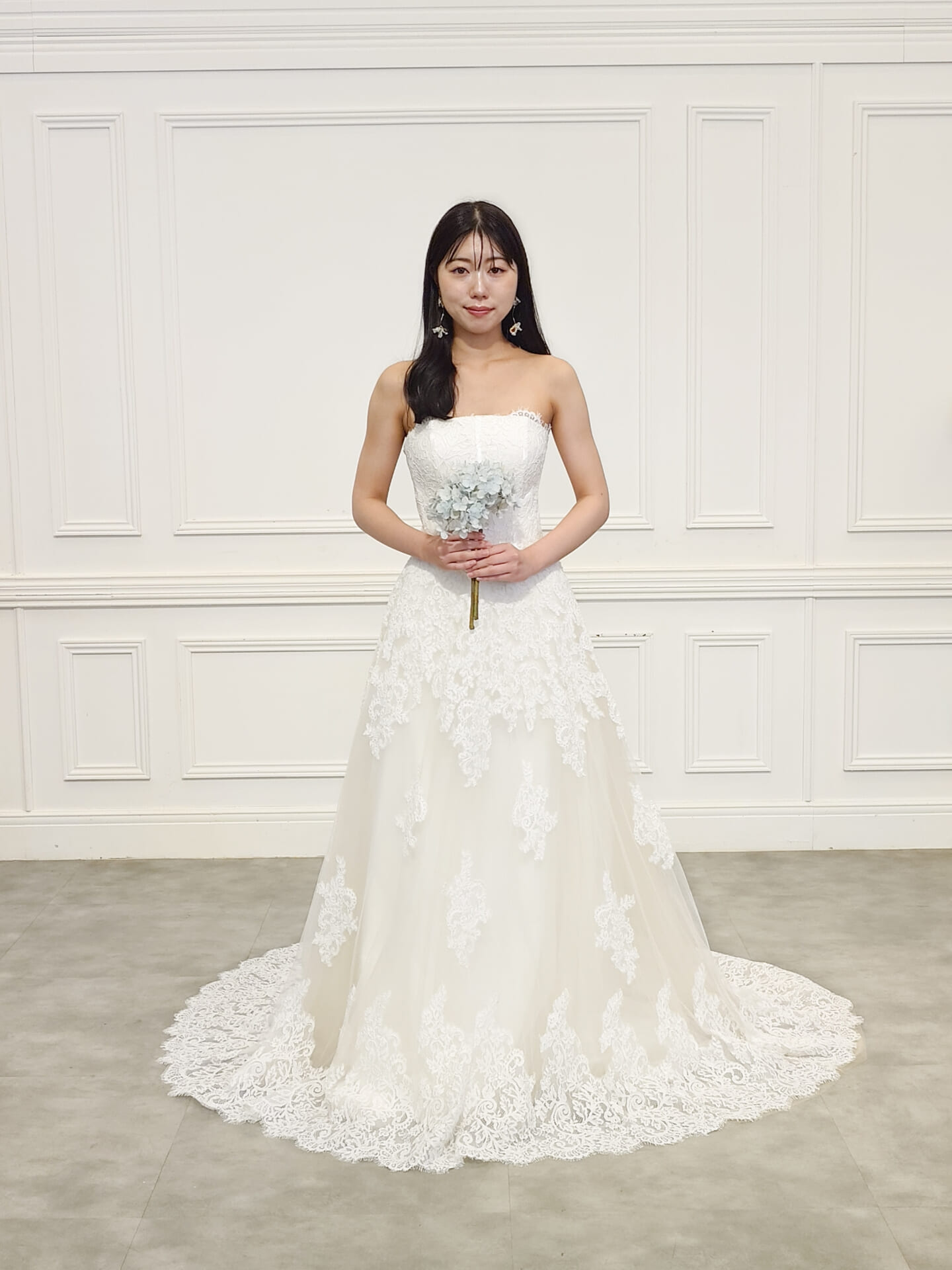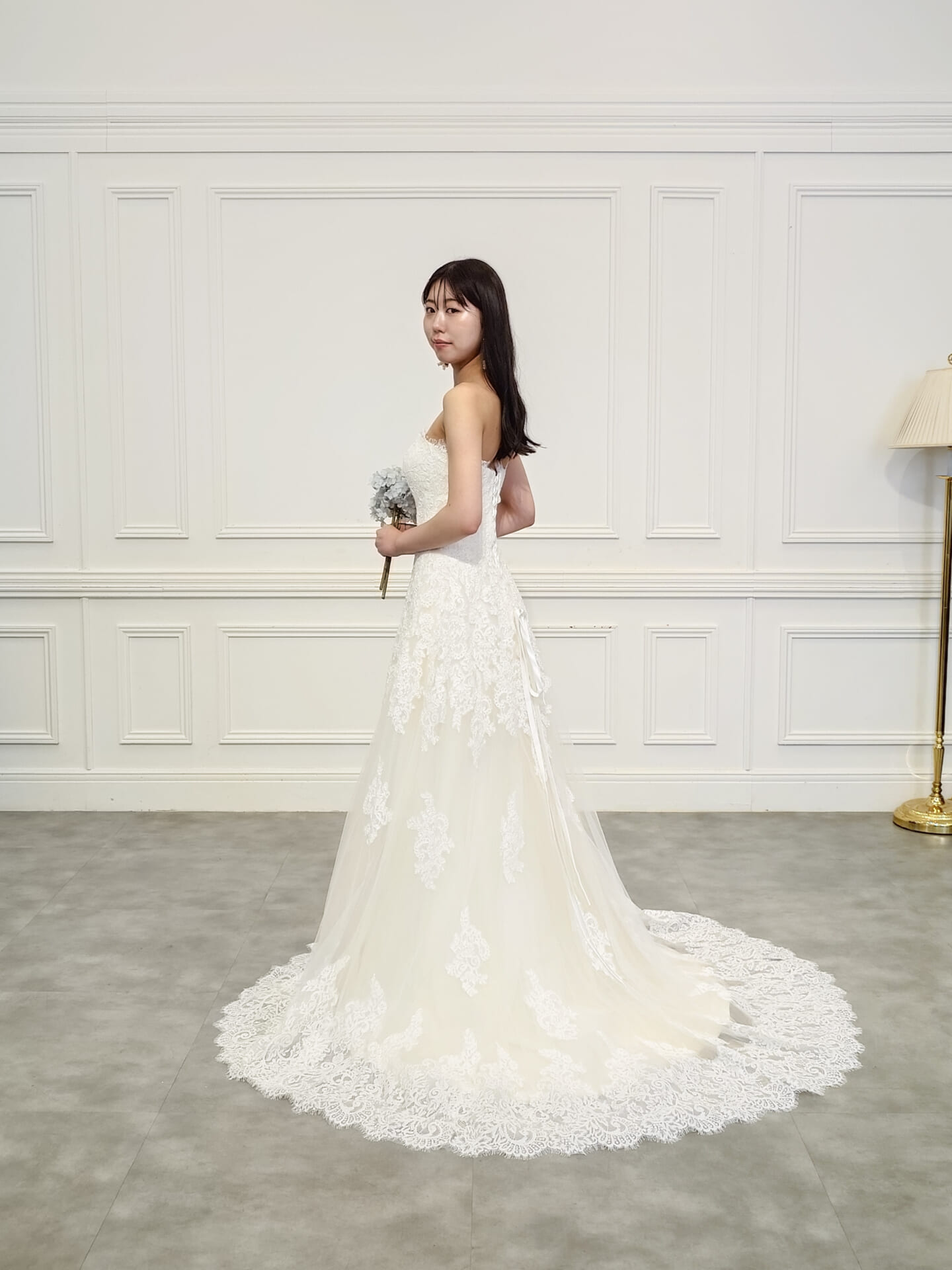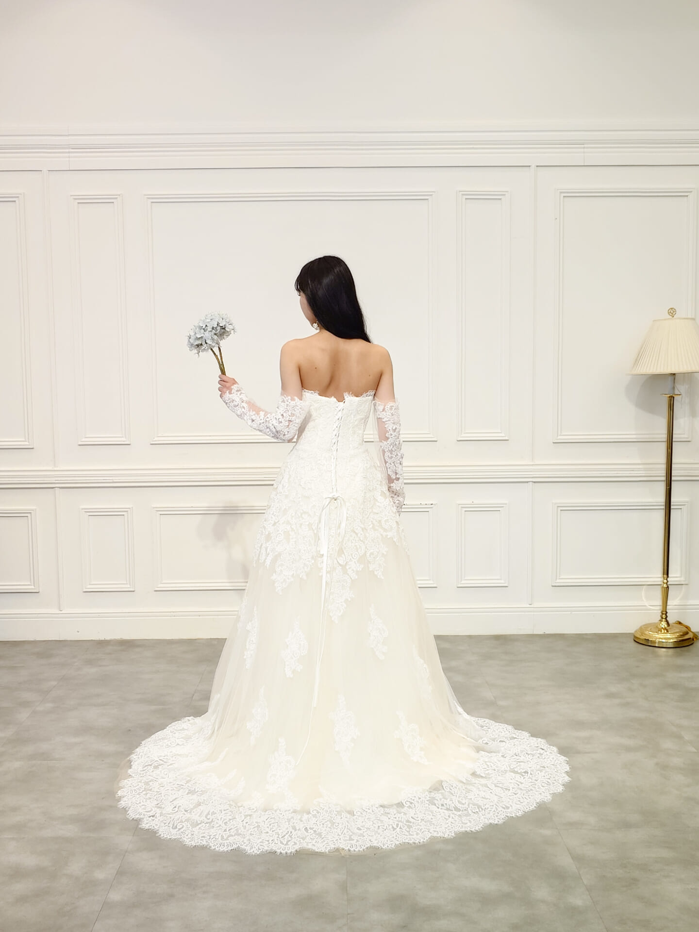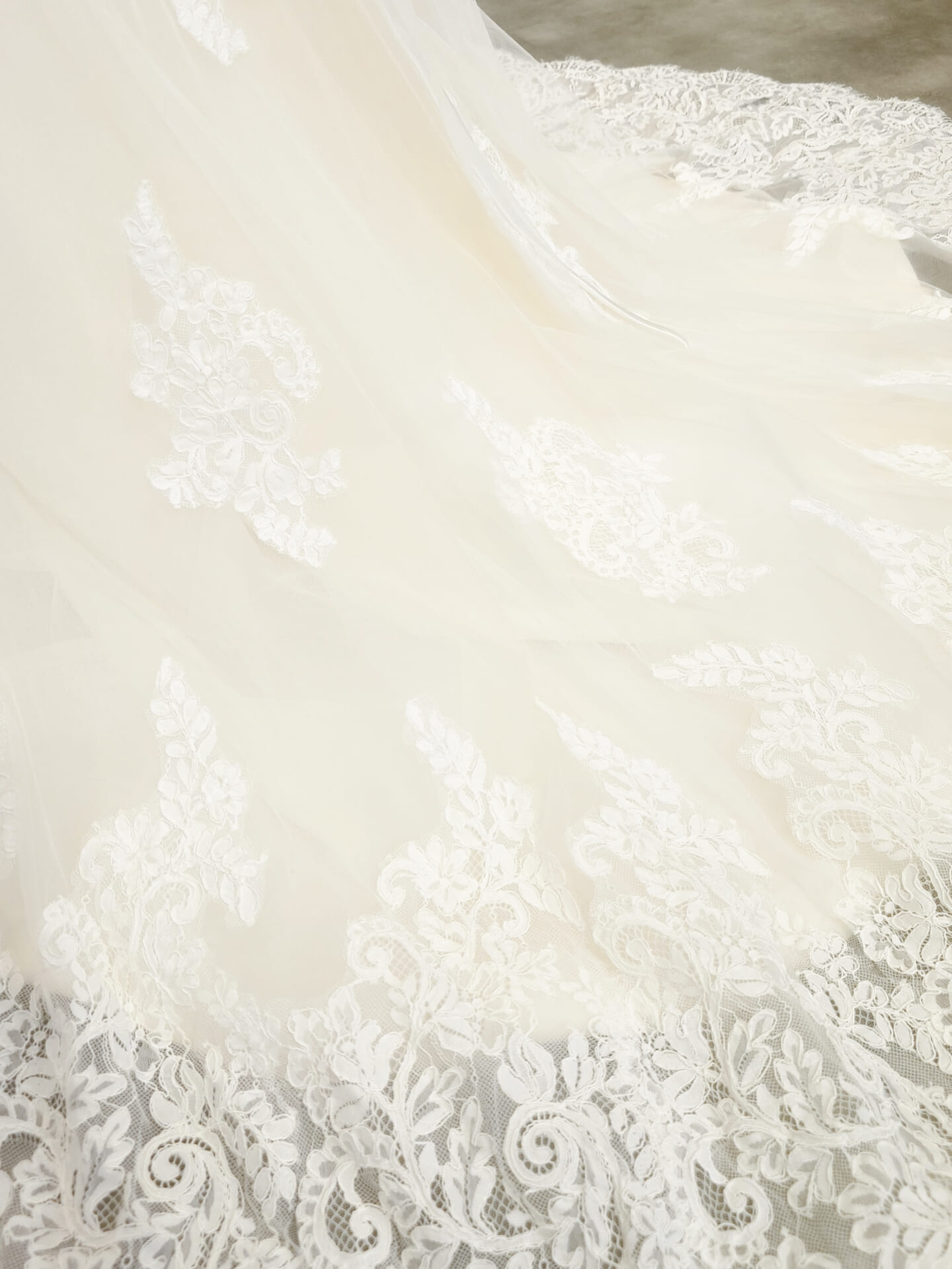 裾まわりには立体感のあるレースモチーフが広がり、バックスタイルにもドラマを添えています。ロングトレーンが優雅に広がり、歩くたびに繊細なレースがふわりと揺れて、どこから見ても美しく映える仕上がりです。