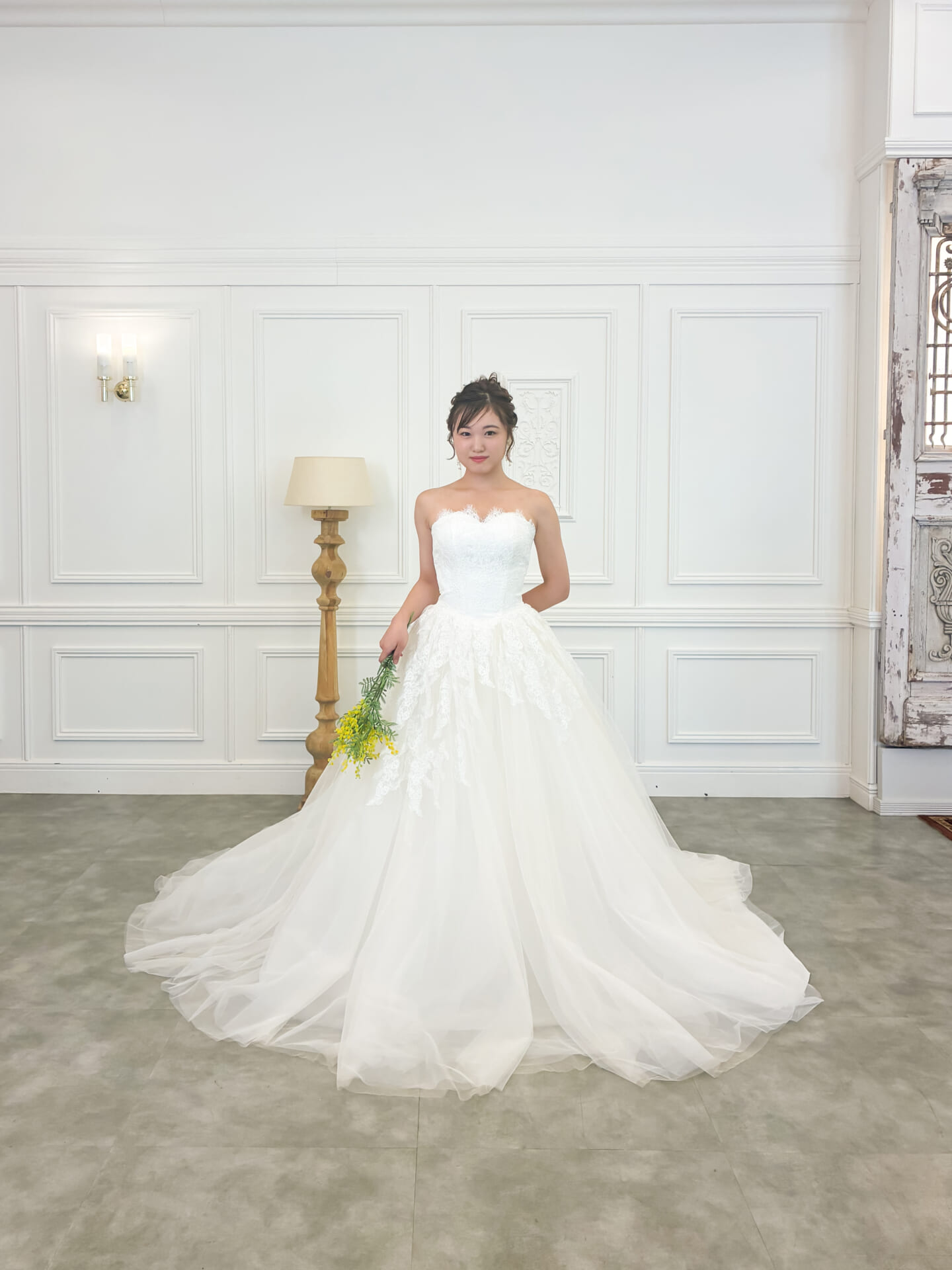 素材には、光をふんわりと受け止める上質なチュールとジャカード織のような表情のある生地を組み合わせ、シンプルながらも洗練された奥行きのあるデザインに。アクセサリーやベールとの相性も良く、コーディネート次第でナチュラルにも華やかにも仕上げられます。