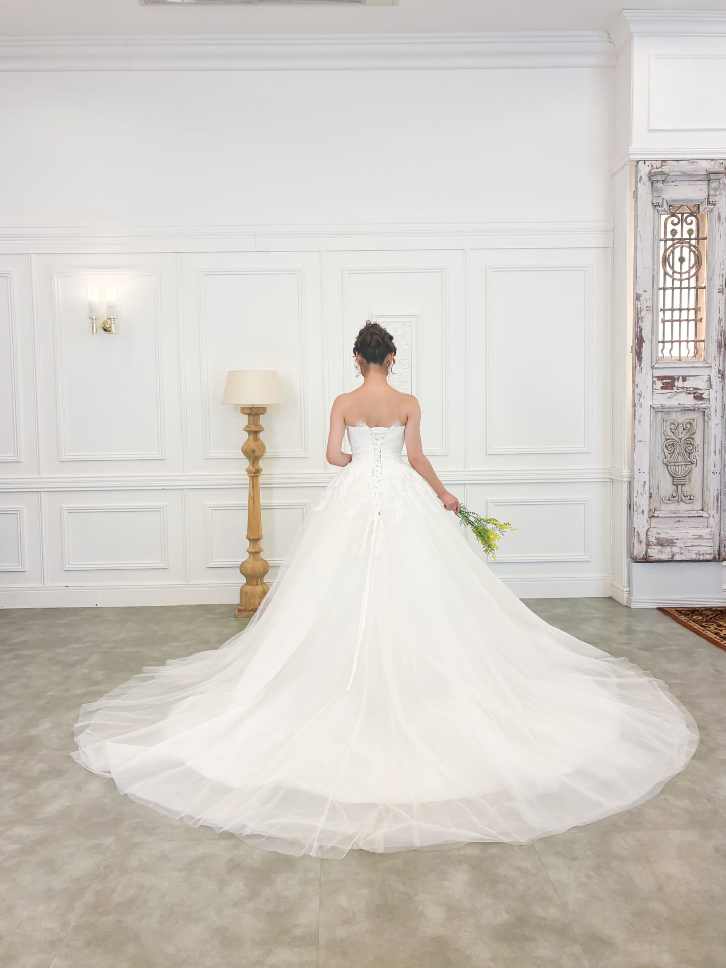 スカート部分には、軽やかに重ねられたソフトチュールがふんわりと広がり、花嫁さまの動きに合わせて柔らかく揺れます。ボリュームがありながらも重たく見えず、歩く姿や振り返る仕草までロマンティックに演出してくれるシルエット。特にバックスタイルでは、トレーンが放射状に広がり、写真映えも抜群です。