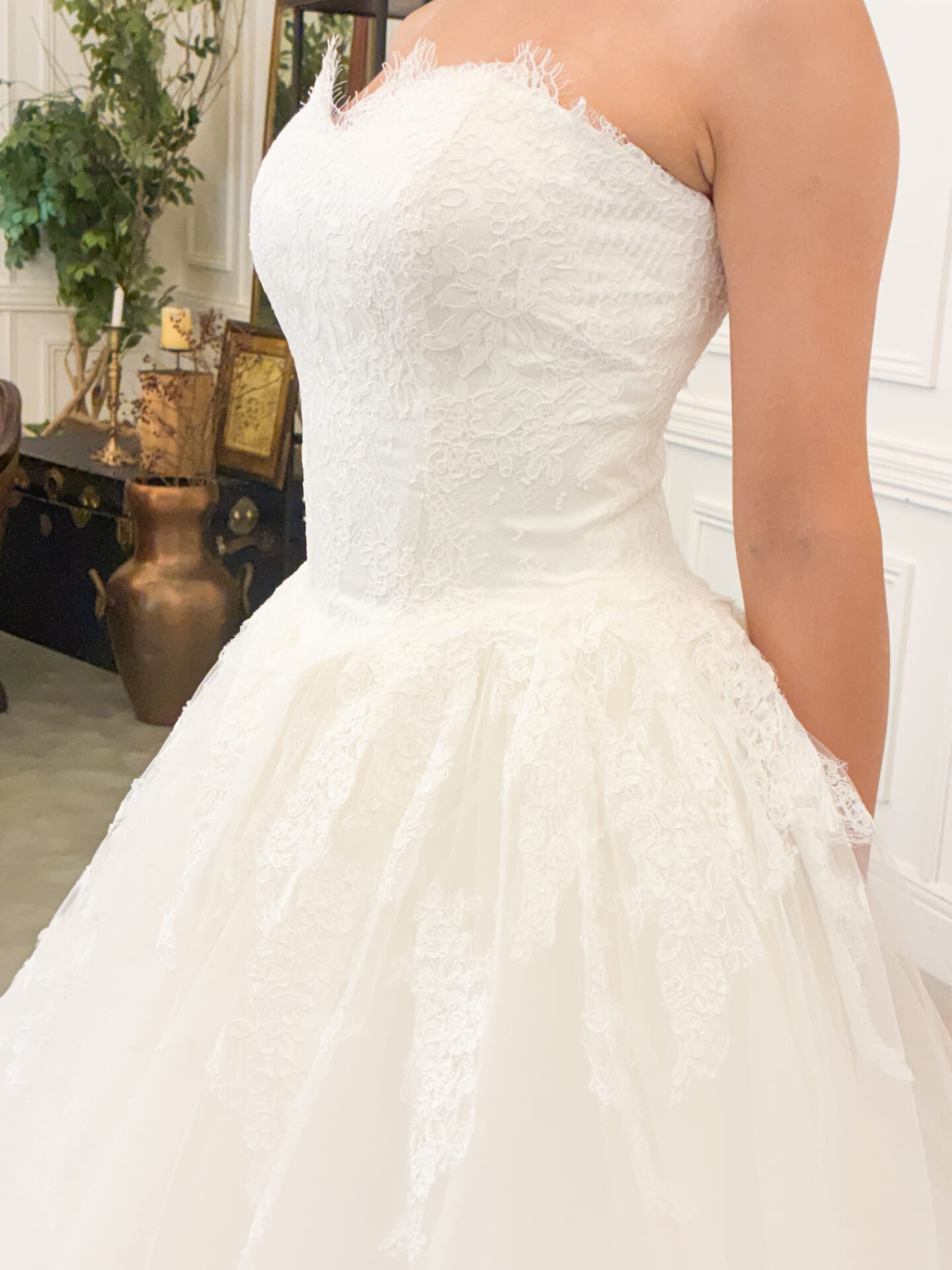 【Drina Dress】 王道の美しさを極めた、クラシカルなプリンセスラインドレス。ふんわりと広がる贅沢なスカートと、すっきりとしたビスチェのコントラストが美しく、存在感と気品を兼ね備えた一着です。
