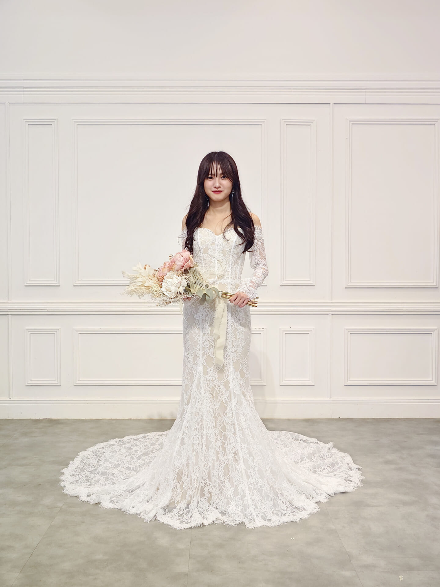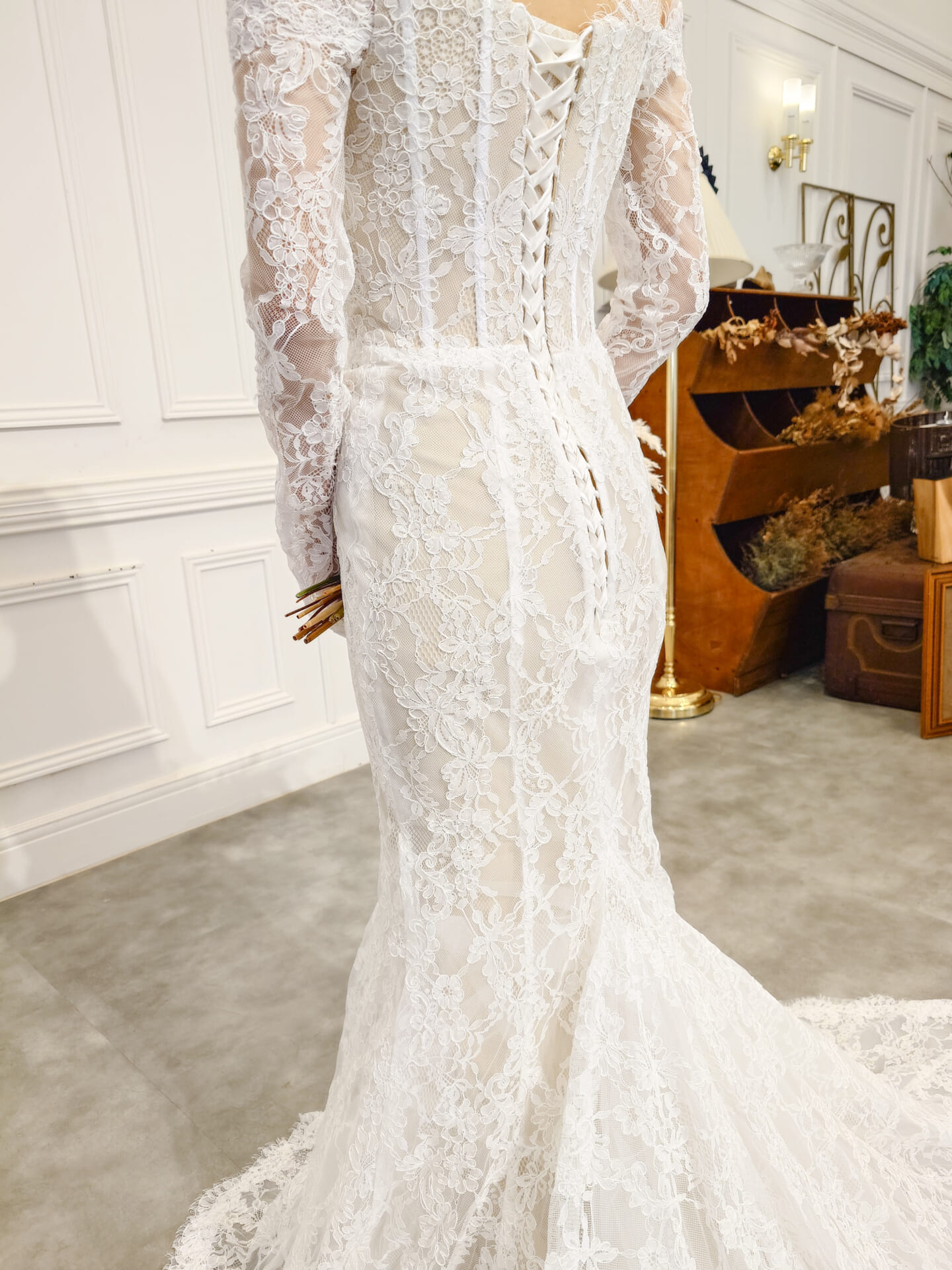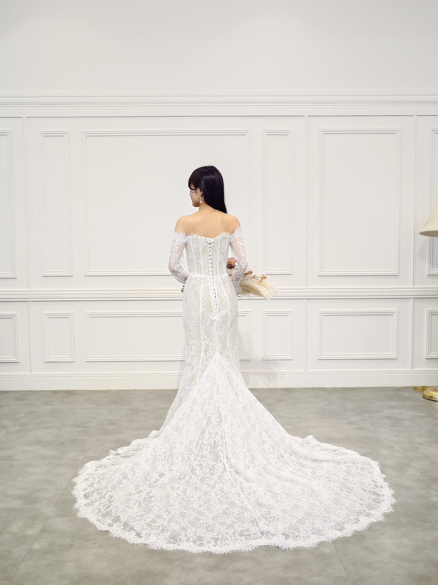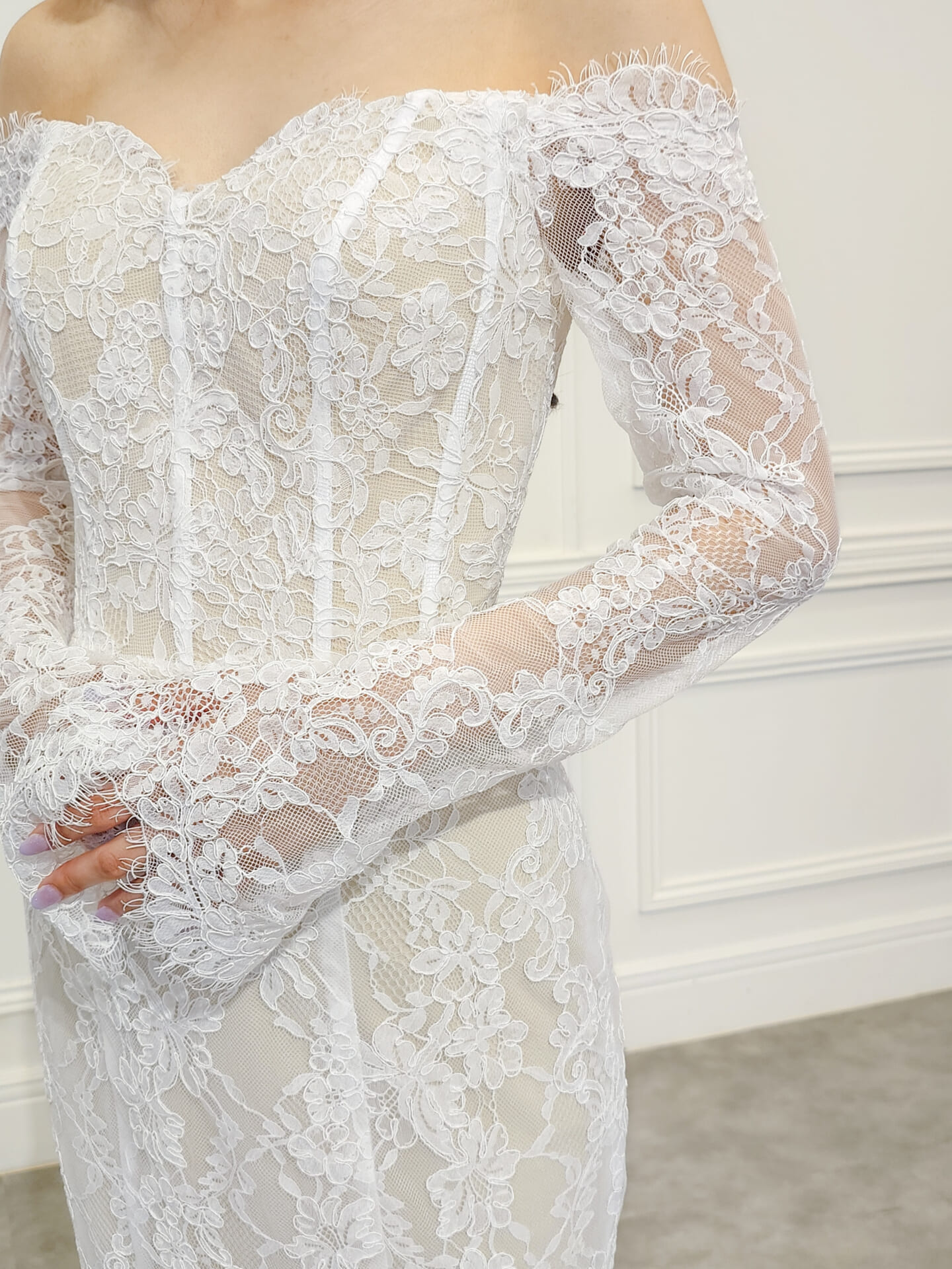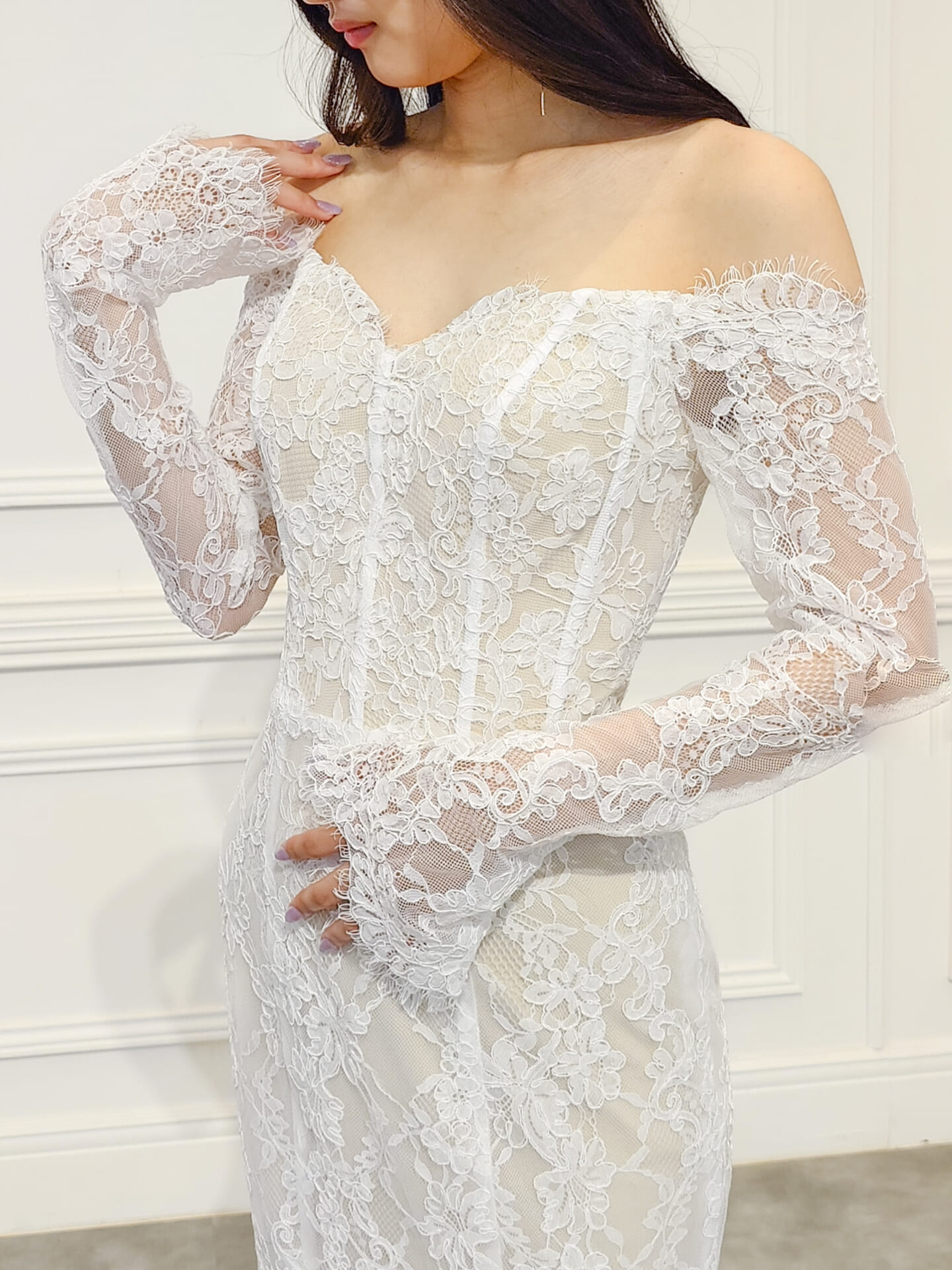 デコルテをすっきりと見せるビスチェ風カットに、繊細なチュールを重ねたオフショルダー仕様。デザイン性の高いロングスリーブは、手元までフィットするレースで構成されており、クラシカルで優雅な雰囲気を演出します。