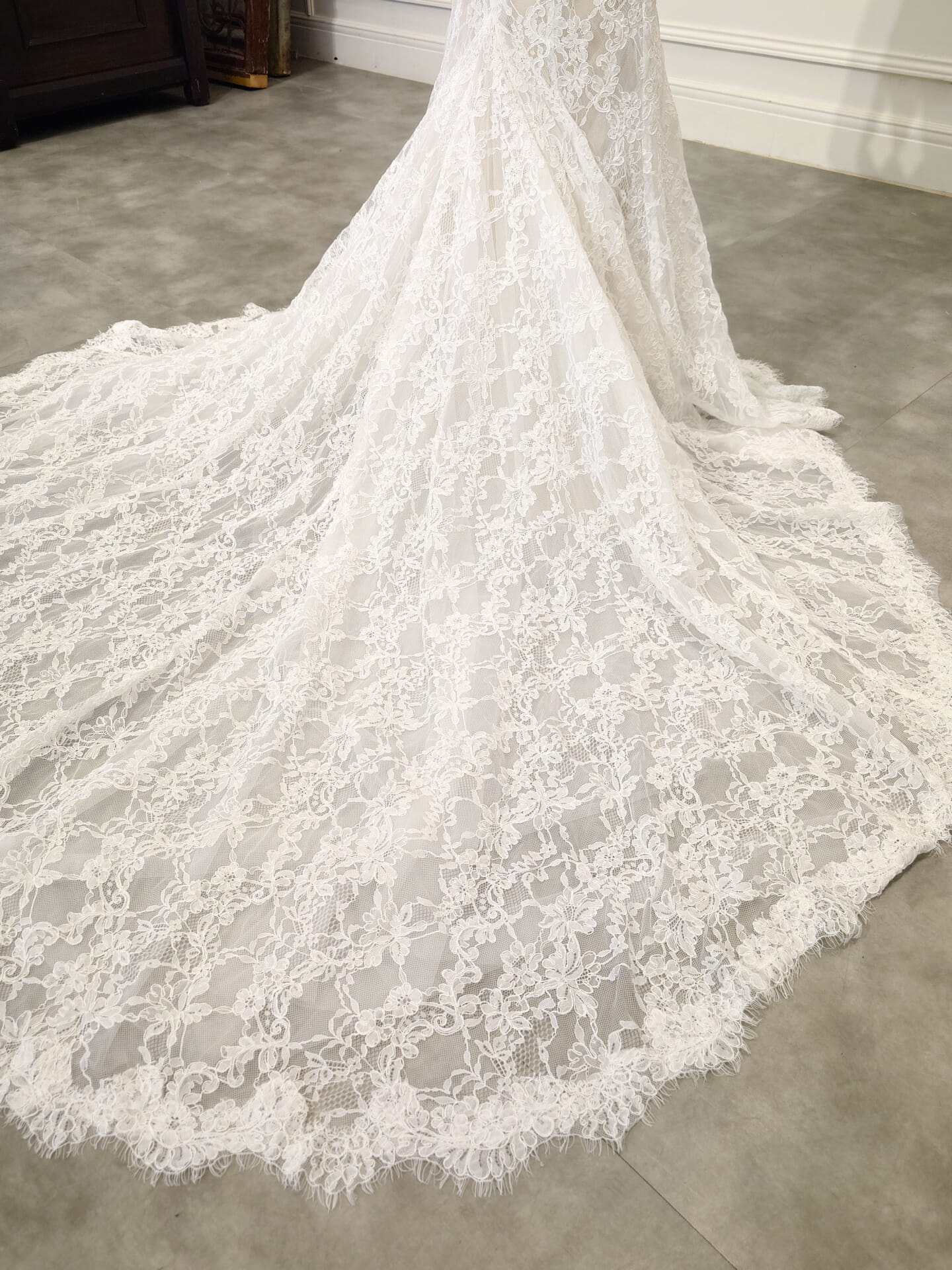裾まわりには贅沢なスカラレースがあしらわれ、繊細な柄が裾まで美しく続くデザイン。立体感のあるレース模様は光を受けて陰影が生まれ、写真でも印象的な美しさを放ちます。