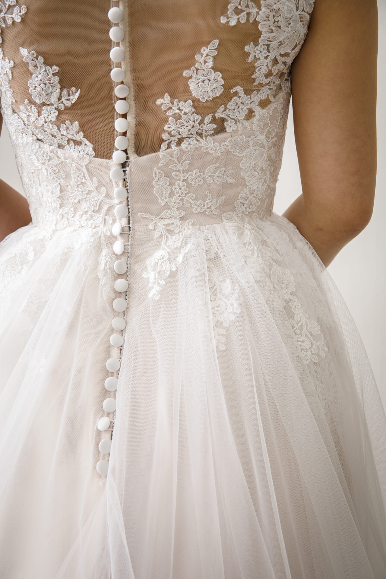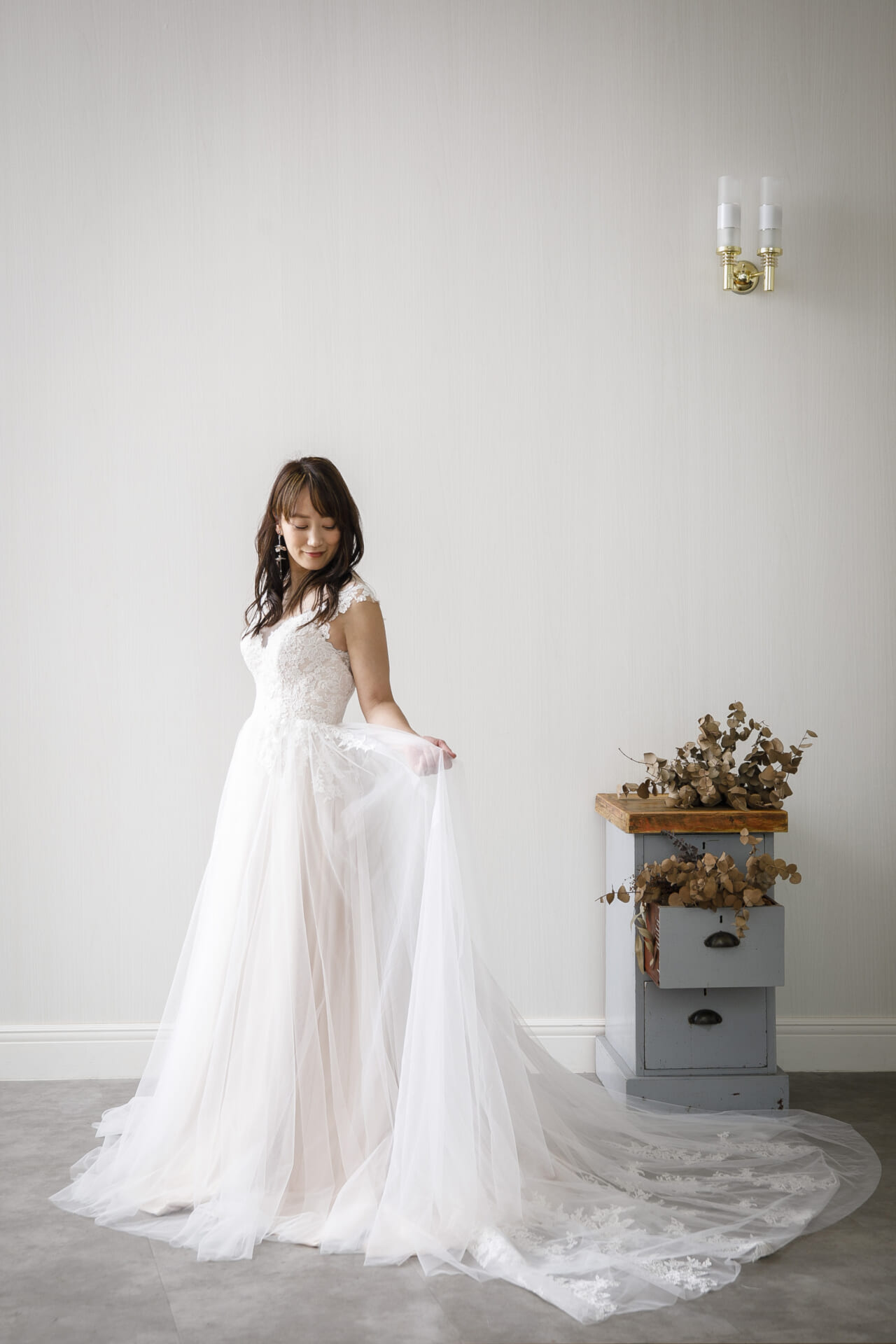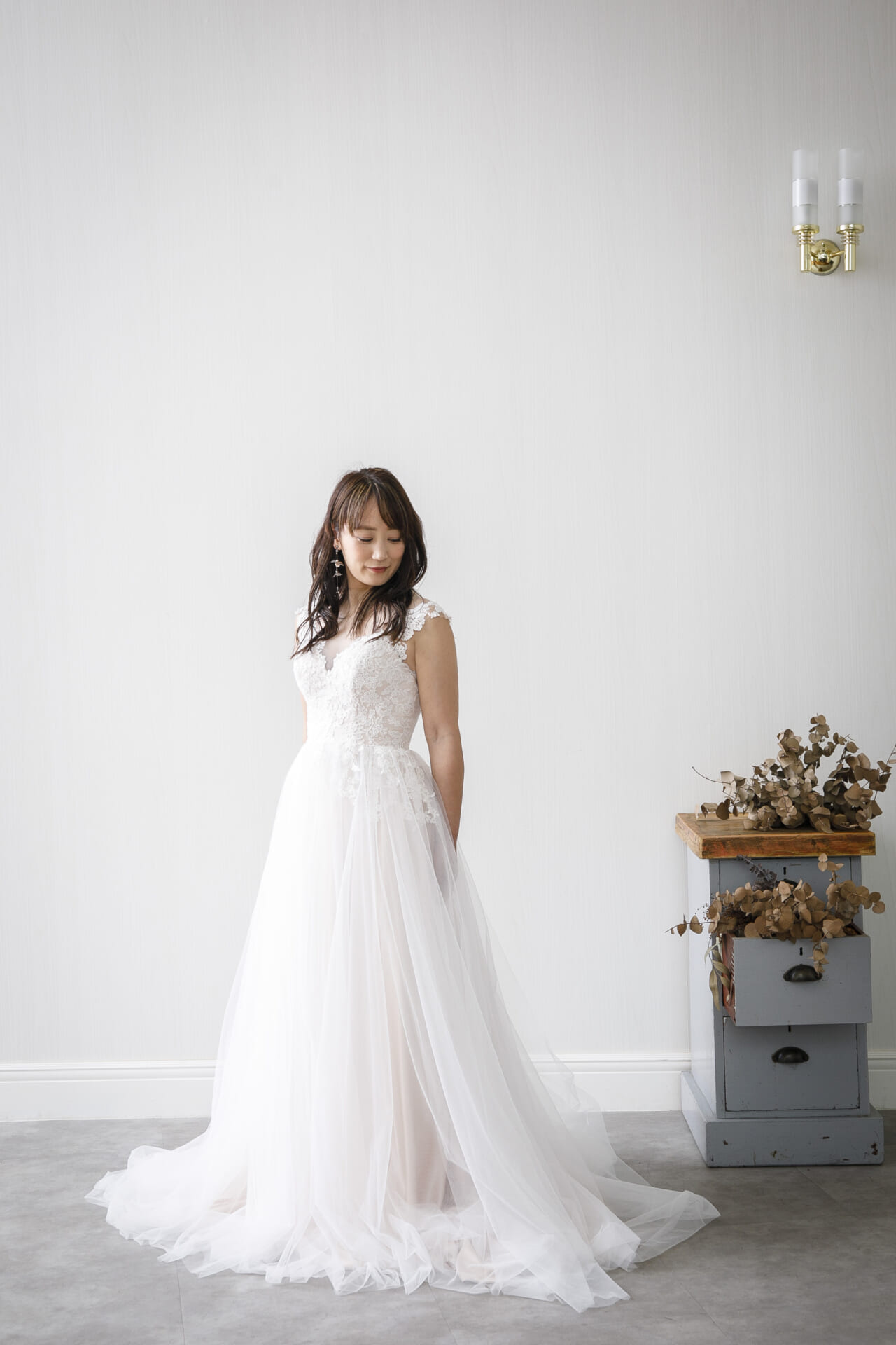 【Drina Dress】 軽やかなチュールと繊細なレースが美しく調和した、ナチュラルでフェミニンなAラインドレス。やわらかな風合いと優しいシルエットが、花嫁の魅力を引き立てる一着です。