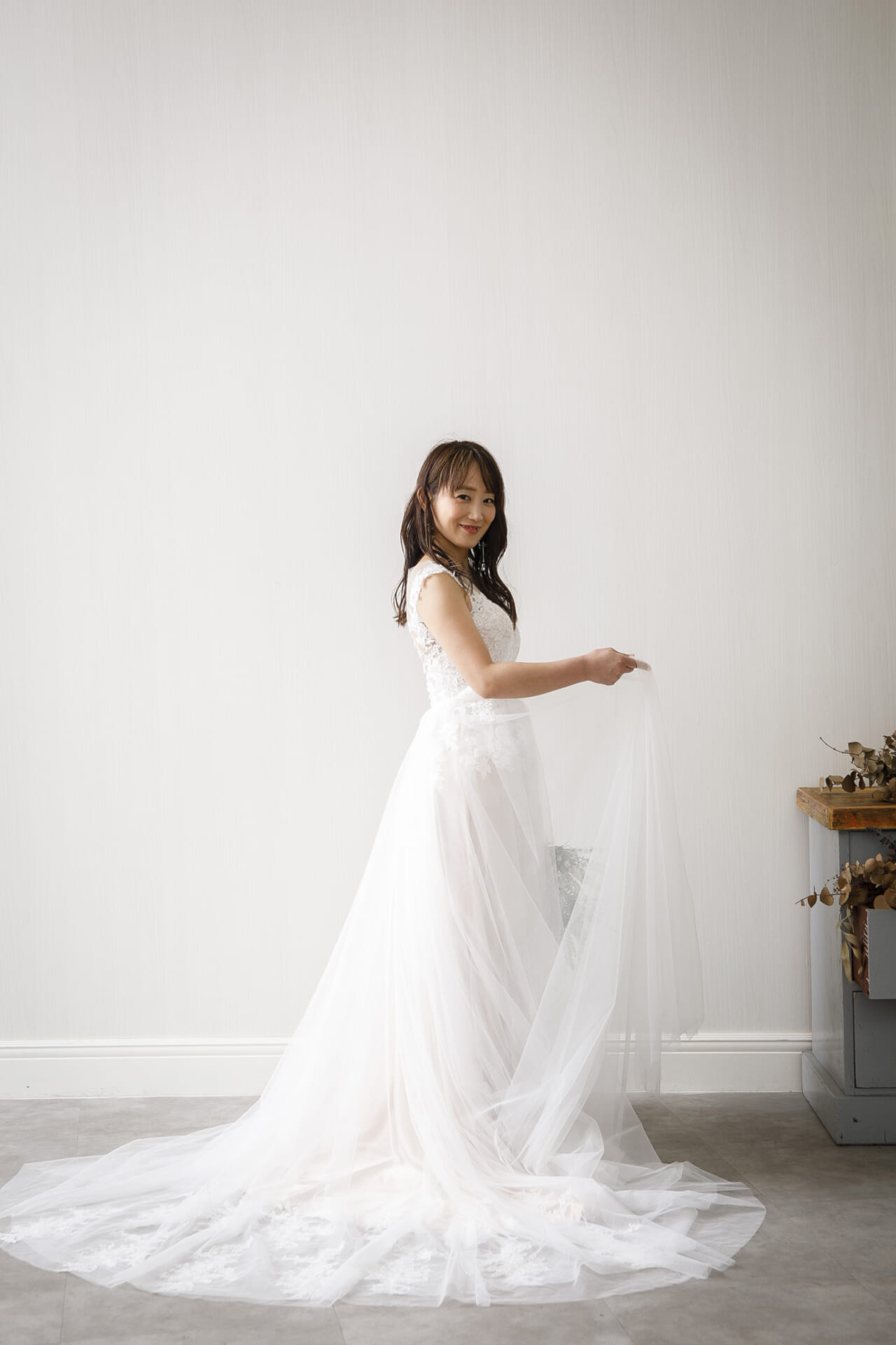 バックスタイルは程よく開いたVカットに、レースの縁取りが美しく施され、後ろ姿まで抜かりなく上品な印象に。トレーンも長すぎず、屋内外どちらのロケーションでも動きやすいデザインです。