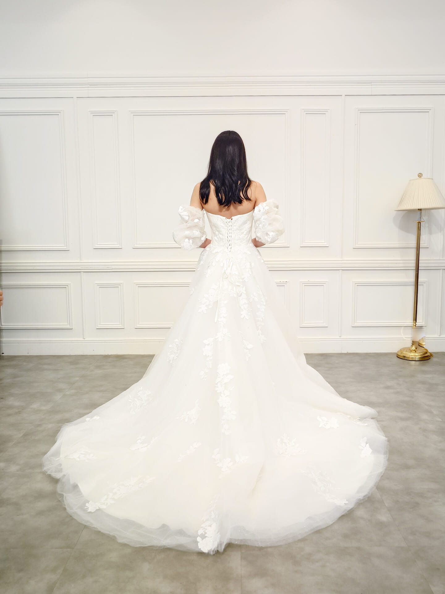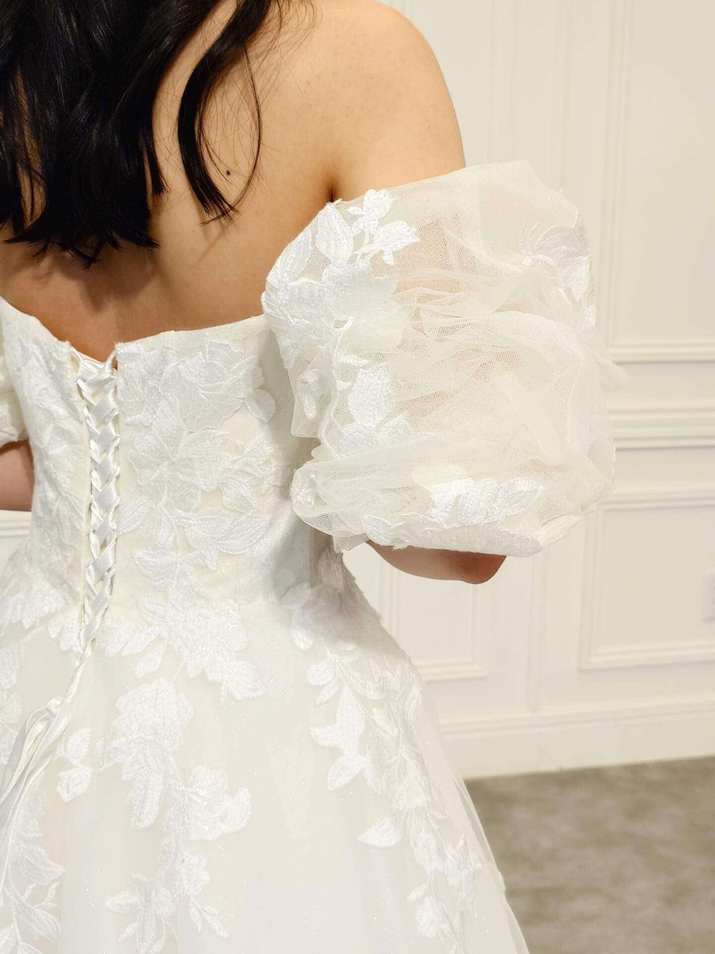 袖には、ふんわりとボリュームを持たせた立体的なパフスリーブを採用。オーガンジーに刺繍を施した取り外し可能なデザインで、シーンに応じてアレンジを楽しめます。挙式では袖ありでクラシカルに、披露宴ではすっきりとしたビスチェスタイルで、など変化をつけた着こなしも魅力。