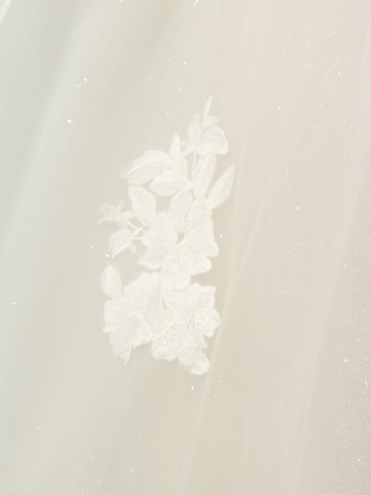 ドレス全体にあしらわれたフラワーモチーフの刺繍は立体感があり、光を受けるたびにやさしく浮かび上がるような表情を演出。ふんわりと広がるチュールスカートが歩みに合わせて揺れ、まるで花が咲き誇るガーデンの中を歩いているかのような印象に。