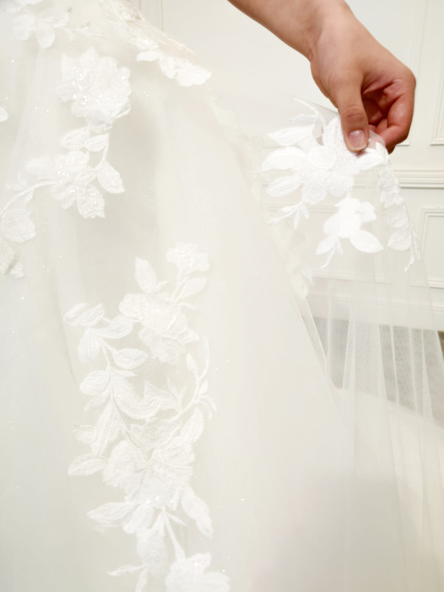 【Drina Dress】 立体的な刺繍と柔らかなチュールが織りなす、エレガントで愛らしいAラインドレス。軽やかさと華やかさを兼ね備えた一着で、花嫁さまの特別な一日に上品な彩りを添えます。