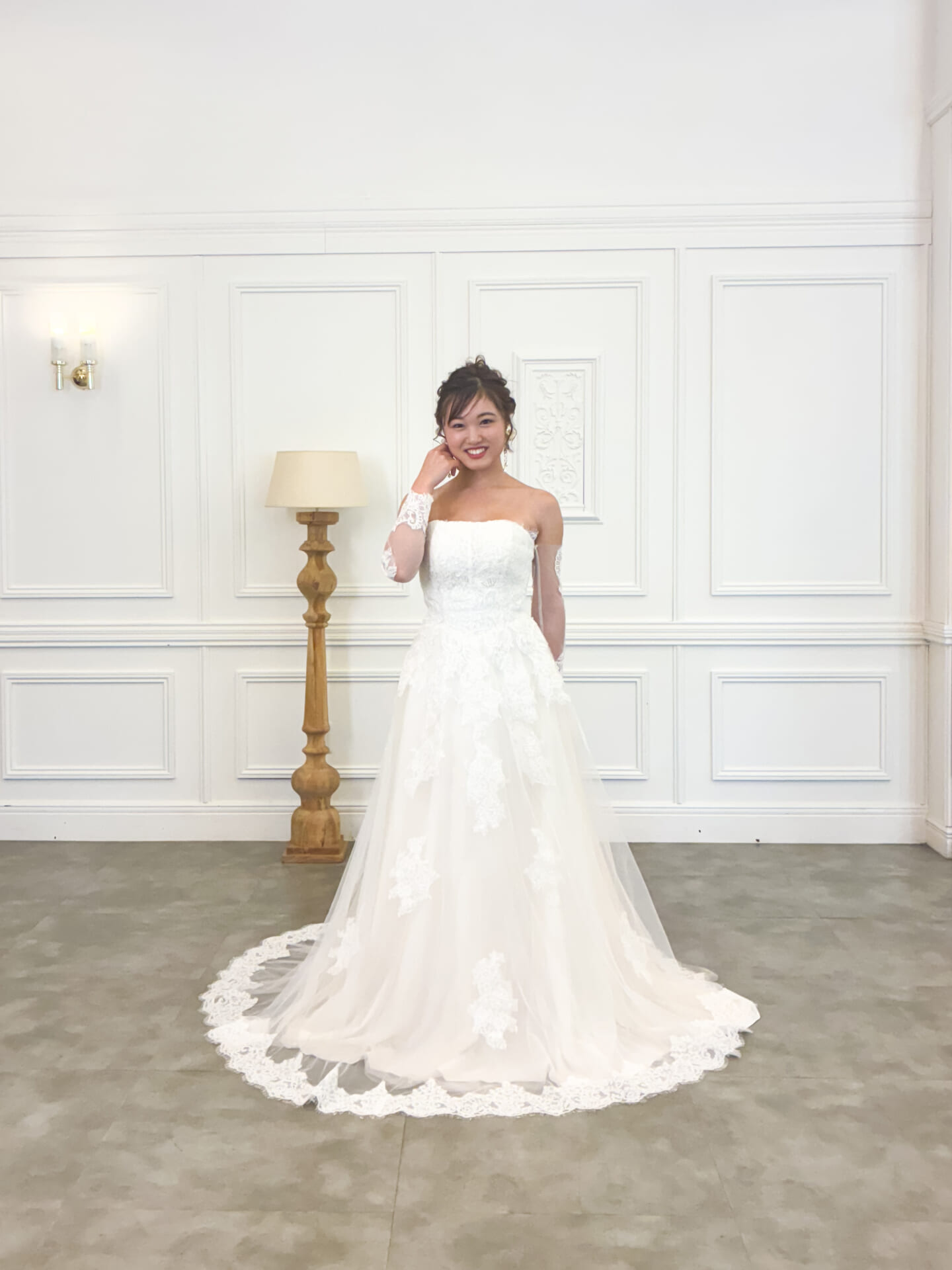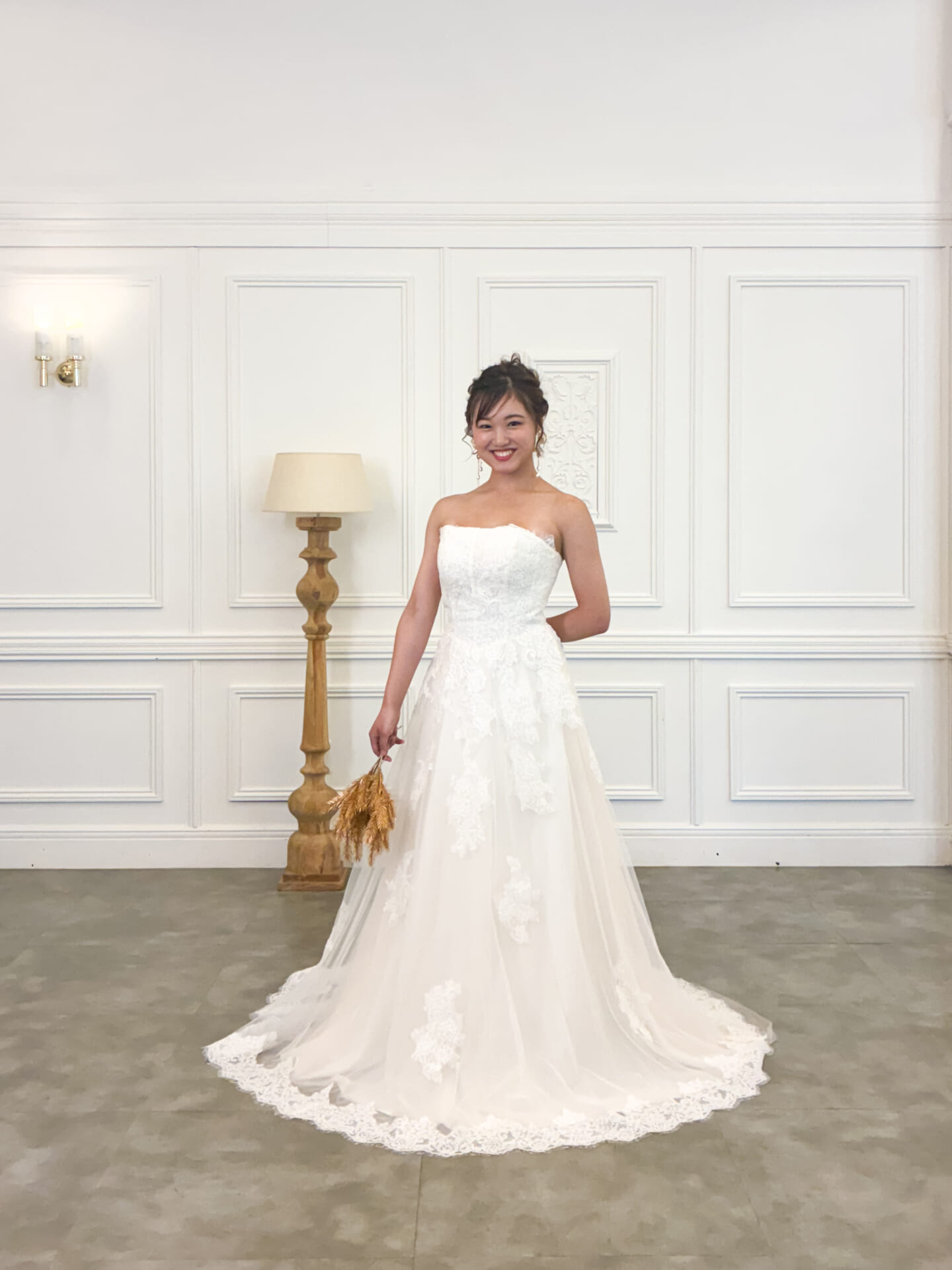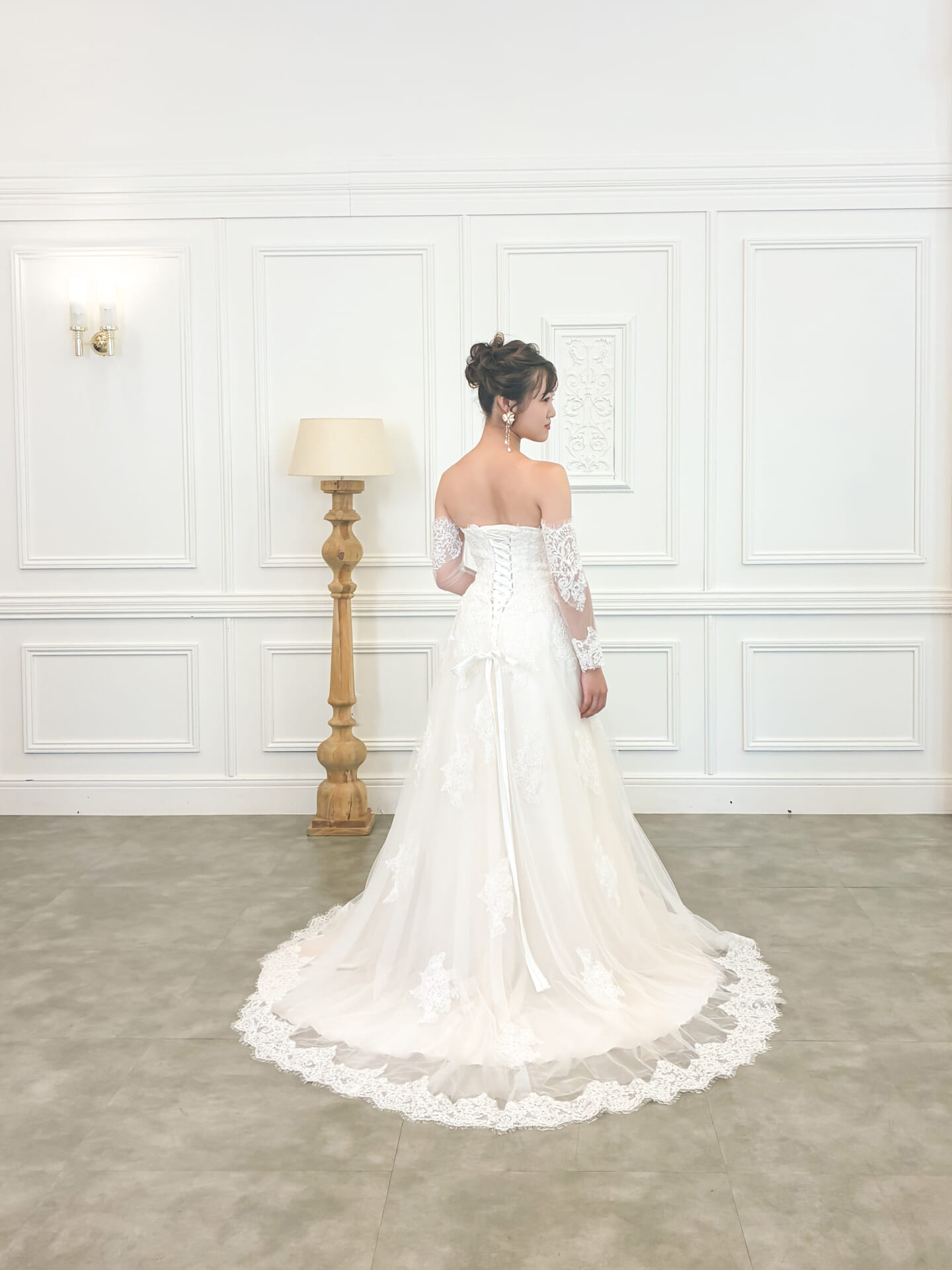 クラシックな雰囲気を大切にしながらも、どこか現代的な洗練さを感じさせるこの一着は、幅広い世代からの支持を得られる上質なデザイン。ブーケやアクセサリー次第で、より自分らしいコーディネートをお楽しみいただけます。