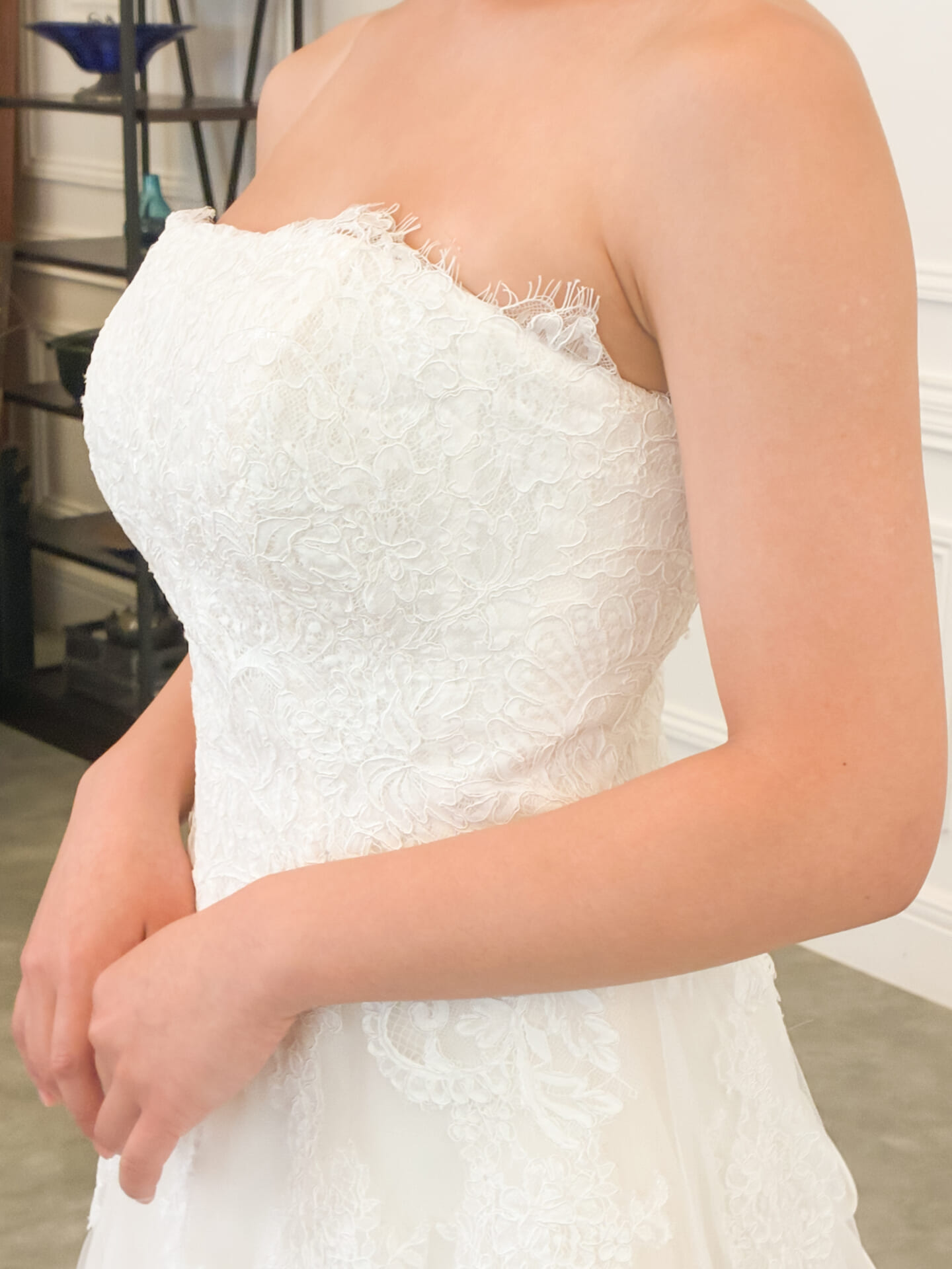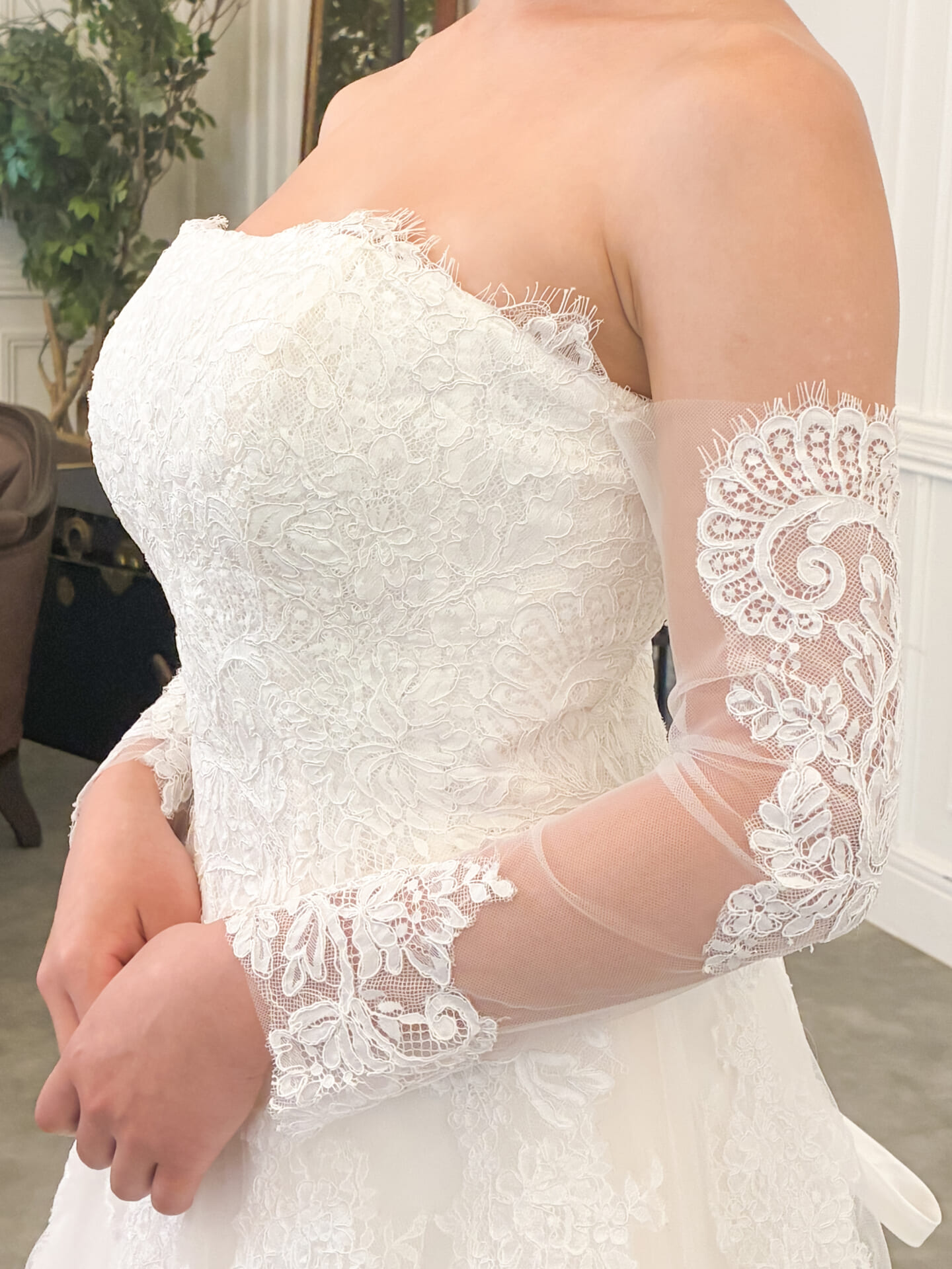 ビスチェ部分は、女性らしいカーヴィなラインを強調する立体的な仕立て。繊細なリバーレースが贅沢にあしらわれ、華やかさの中にも落ち着いた気品を感じさせます。さらに、取り外し可能なレーススリーブは、袖口まで緻密に編み込まれた柄が印象的で、クラシカルな雰囲気を演出。腕をほっそりと見せながらも、上半身に柔らかなニュアンスをプラスします。