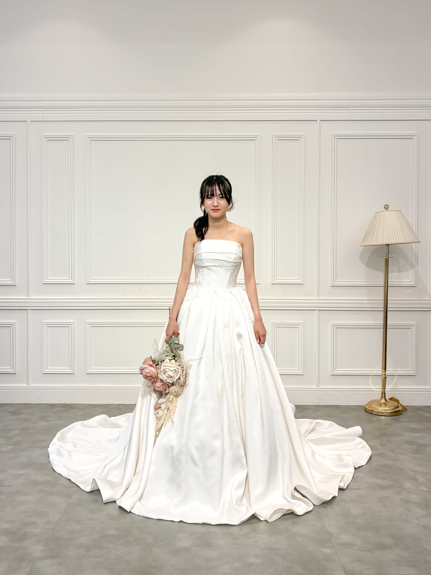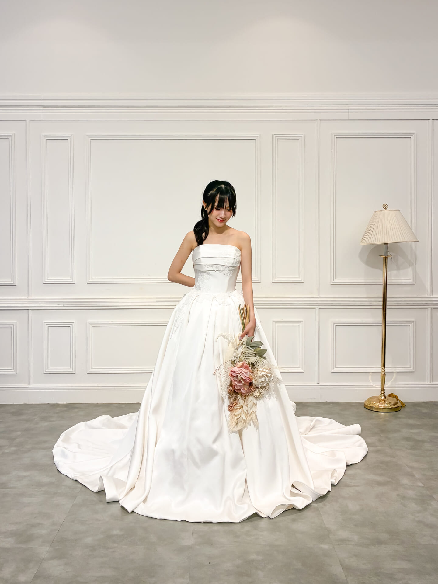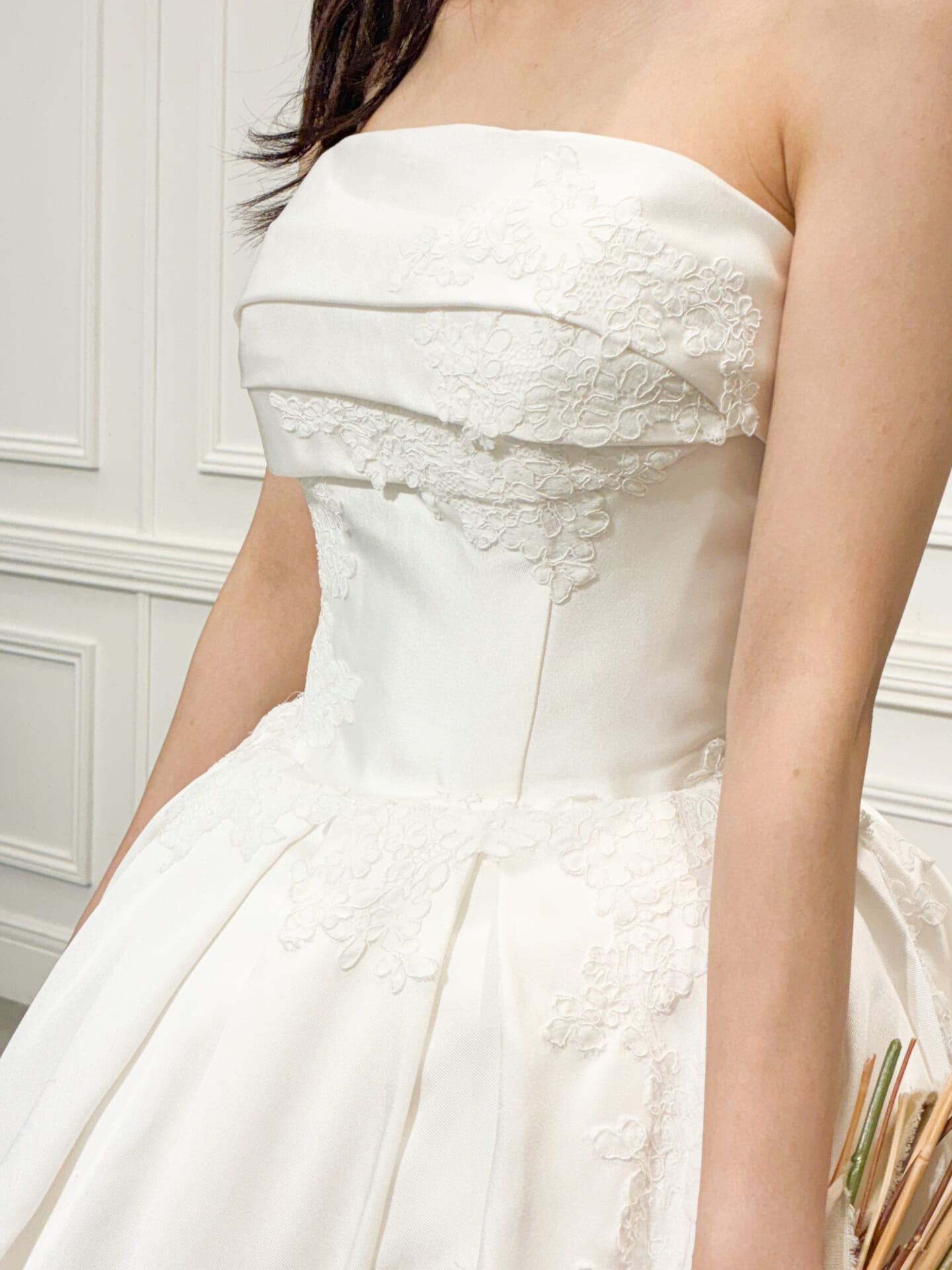 素材にはハリ感のある上質なサテンを使用。ボリュームのあるシルエットをしっかりと支えながらも、重すぎず軽やかな着心地を実現しています。清楚で格式のあるスタイルを求める花嫁さまにぴったりです。