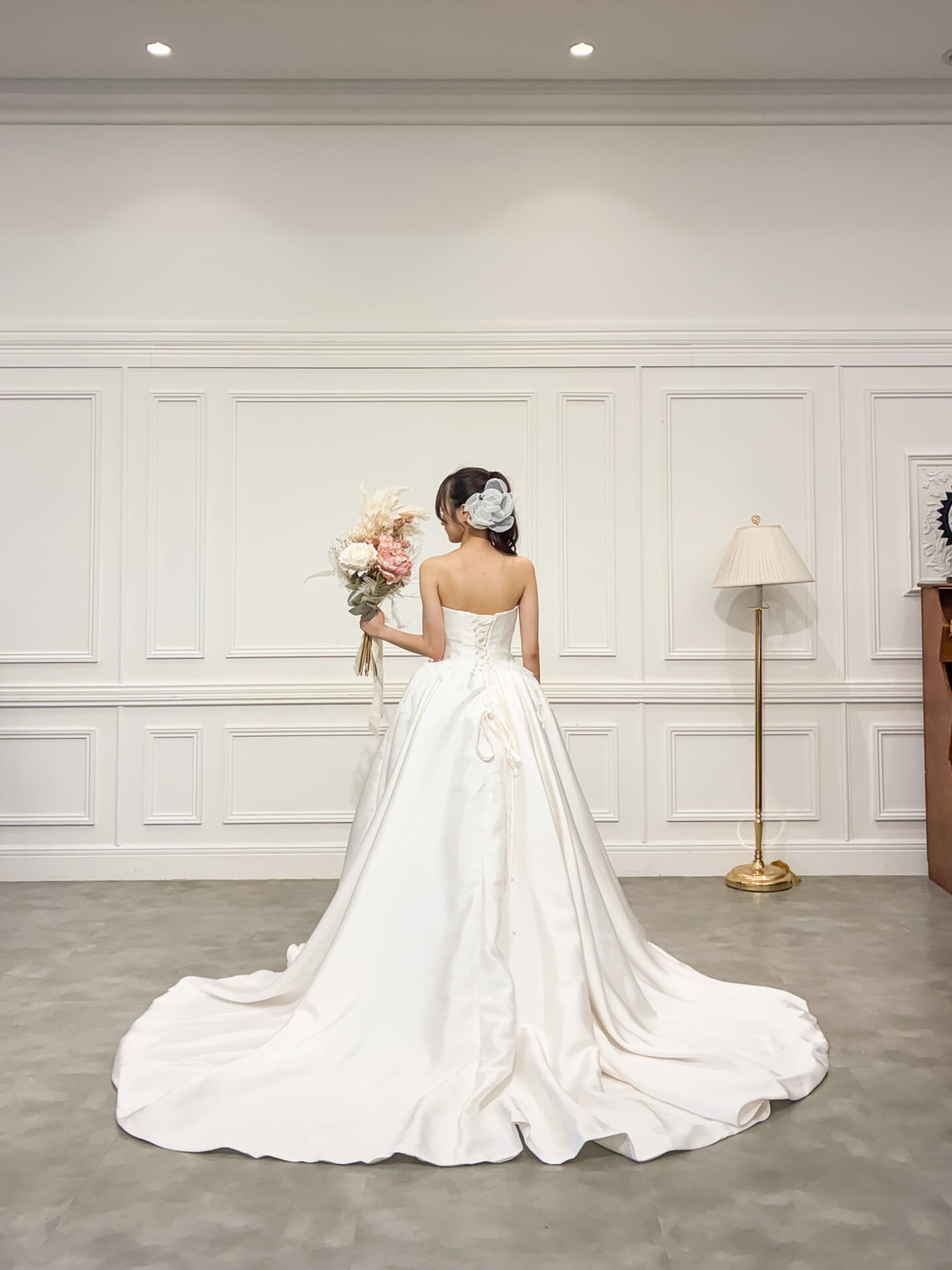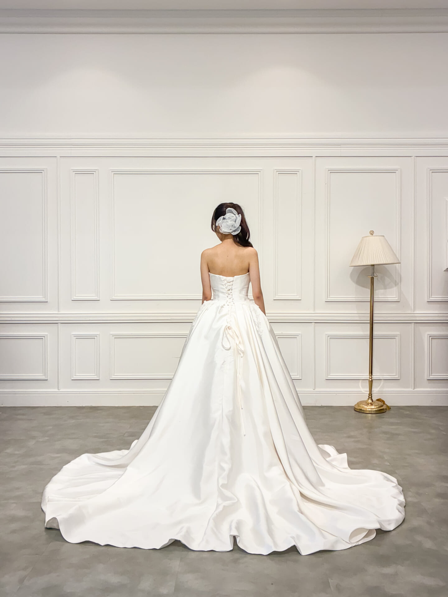トレーンは中程度の長さで、チャペルやホテルウェディング、ゲストハウスなどさまざまな空間に対応。バージンロードを歩く瞬間や写真撮影でも、美しいドレープラインが印象に残る後ろ姿を叶えます。