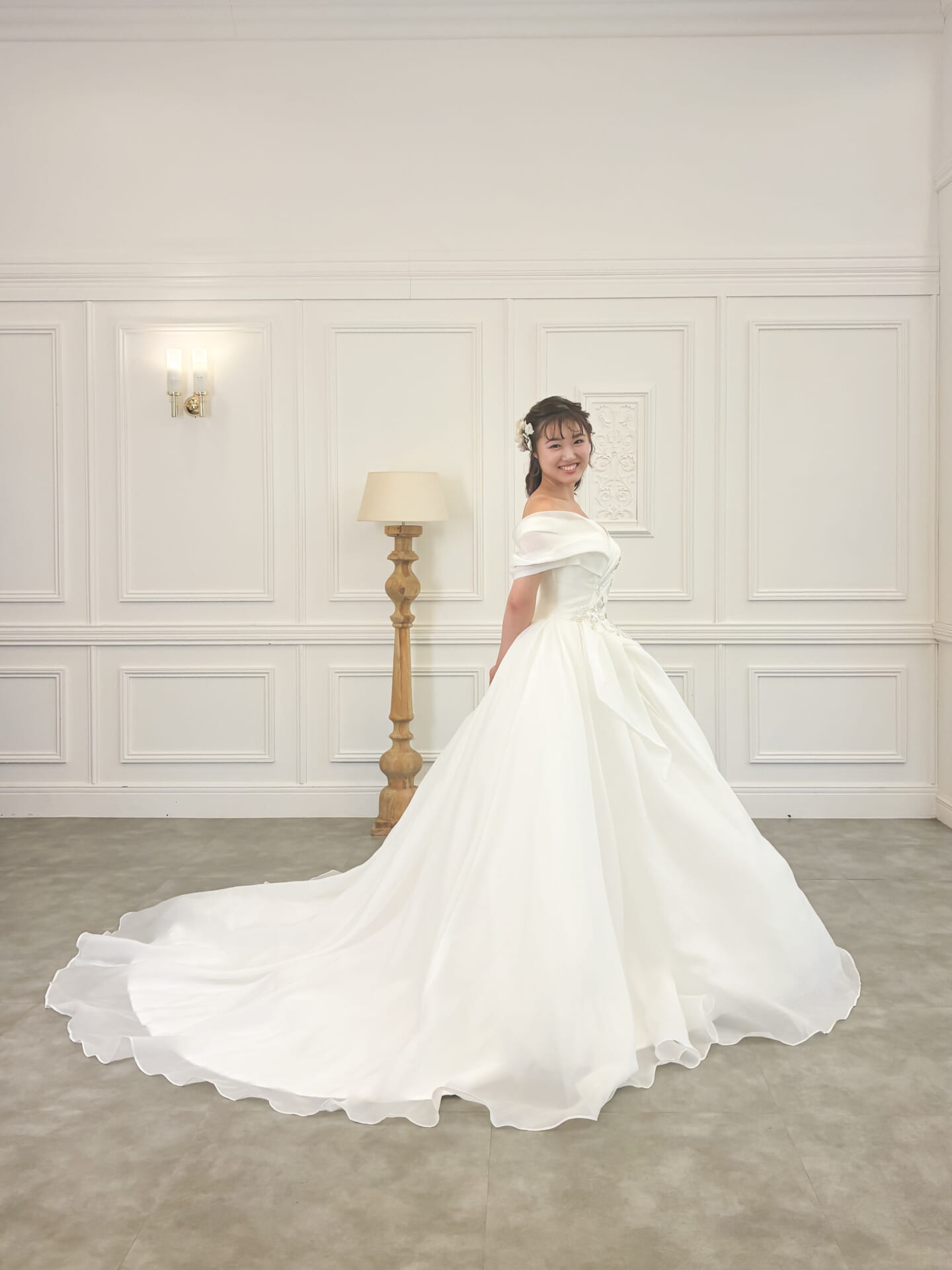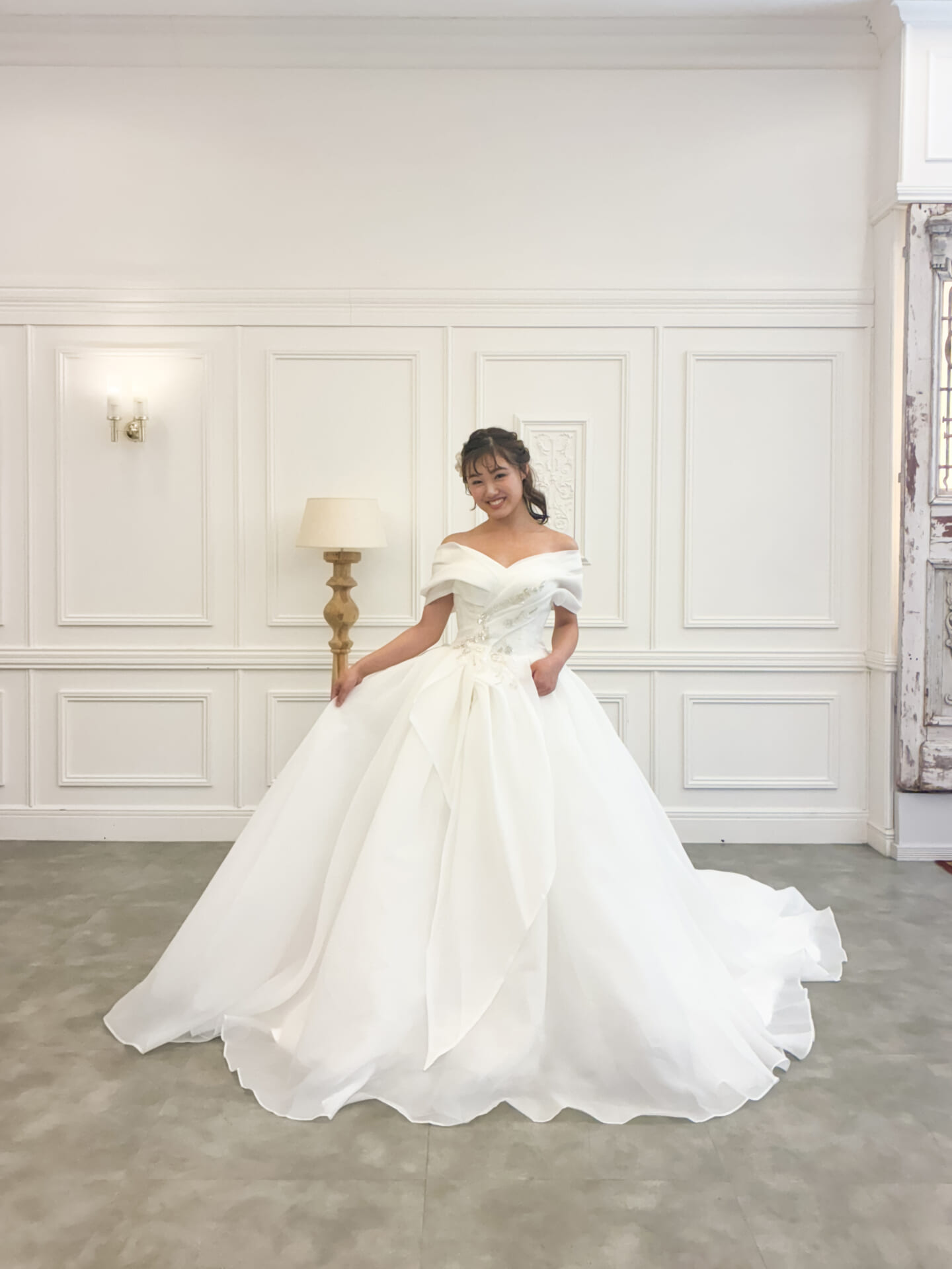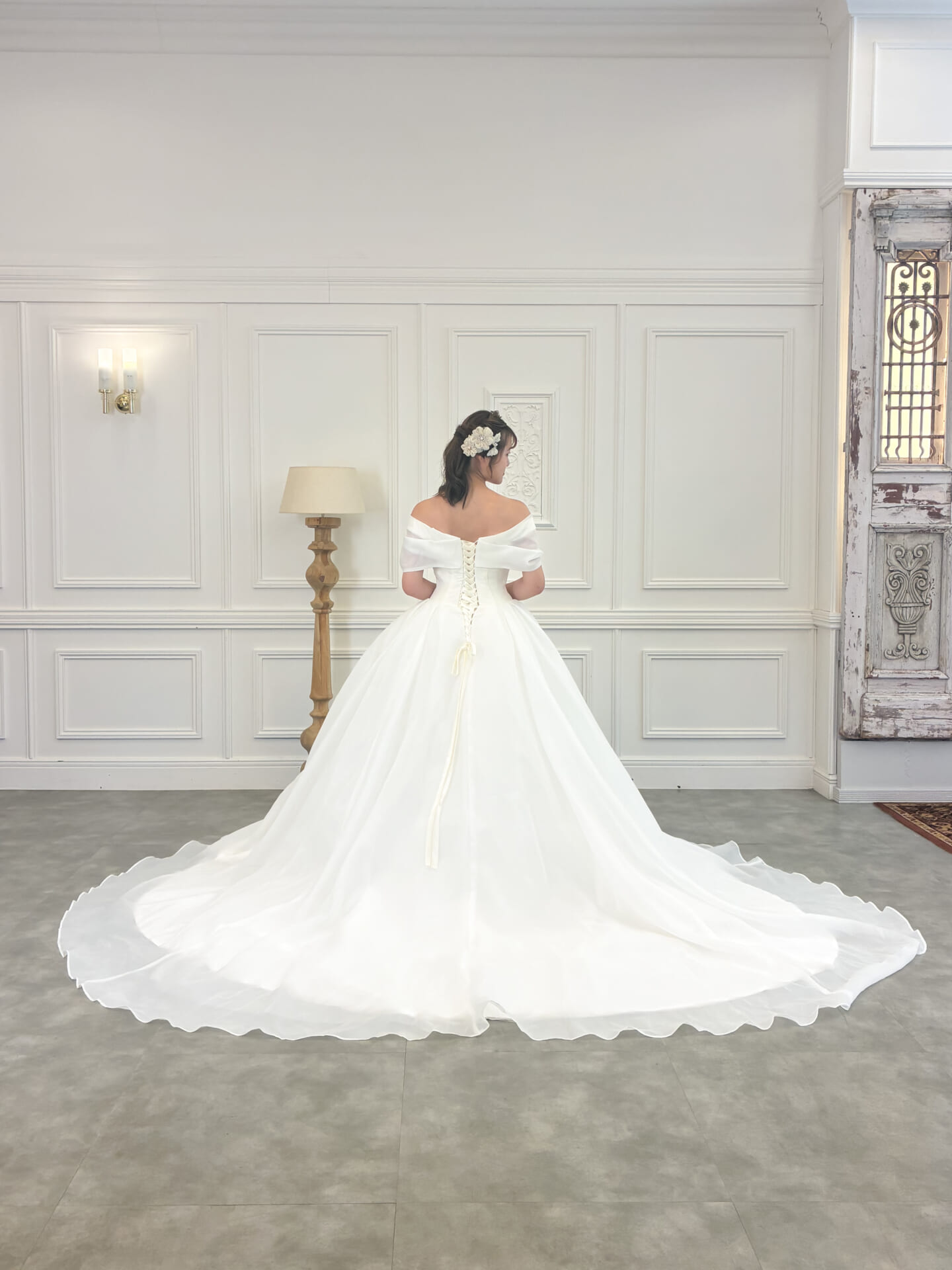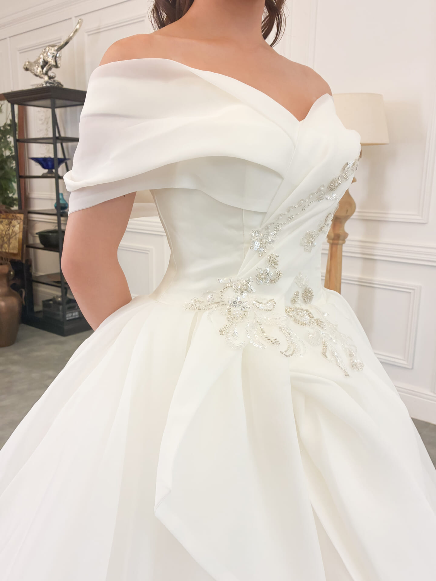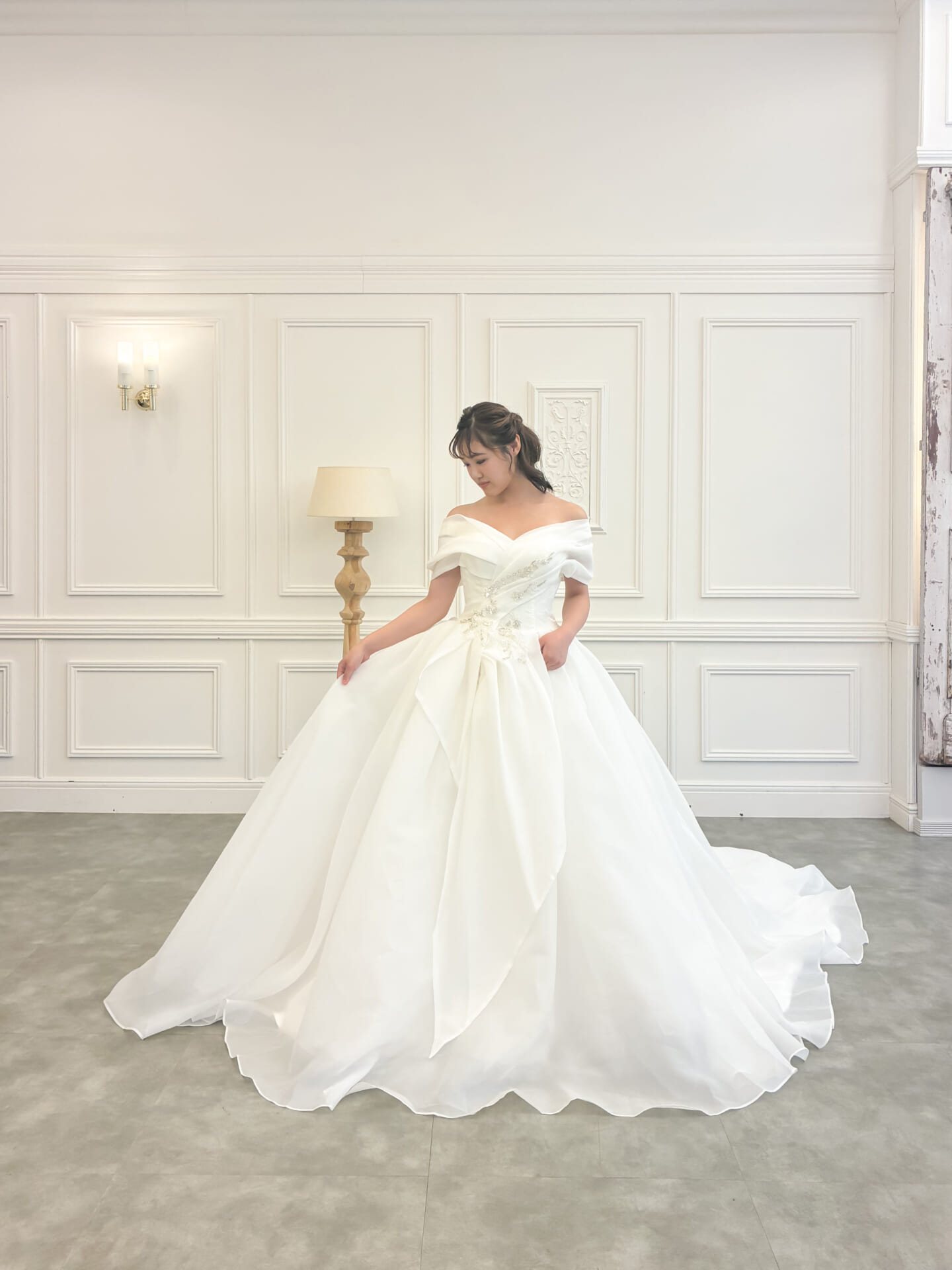 【Drina Dress】 肩を優しく包み込むオフショルダーデザインが印象的な、エレガントで華やかなAラインドレス。ほどよいボリューム感と柔らかな曲線を描くシルエットが、花嫁の美しさを引き立てます。