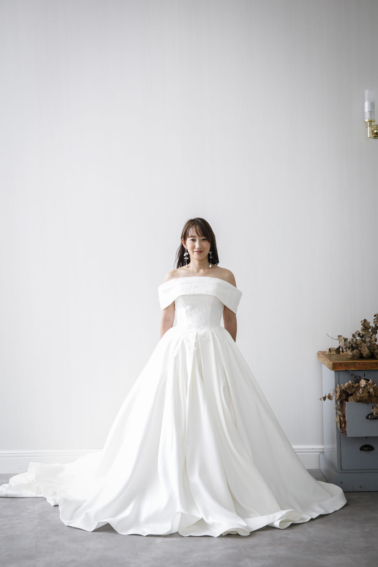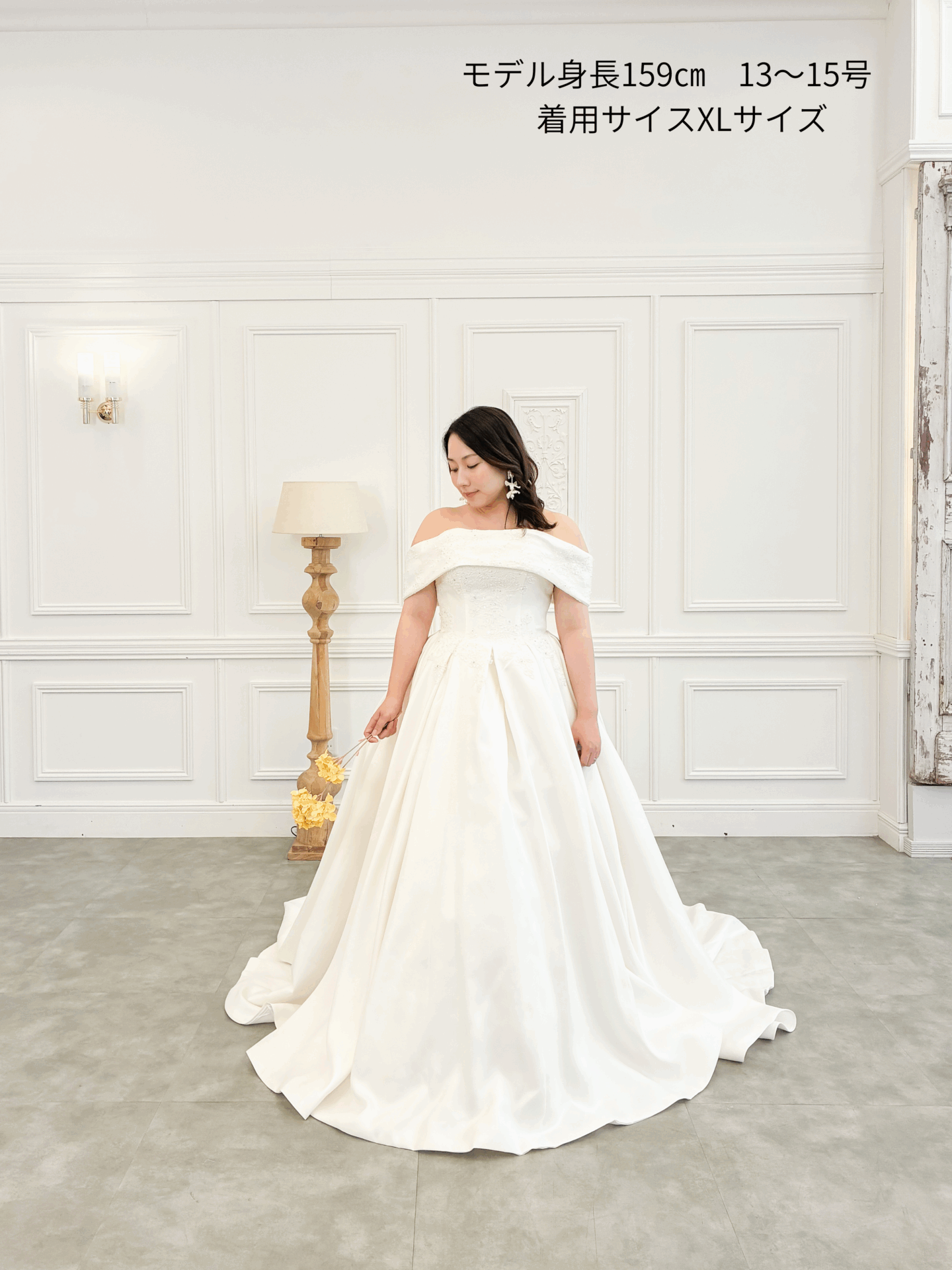 スカートはたっぷりとした分量感のプリンセスライン。張りのあるサテン生地がドレープを際立たせ、歩くたびに上品な揺れが生まれます。クラシカルなフォルムをベースにしつつ、素材やカッティングの美しさが、今らしい洗練された印象を加えています。