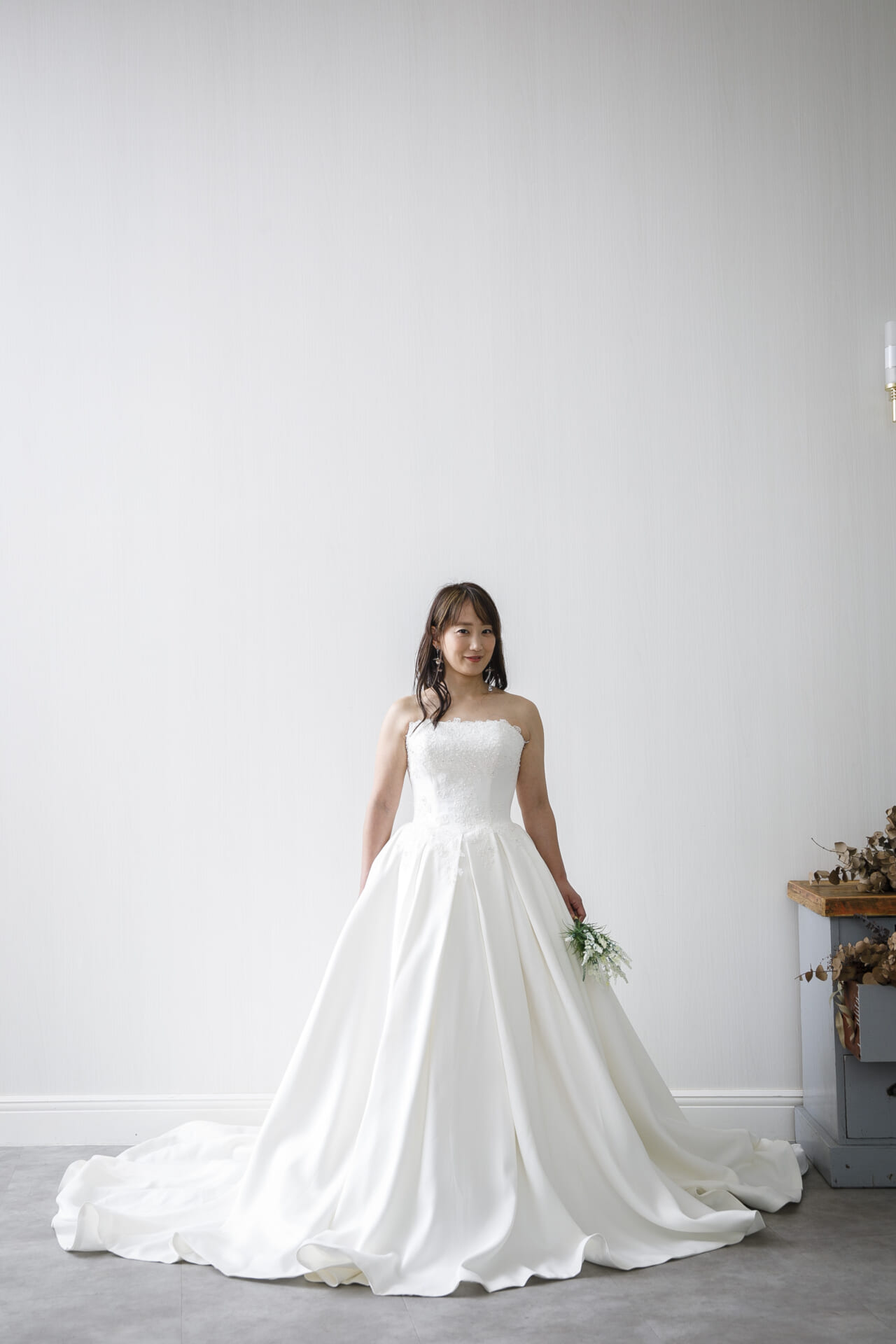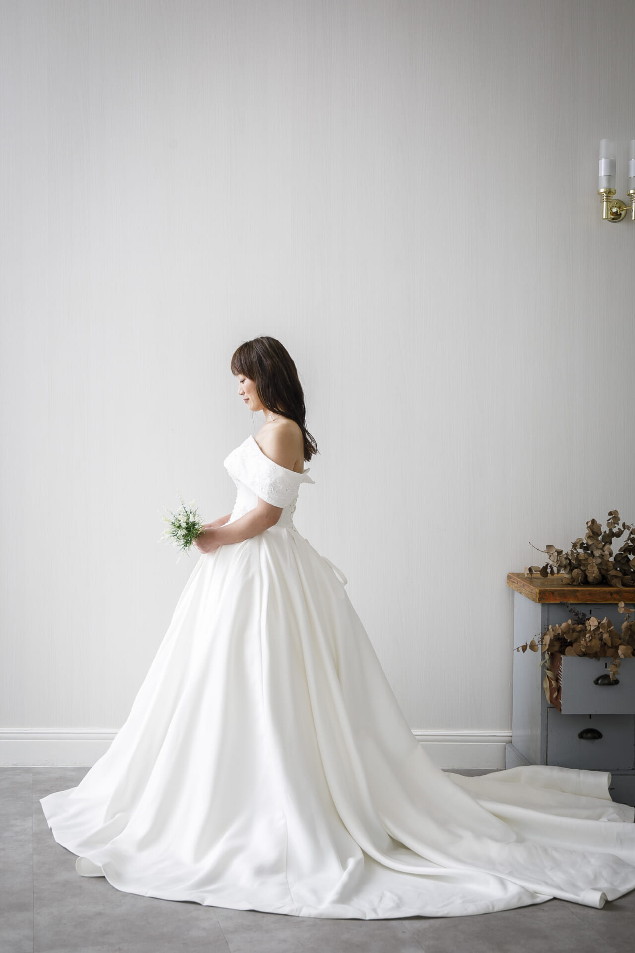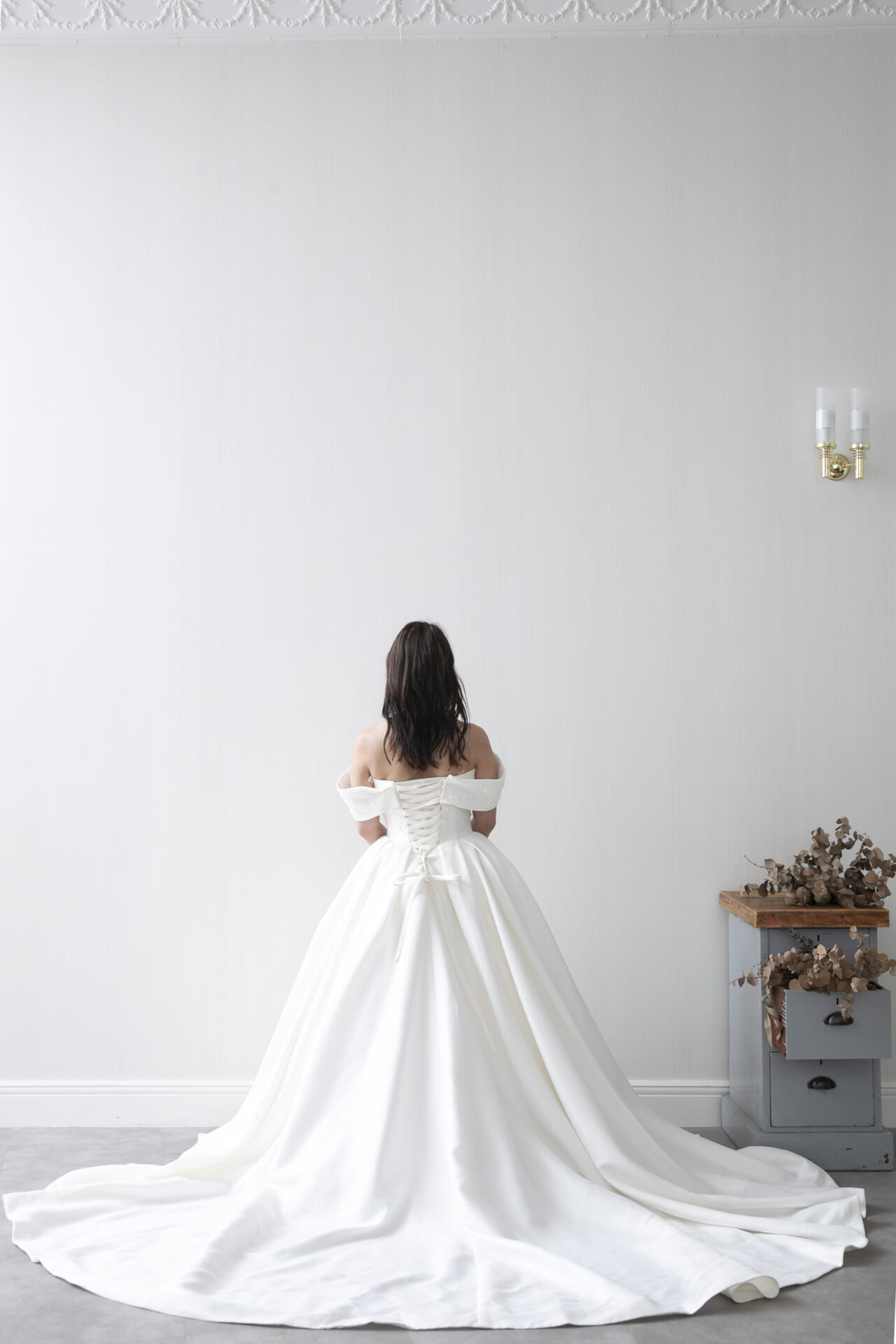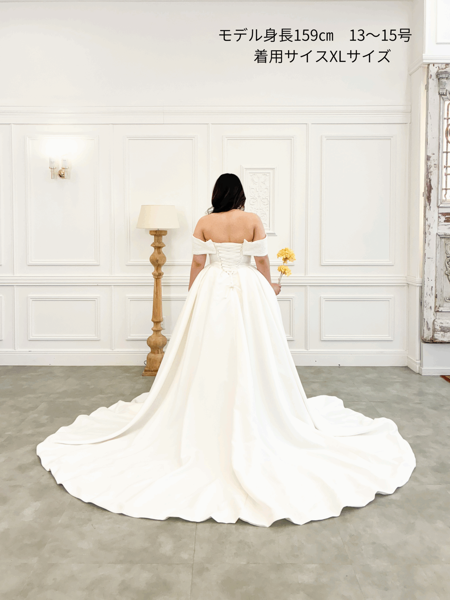 バックスタイルもふんわりと広がるトレーンで、写真映えや入場シーンにもぴったり。トレンドに左右されない上質感があり、チャペル、ホテル、ゲストハウスなどどのような空間にもマッチします。