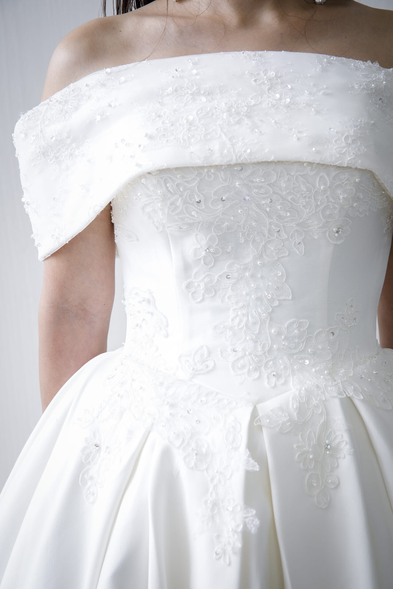 胸元はすっきりとしたビスチェスタイルに、立体感のあるオフショルダーを重ねたデザイン。肩まわりをやさしく包み込む折り返しのラインが、デコルテを美しく引き立て、エレガントな印象を際立たせます。このオフショルダーパーツは着脱が可能で、ビスチェ1本でも着用いただける2WAY仕様。挙式と披露宴で雰囲気を変えたり、体型や会場に合わせたアレンジが楽しめます。