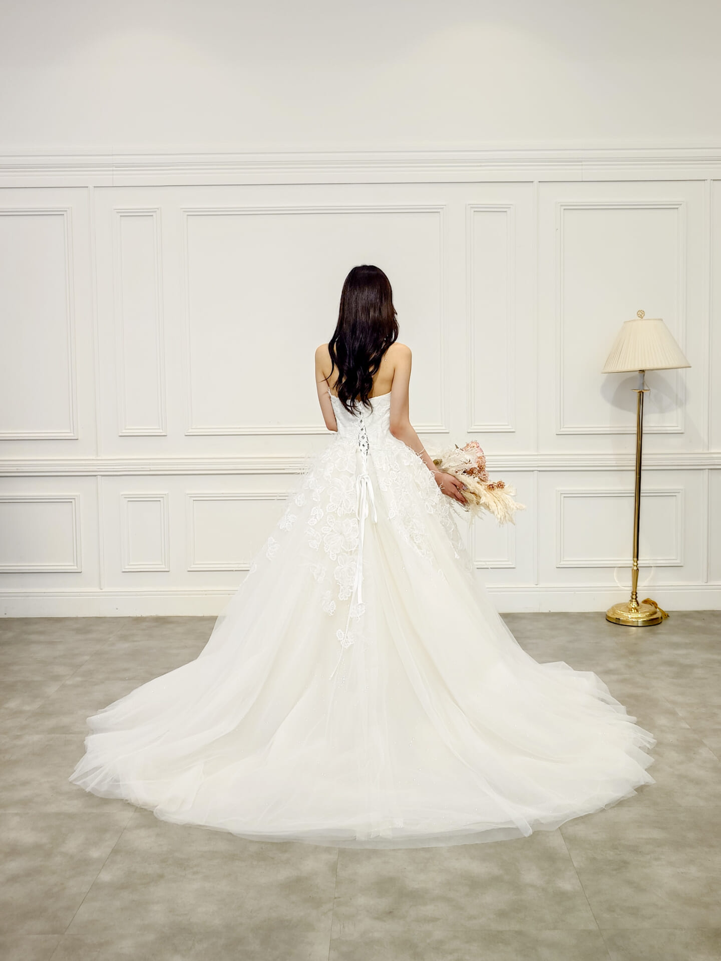 バックスタイルも華やかで、裾までしっかりと広がるトレーンが後ろ姿を印象的に演出。写真映えはもちろん、入場シーンでもゲストの視線を集めるドラマティックな佇まいを叶えてくれます。