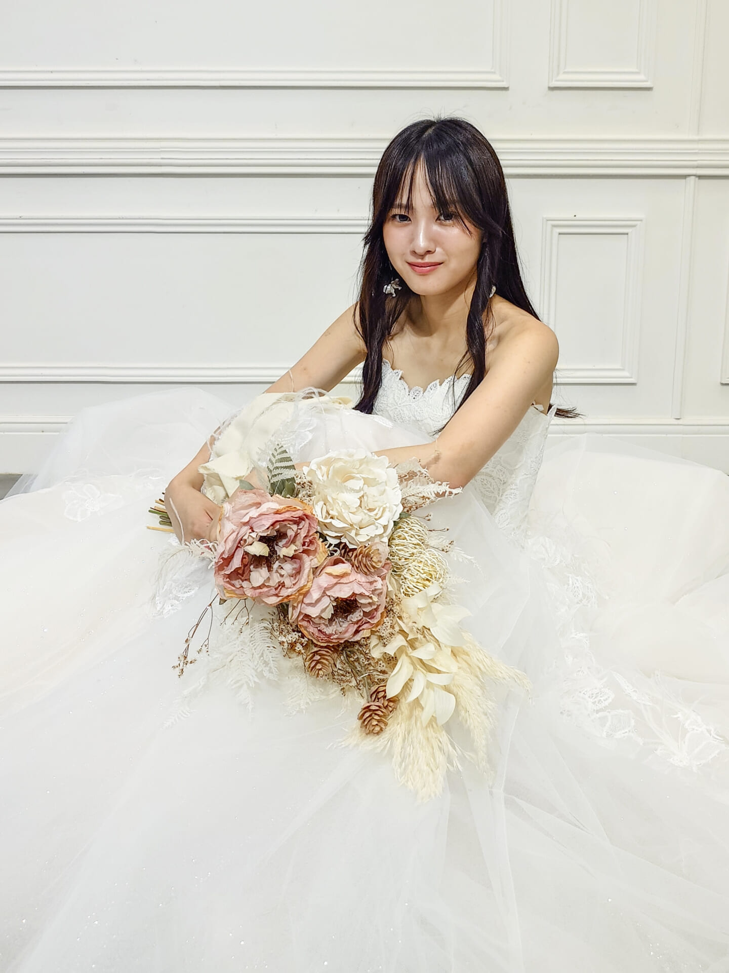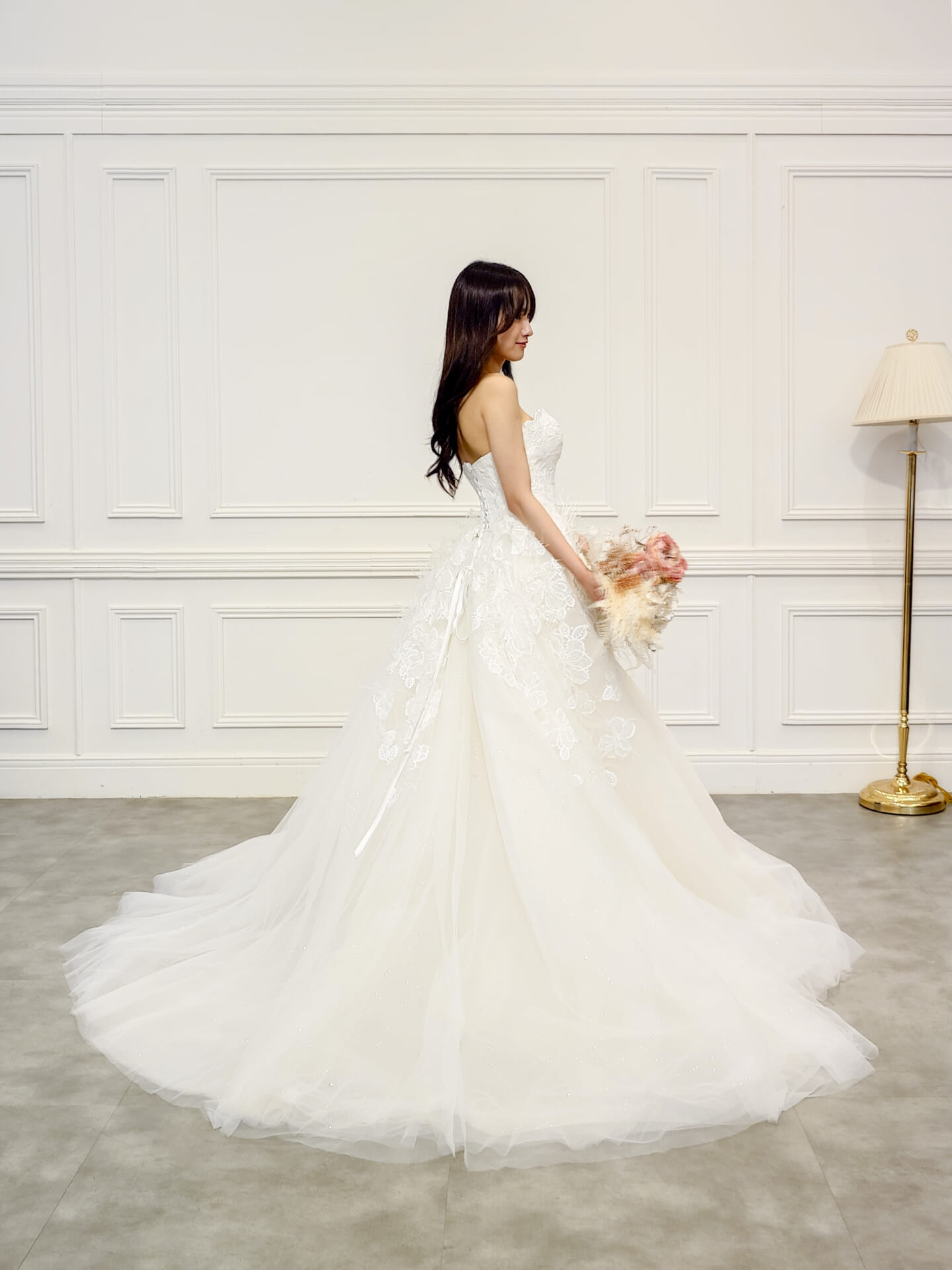 スカート全体には、立体感のあるフラワーレースモチーフが丁寧に配置され、奥行きのある美しさを表現。光を受けてほんのり浮かび上がるレースの陰影が、花嫁の存在感をよりいっそう高めてくれます。