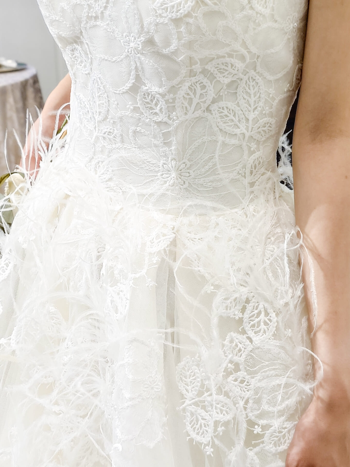 ビスチェ部分には、立体的なレースモチーフに加え、ふわふわと揺れる繊細なフェザーをあしらったデザインが印象的。まるで羽のようにやさしく揺れるフェザーが、動きのある表情を添え、フェミニンな華やかさを演出します。胸元はすっきりとしたハートカットで、デコルテを美しく見せてくれるのもポイントです。
