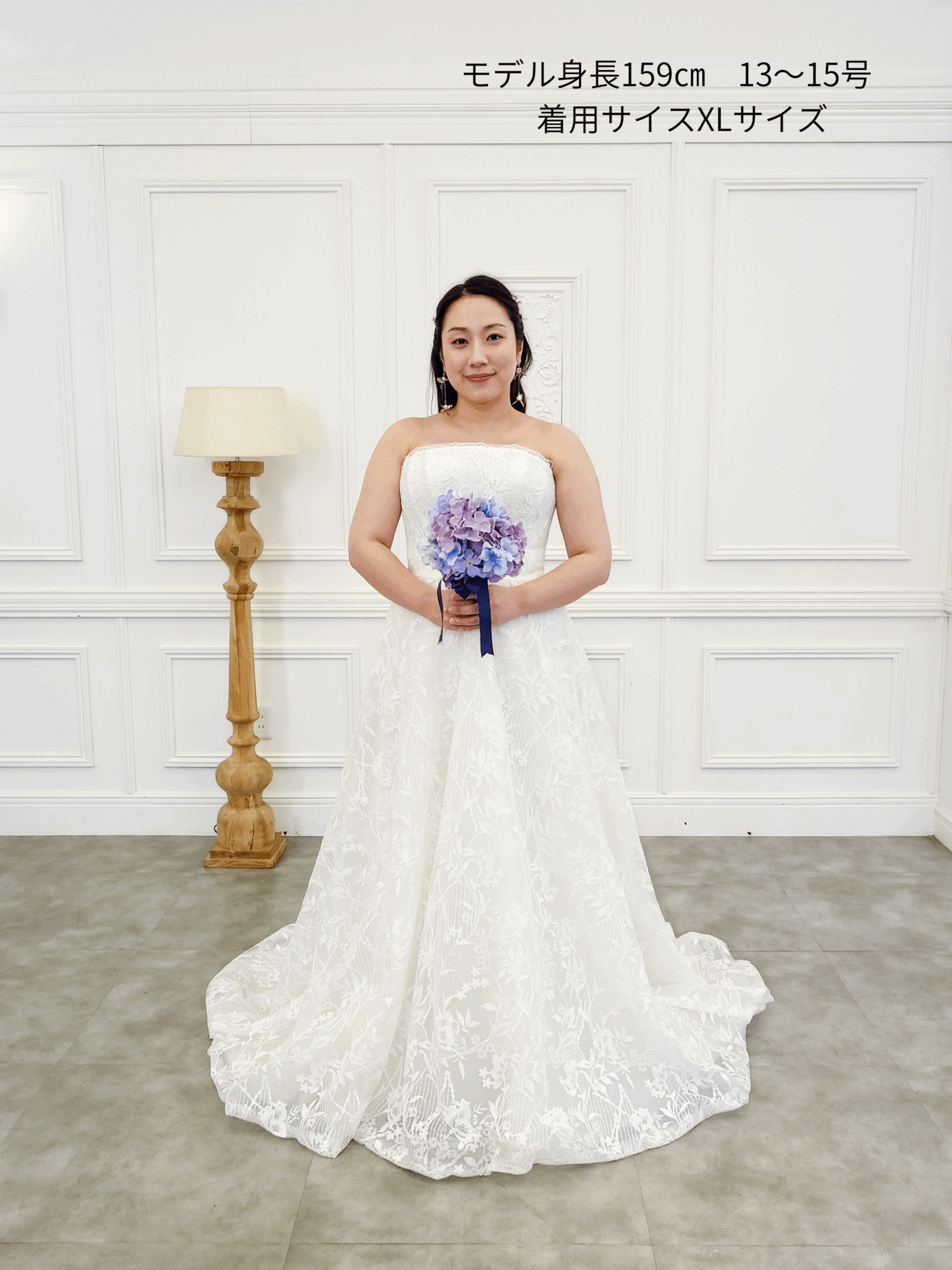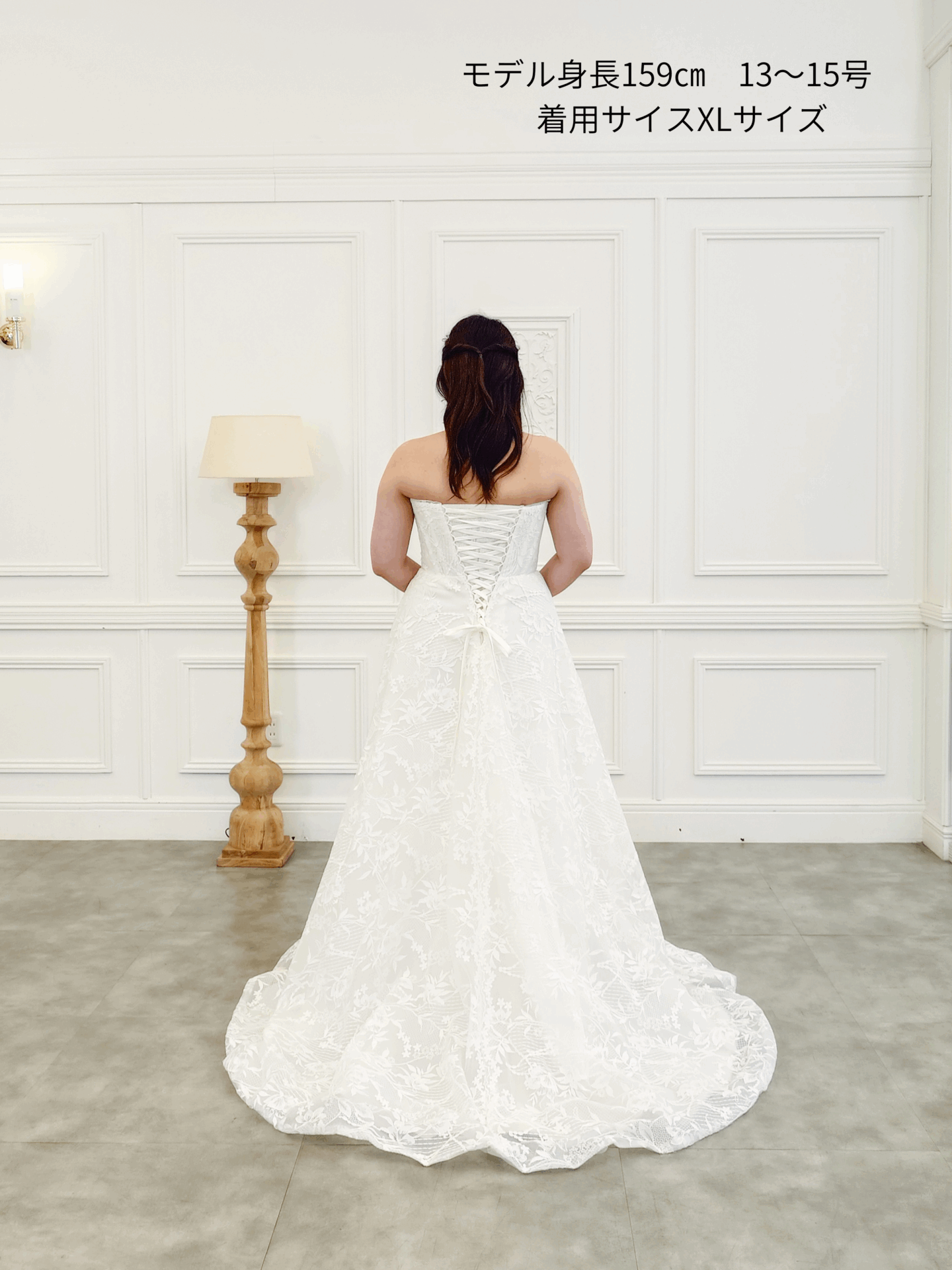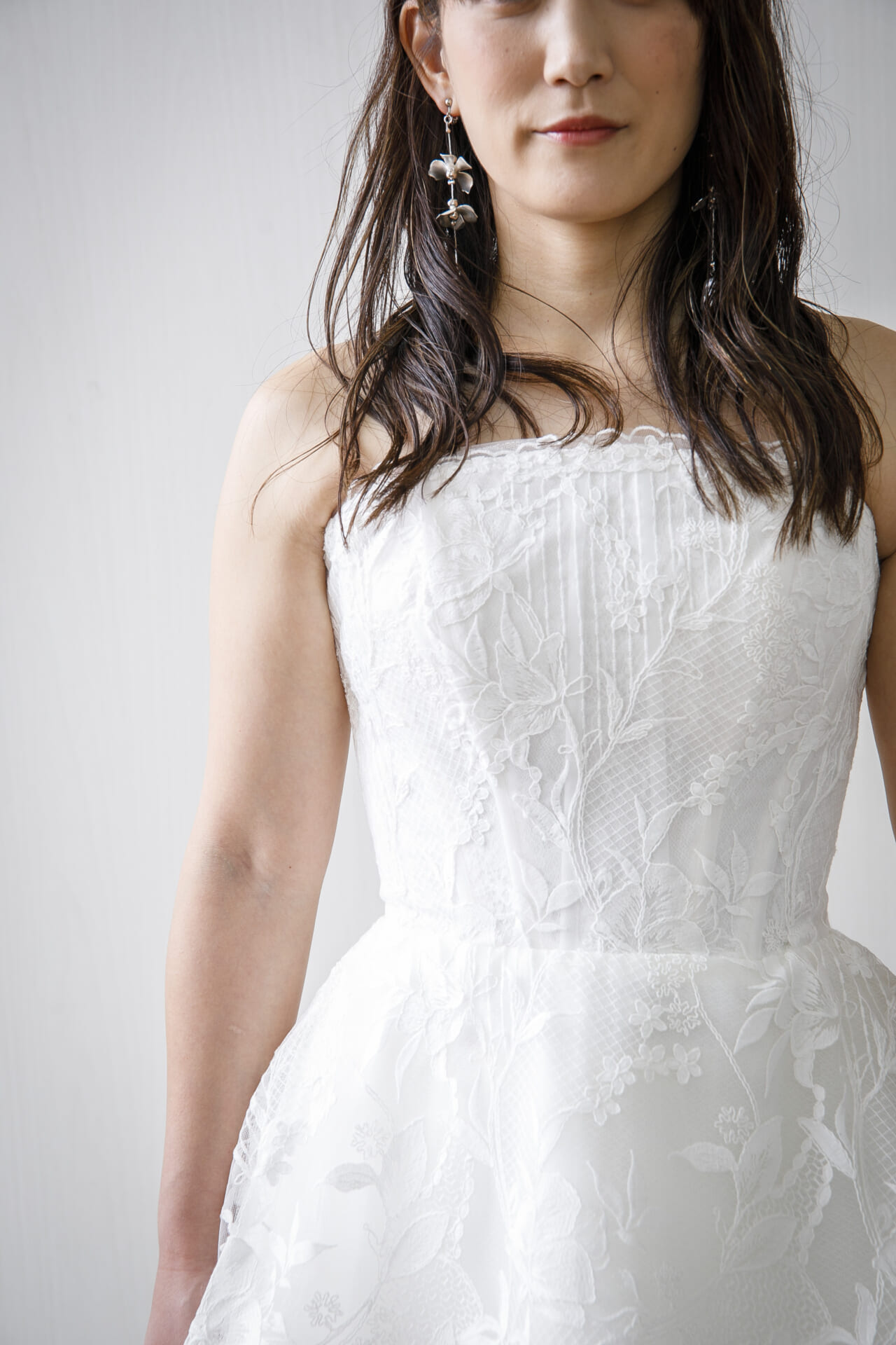 胸元は直線的なカッティングのビスチェスタイル。デコルテをすっきりと見せ、上半身をコンパクトに引き締めて見せてくれるデザインです。レース越しに見える肌がほんのりと透け、ナチュラルな抜け感を添えながらも、きちんと感はしっかりキープ。落ち着いた印象と現代的な洗練を併せ持っています。