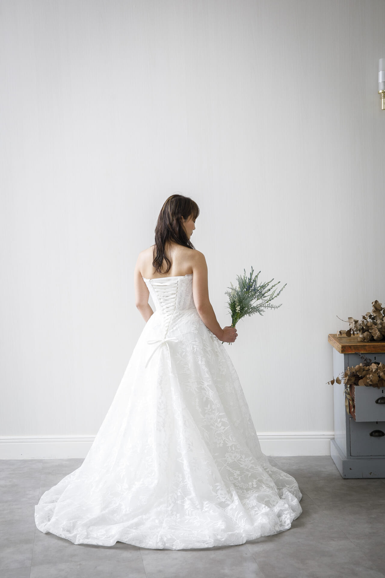 背面はすっきりと開かれており、ほどよい長さのトレーンが後ろ姿に気品を添えてくれます。装飾を抑えたミニマルなデザインだからこそ、シルエットや素材の美しさが際立ち、バージンロードや撮影シーンでもしっかりと映えるドレスです。