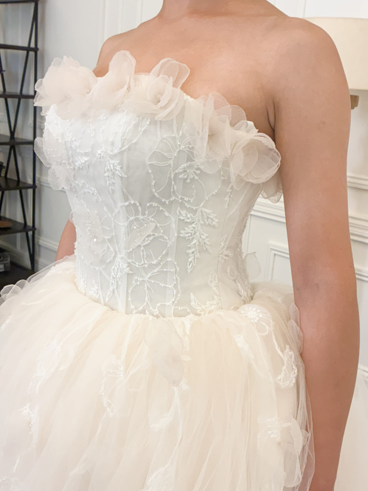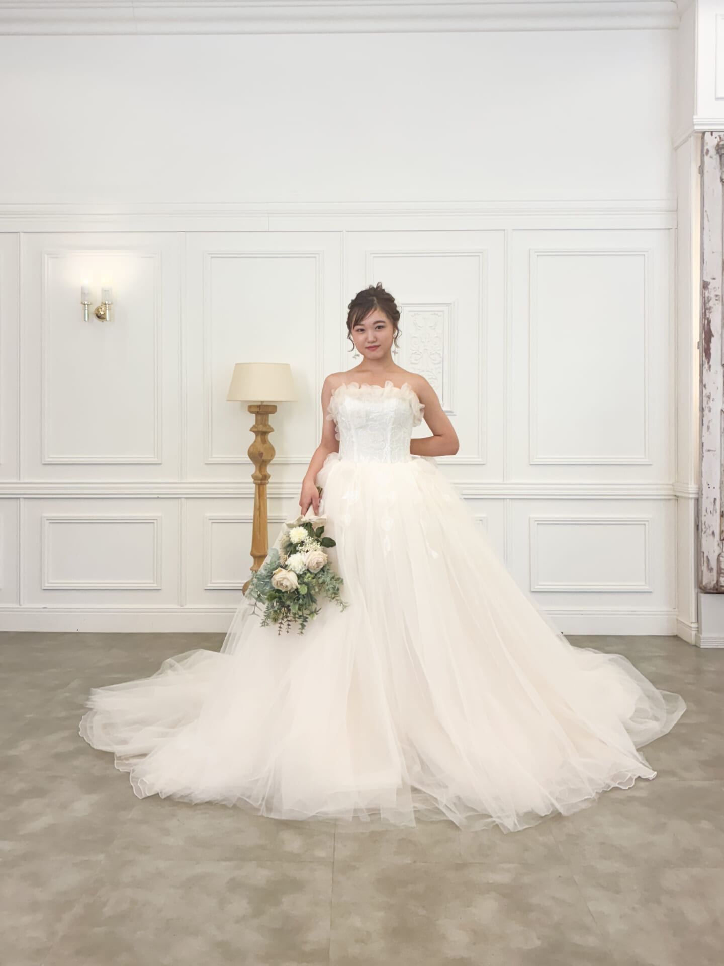 胸元には、花びらのような立体モチーフが並び、まるでドレスに咲いた可憐な花のよう。ビスチェ部分には繊細なレースと刺繍があしらわれており、透明感のあるピンクベージュの色味が柔らかなチュールと重なって、洗練された雰囲気を演出します。まさに“童話のプリンセス”を彷彿とさせる、夢見心地の一着です。
