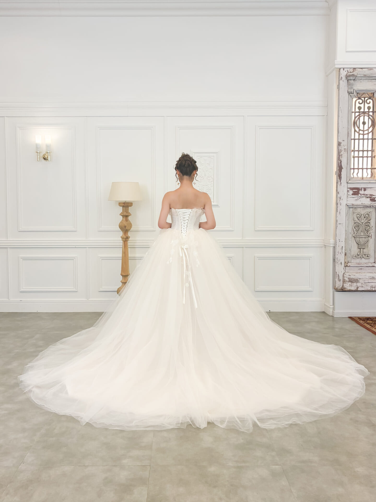 ボリュームたっぷりのスカートは、広いバージンロードやチャペルとの相性も抜群。後ろ姿も抜かりなく美しく、バックスタイルのふんわりと広がるトレーンが、入場シーンや写真撮影に華やかな印象を残します。