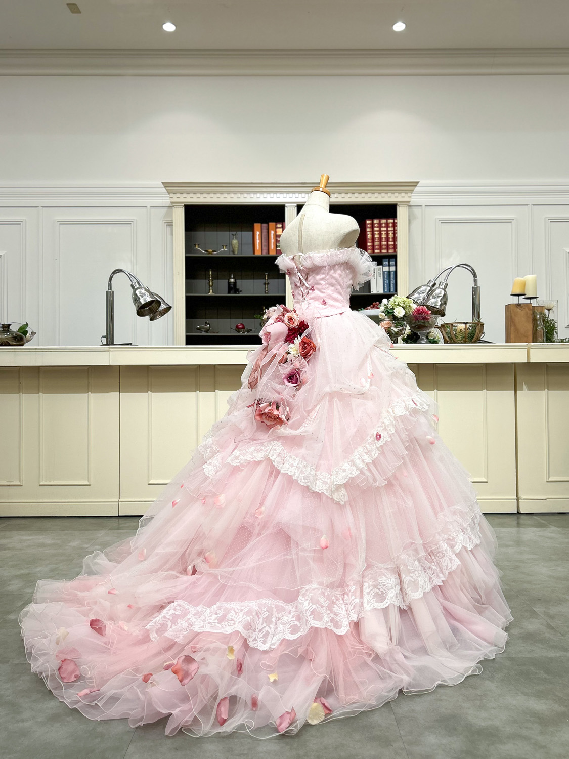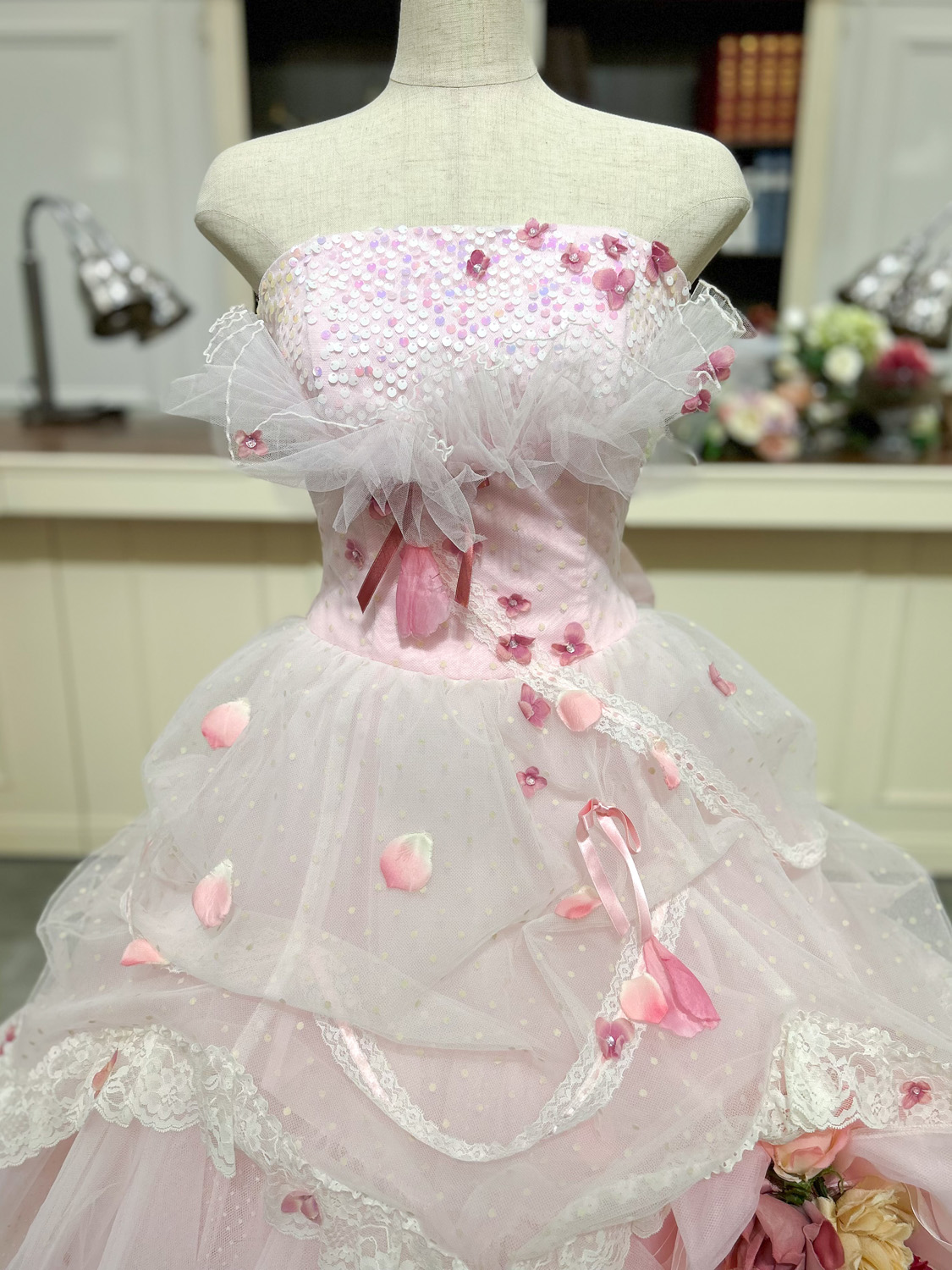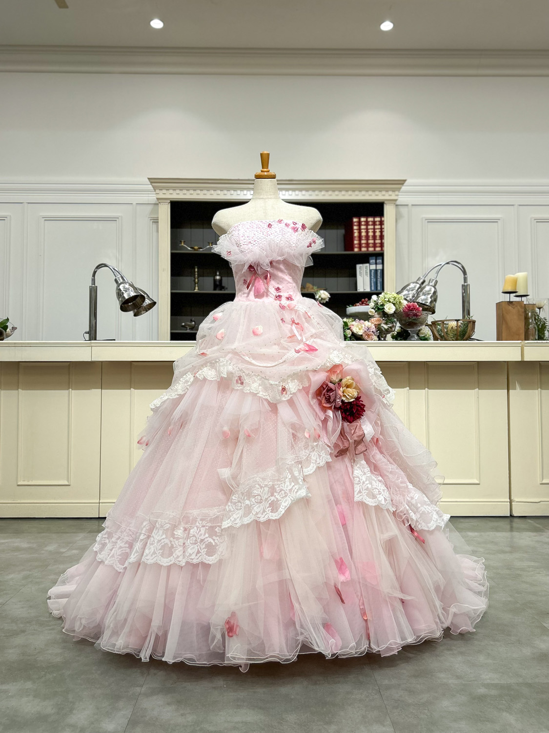 ふんわりとした淡いピンクに、レースとフリル、花びらが舞うロマンティックなカラードレス。