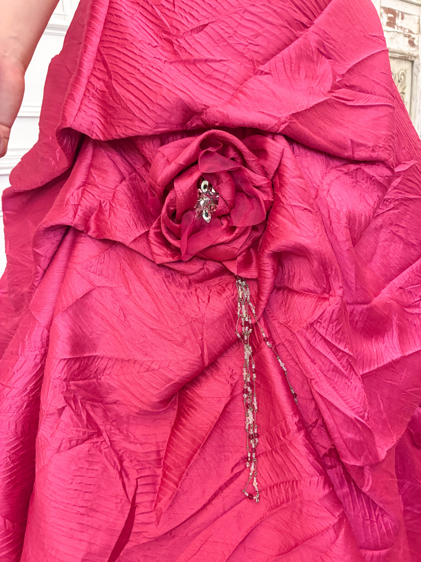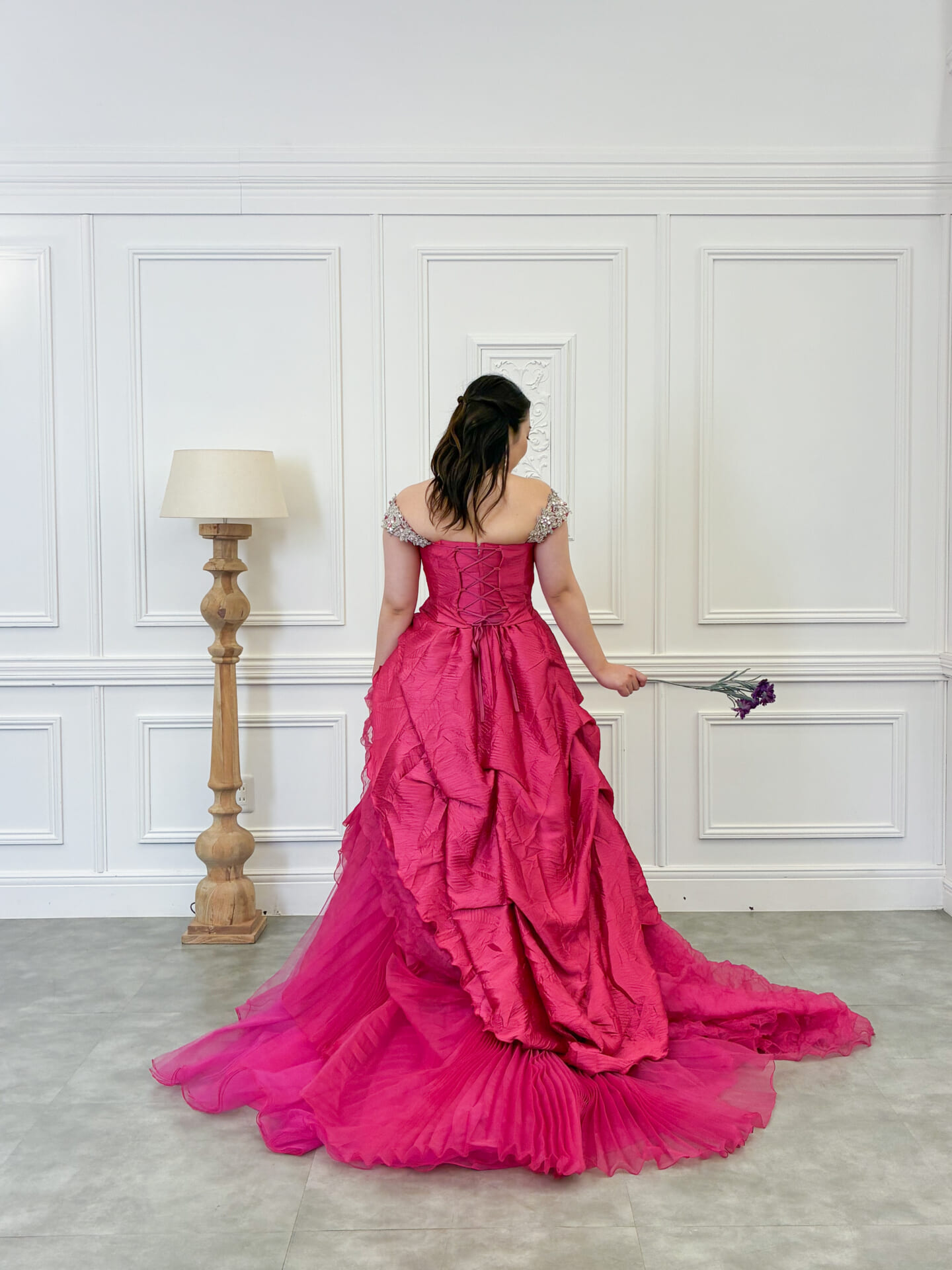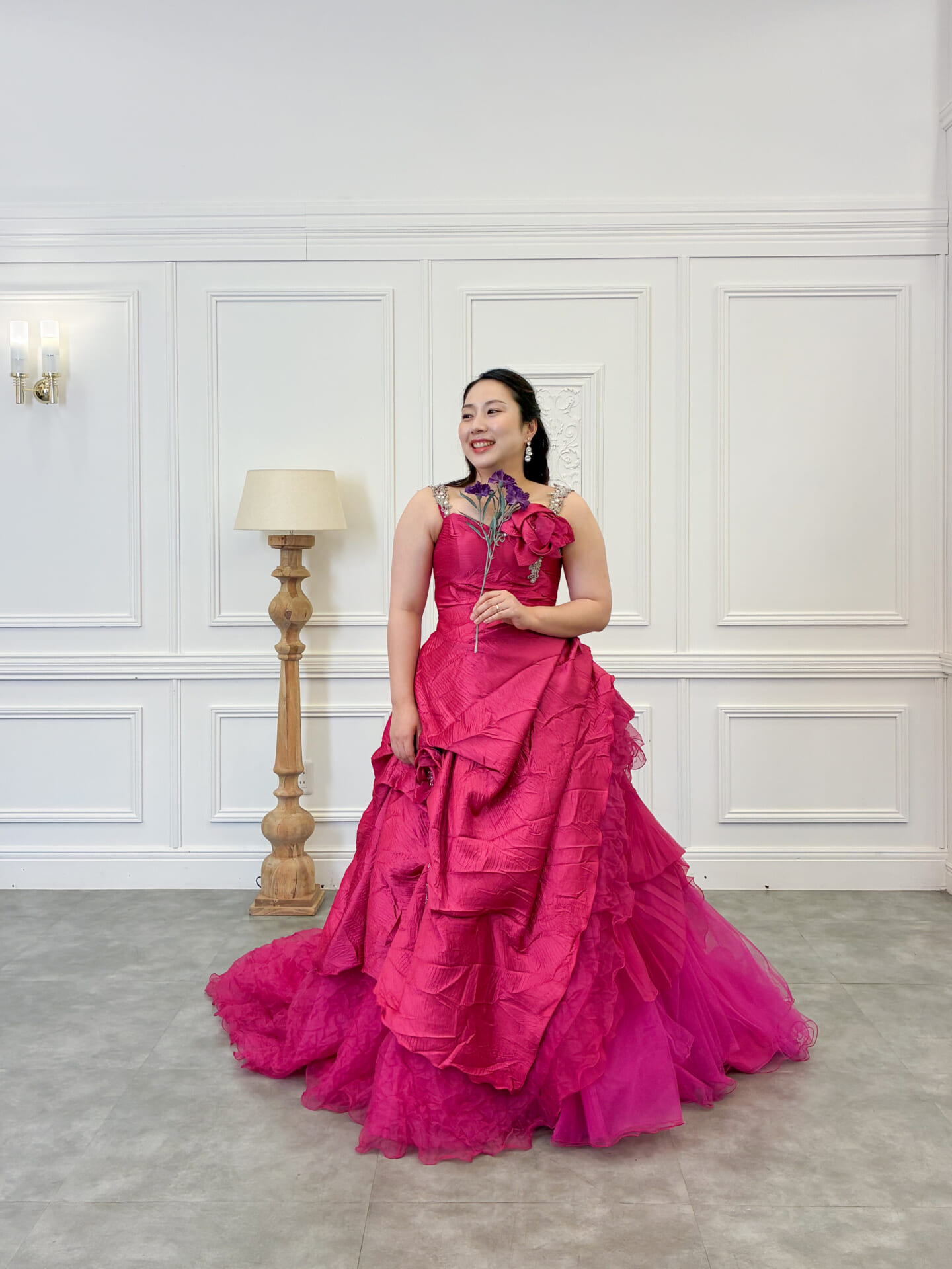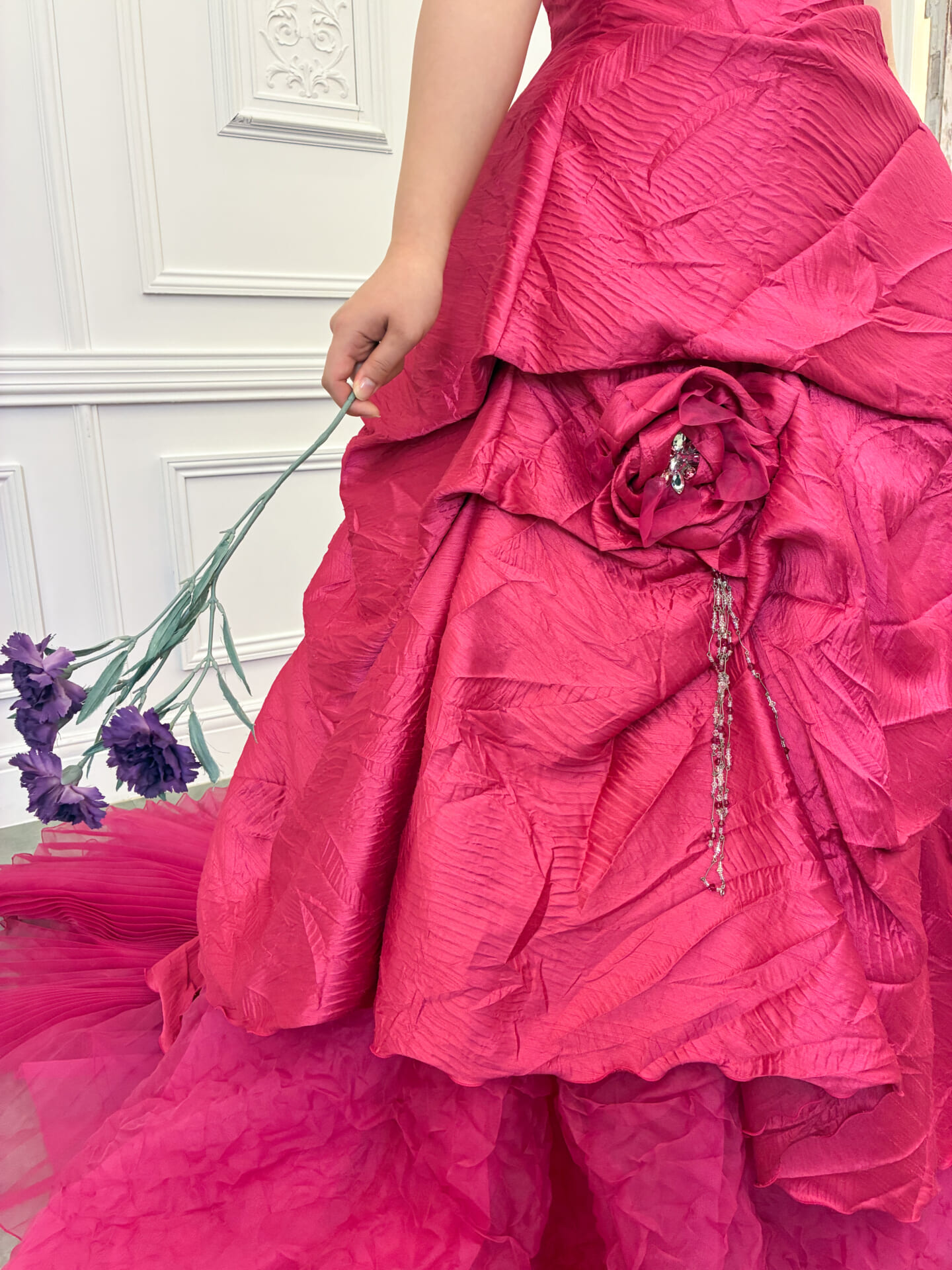 鮮やかなマゼンタカラーが目を引く、華やかで印象的なカラードレス。まるでバラの花びらを束ねたようなドラマティックなシルエットが、特別な日の主役感をさらに引き立ててくれる一着です。大胆な色使いと繊細なディテールが融合し、存在感と上品さを兼ね備えた仕上がりに。