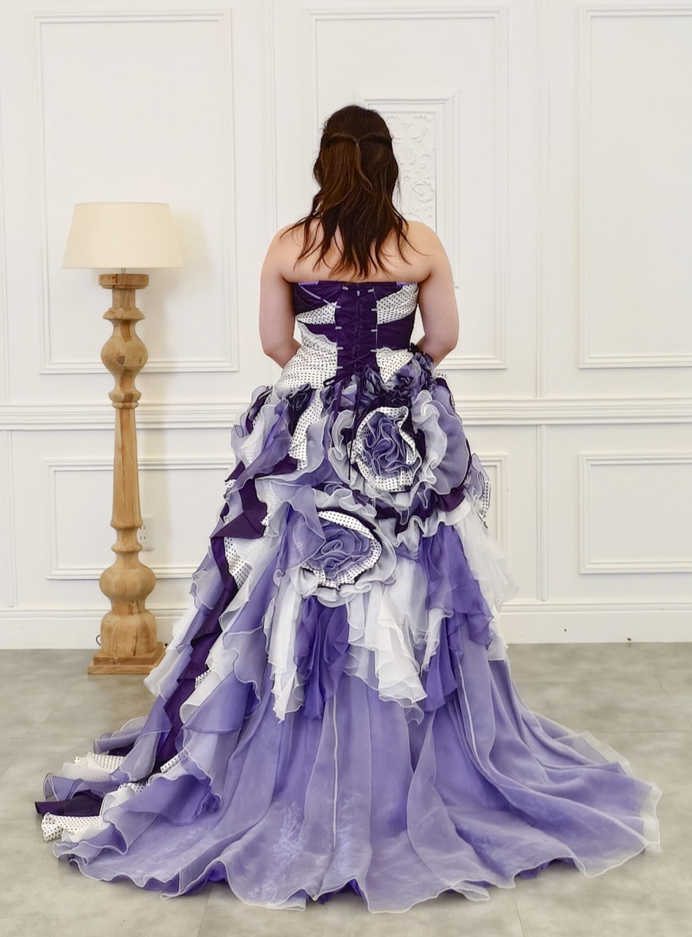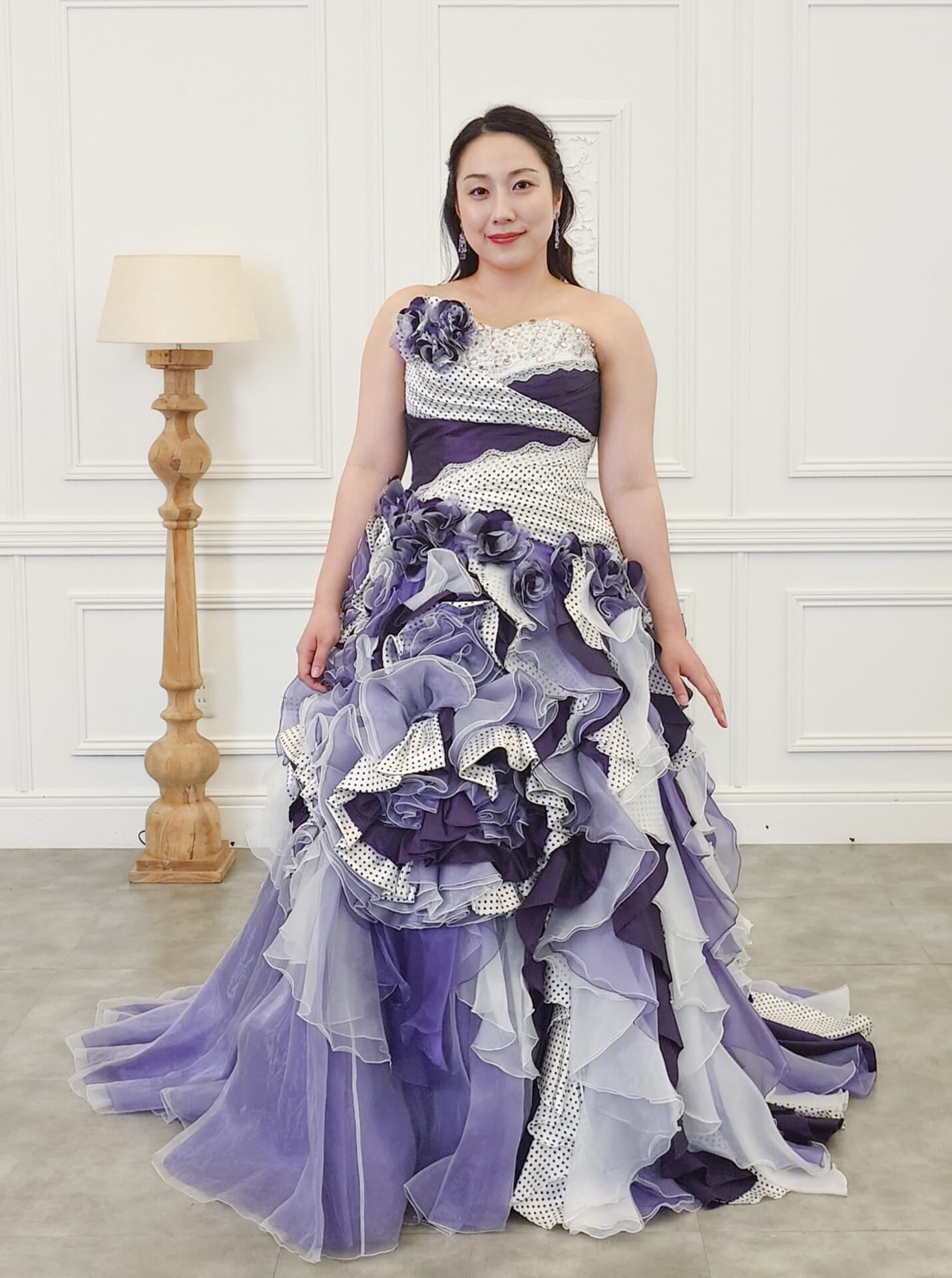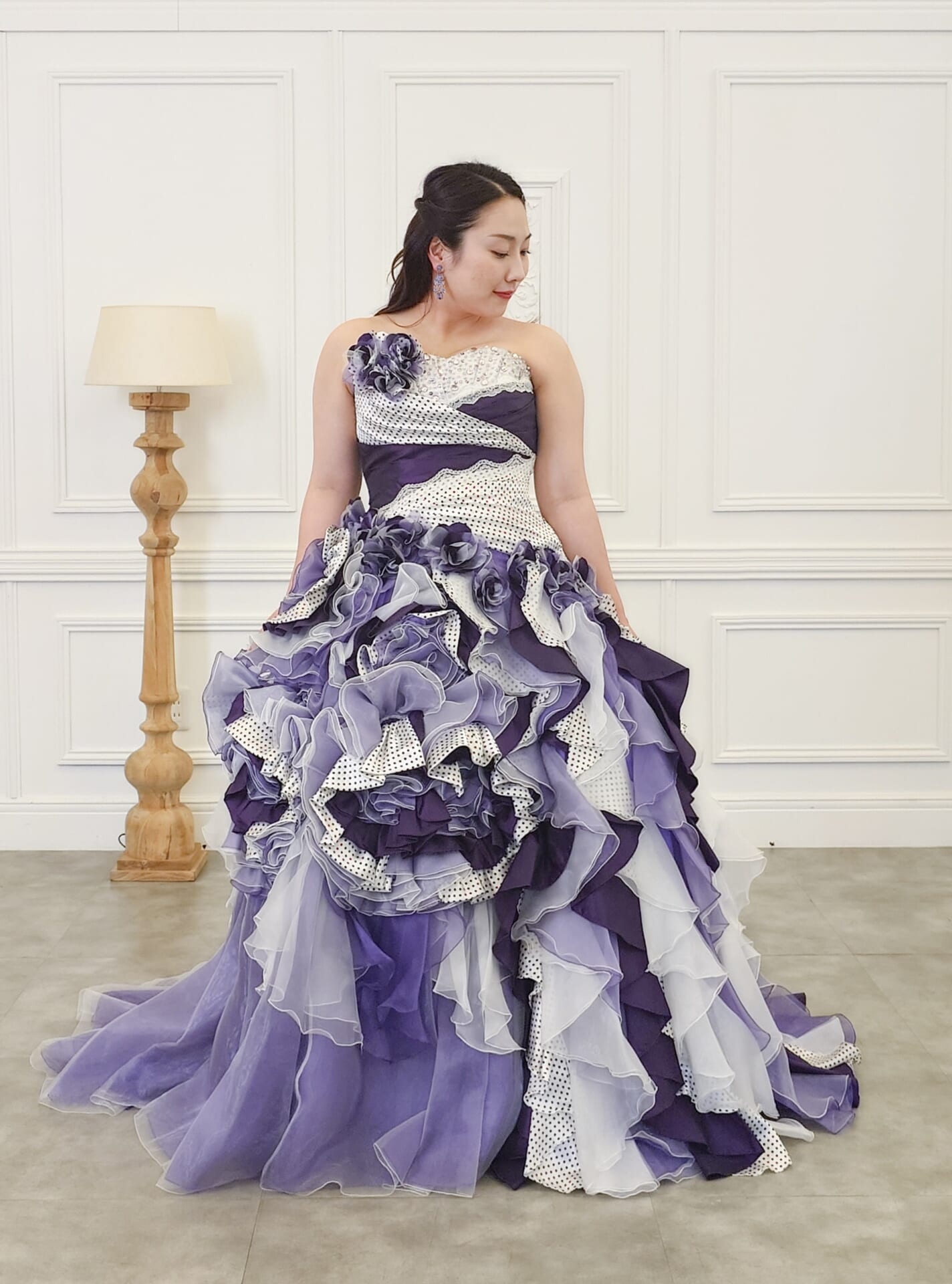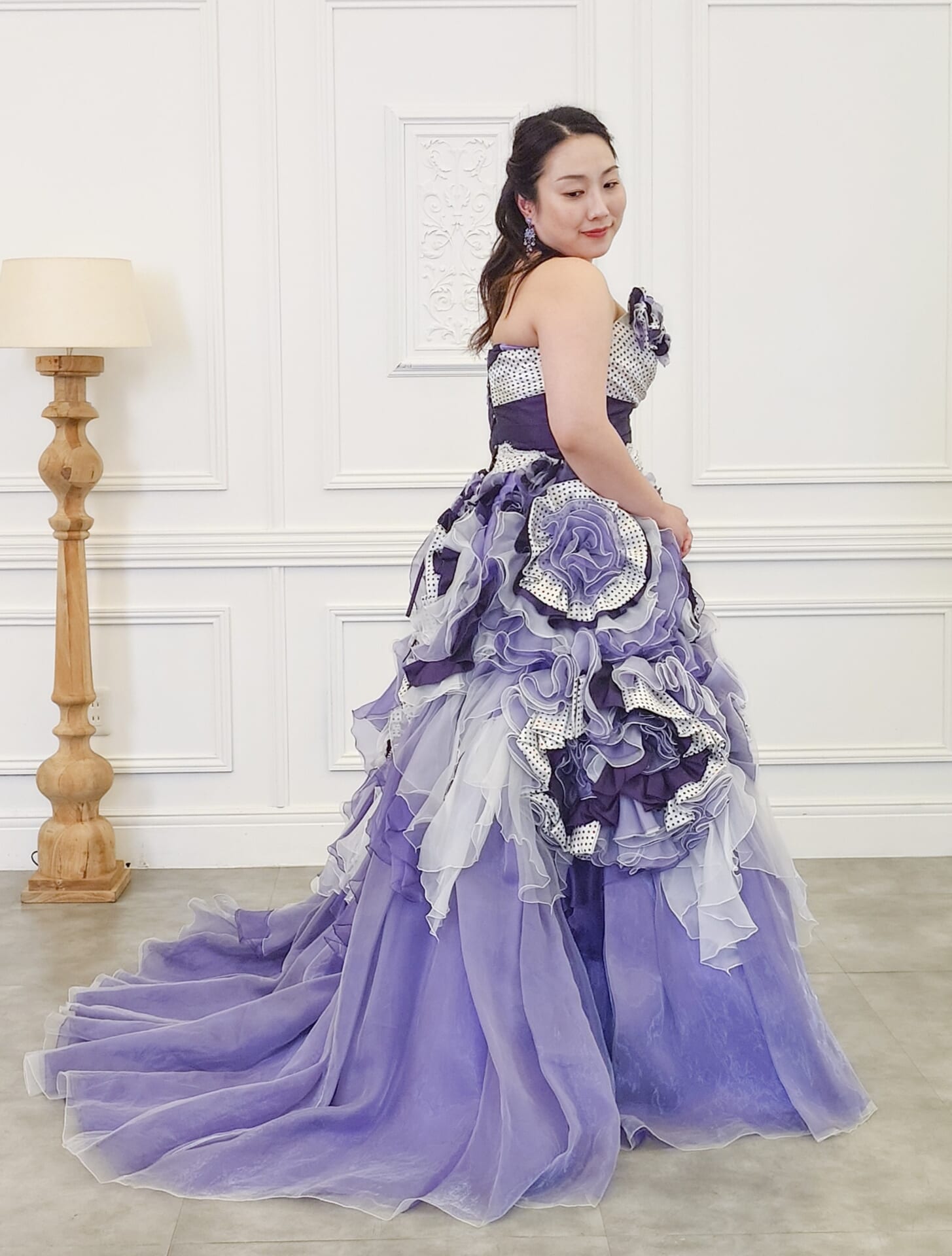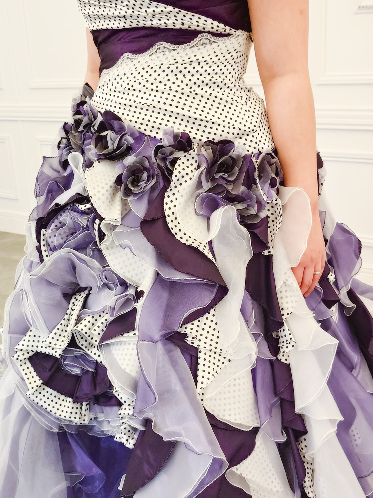 遊び心と個性が光る、ラベンダーとディープパープルを基調としたカラードレス。大胆なカラーブロックと立体的なフリルが目を惹き、特別な1日をさらに印象深く演出してくれる存在感抜群の一着です。
