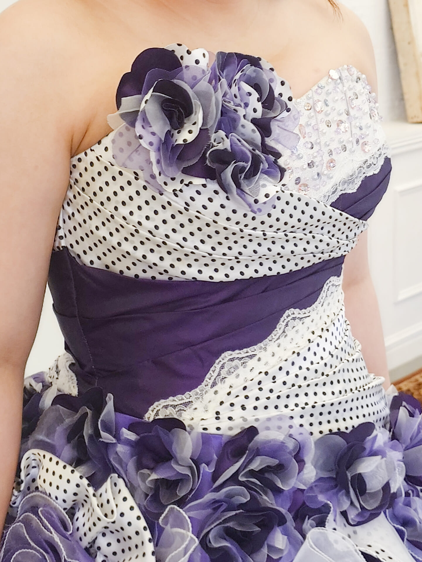 スカート部分には、ドレープやシフォンのフリルが複数重ねられ、まるで花びらが幾重にも重なったような華やかさ。シンプルな空間でも、このドレス一枚でシーンを華やかに彩る力を持っています。動くたびにふわりと揺れる軽やかな素材が、写真にも映える印象を残します。