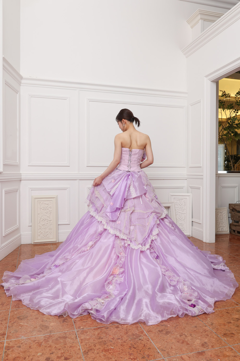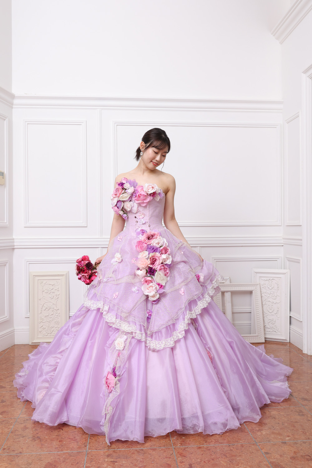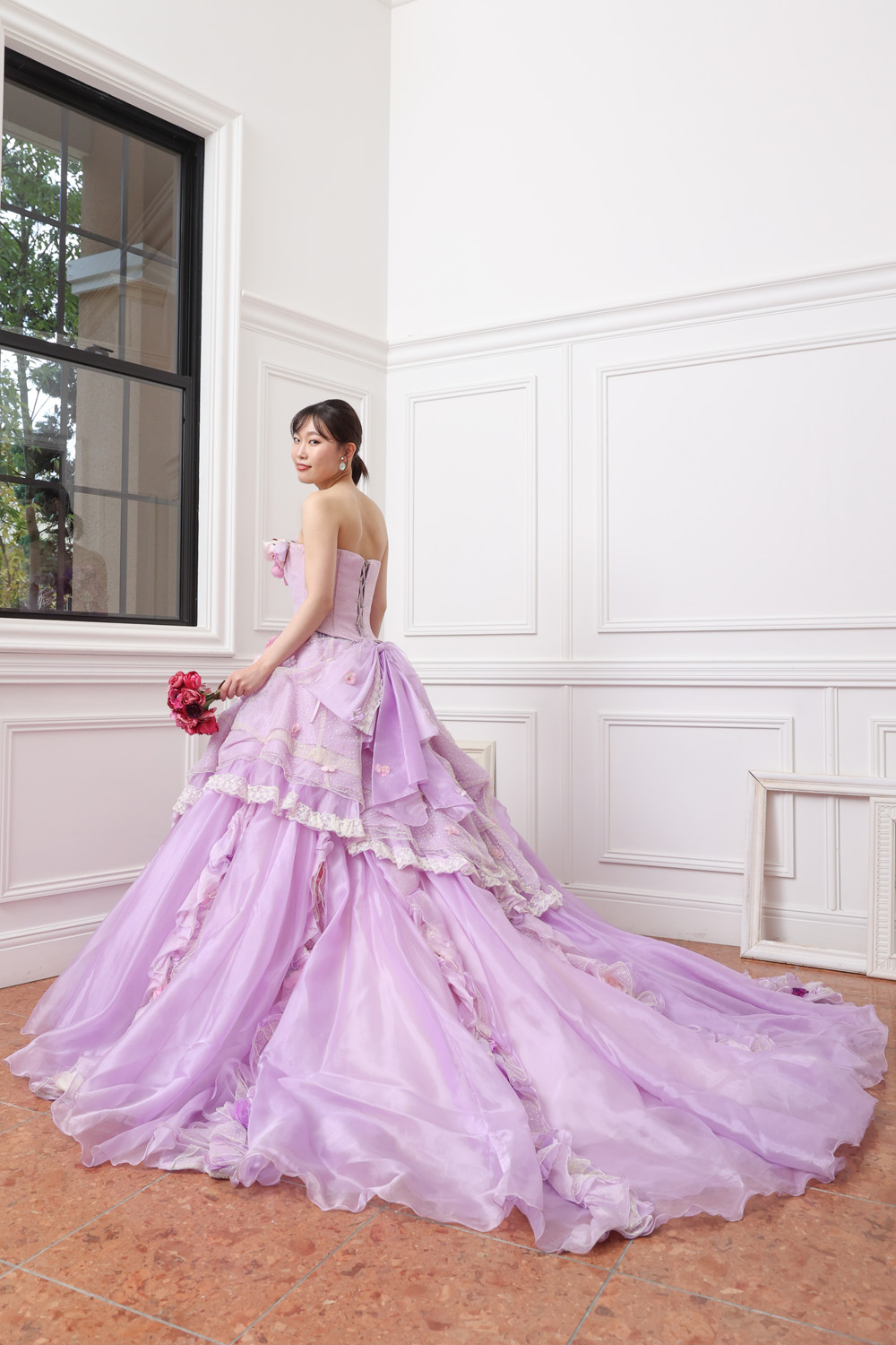 淡く優しいラベンダーカラーが花嫁さまをやさしく包む、フェミニンでロマンティックなカラードレス。