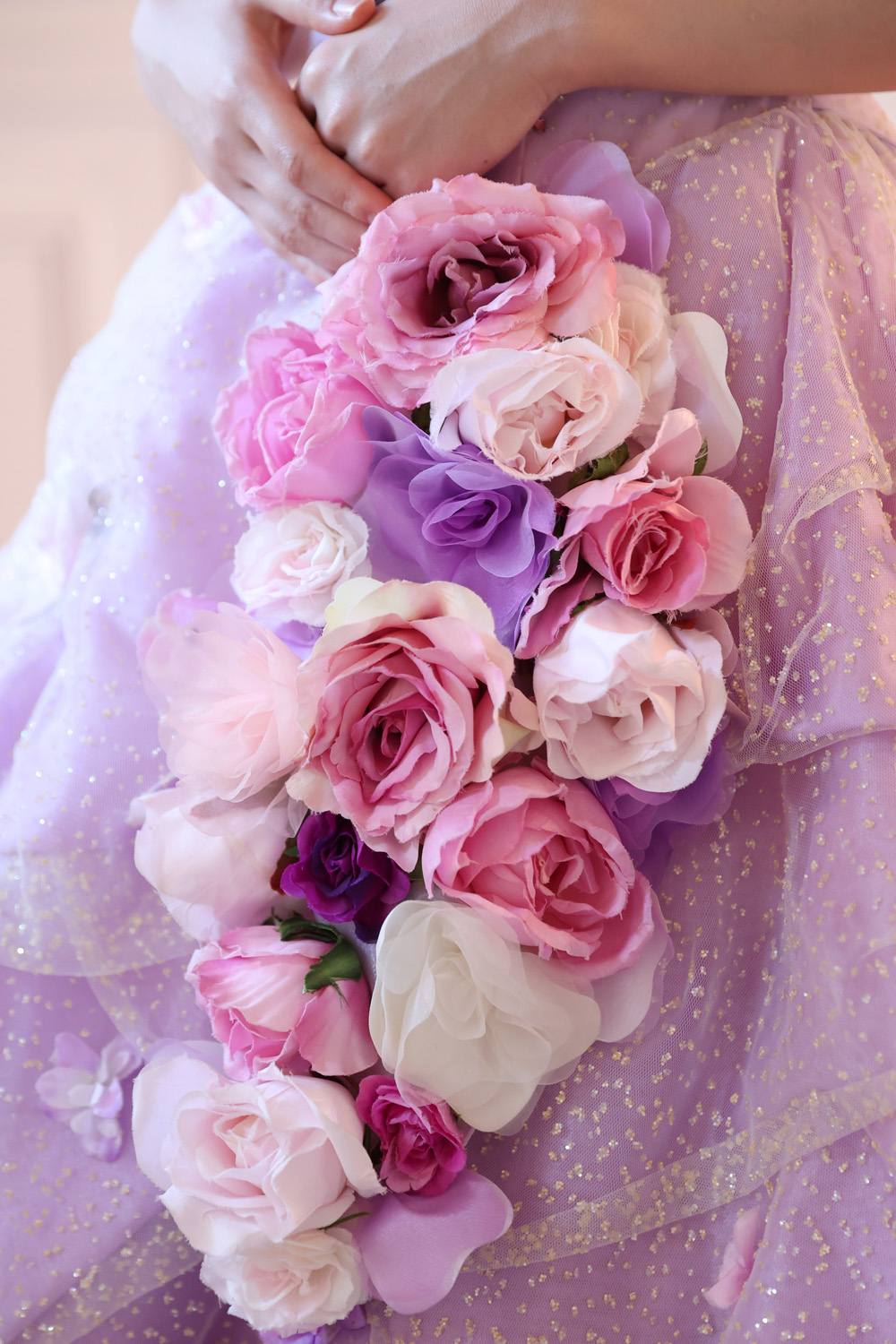 ピンクやラベンダーのグラデーションで彩られた花々が、華やかさと甘さを添えてくれます。