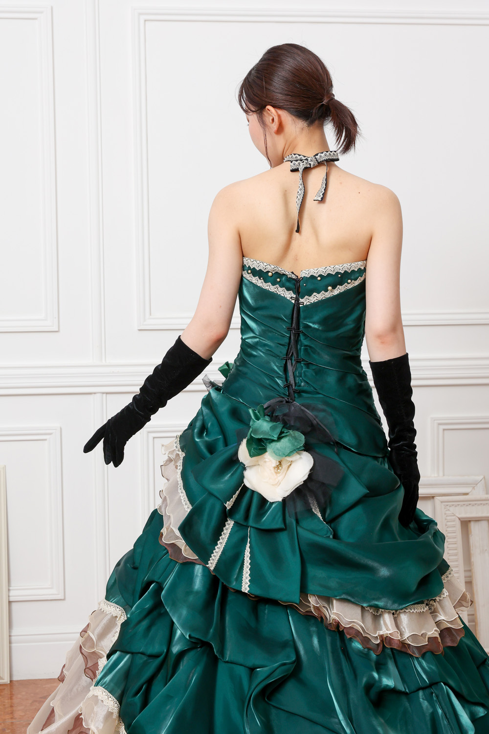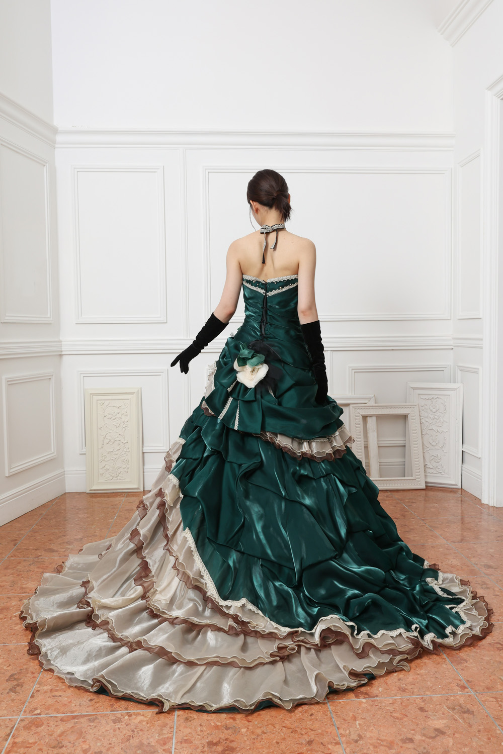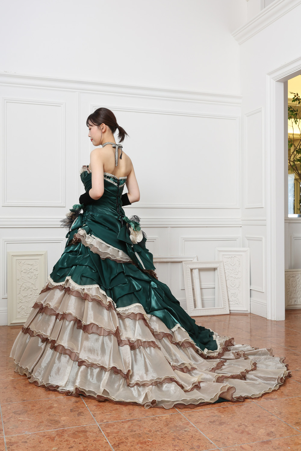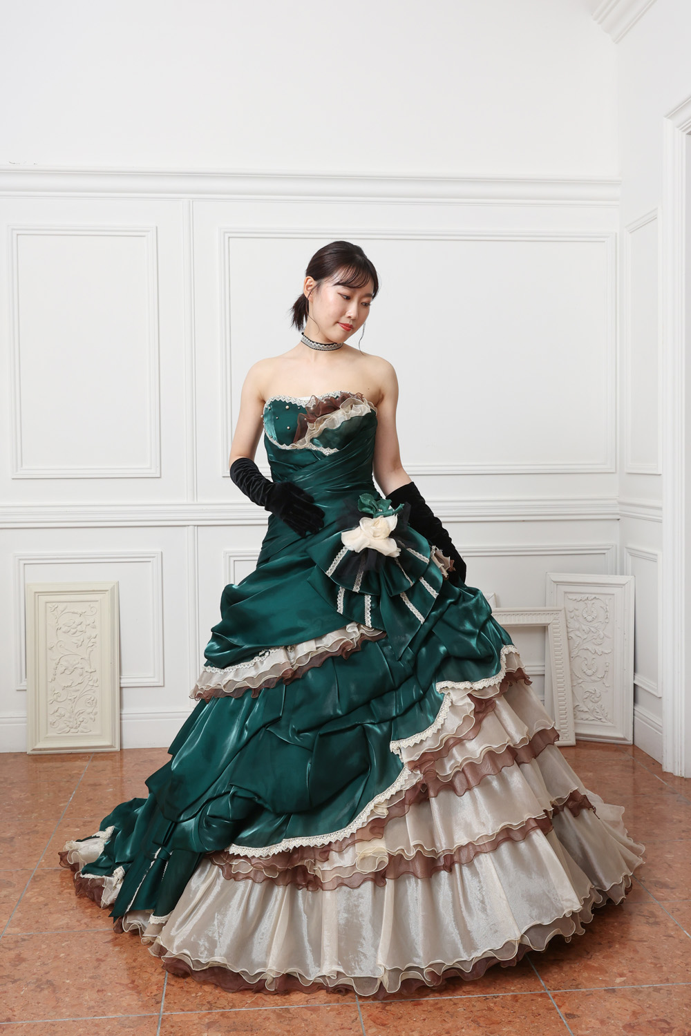 深みのあるエメラルドグリーンとベージュの配色がクラシカルな気品を漂わせる、大人のためのカラードレス。