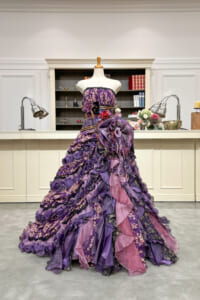 長めのトレーンとフリルのボリューム感で、後ろ姿までしっかりと魅せられるデザインです。