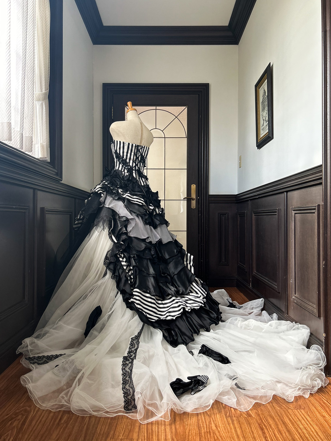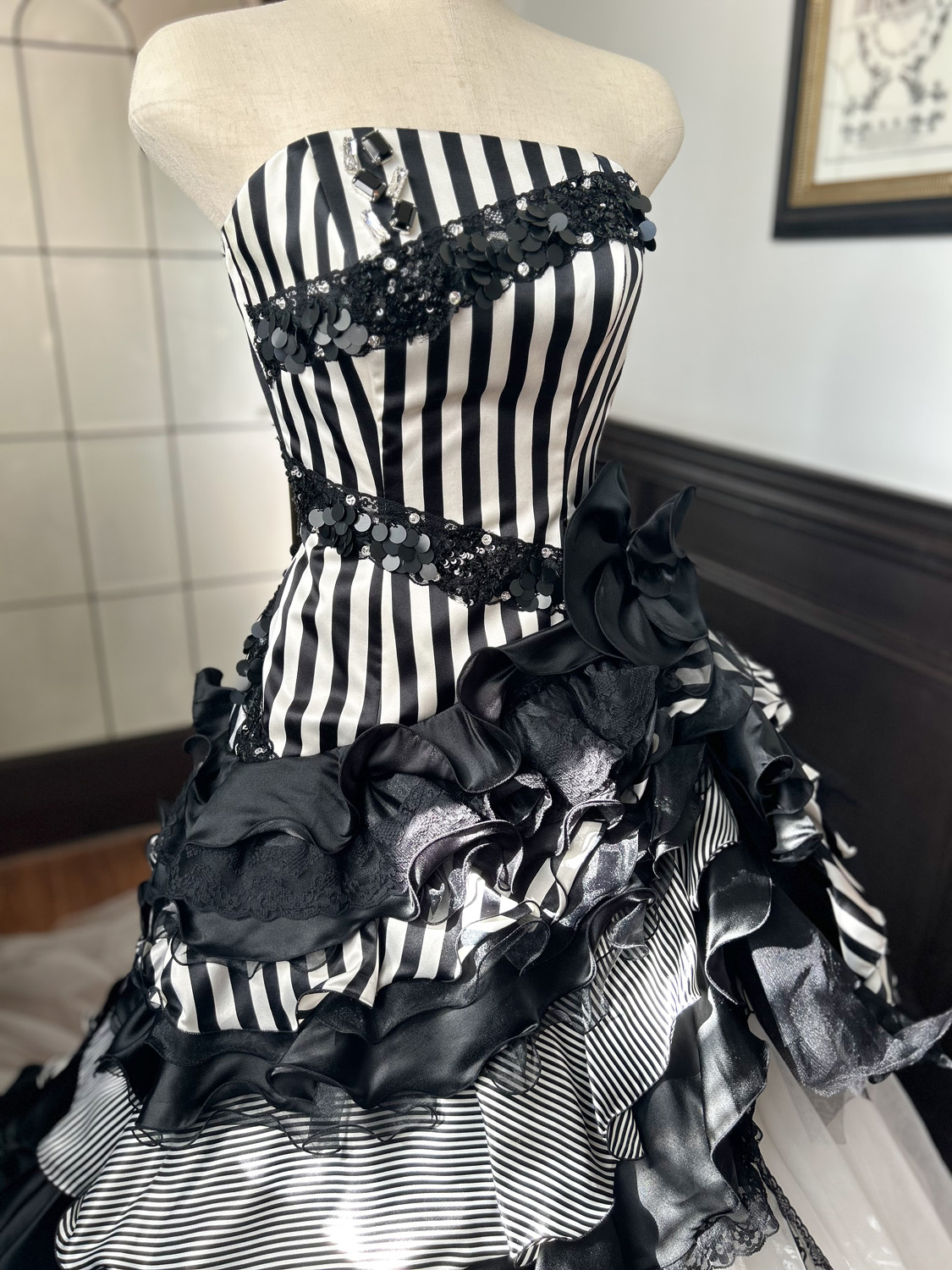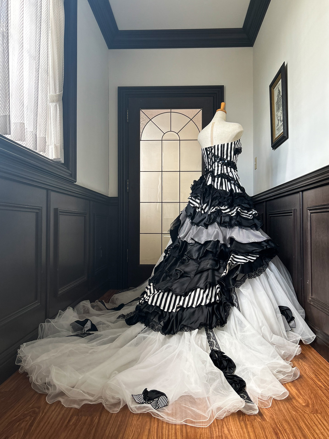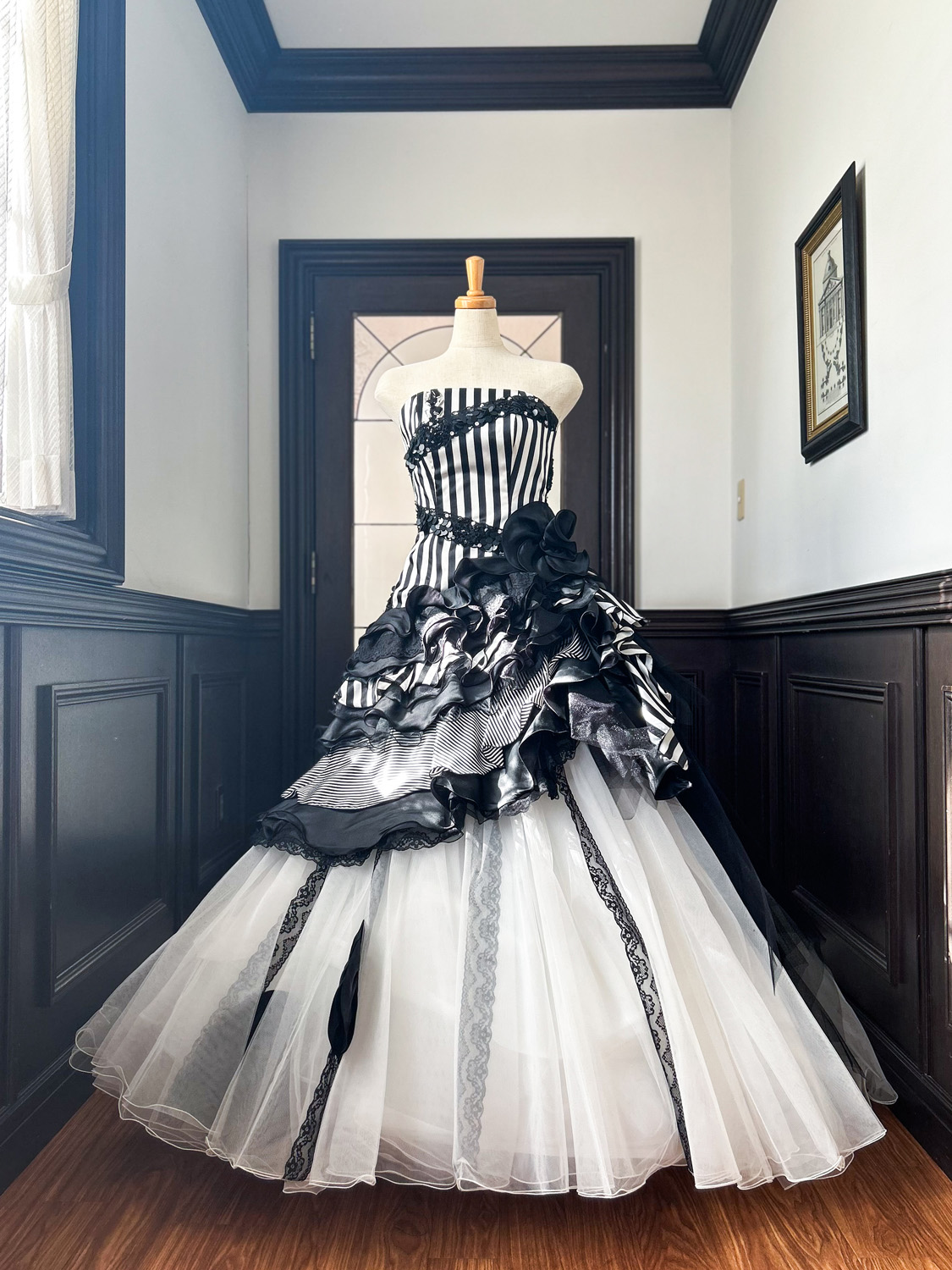 スカート部分はソフトチュールやオーガンジーが幾重にも重なり、ブラックのフリルやフラワーパーツがアクセントとなって軽やかな動きを演出します。