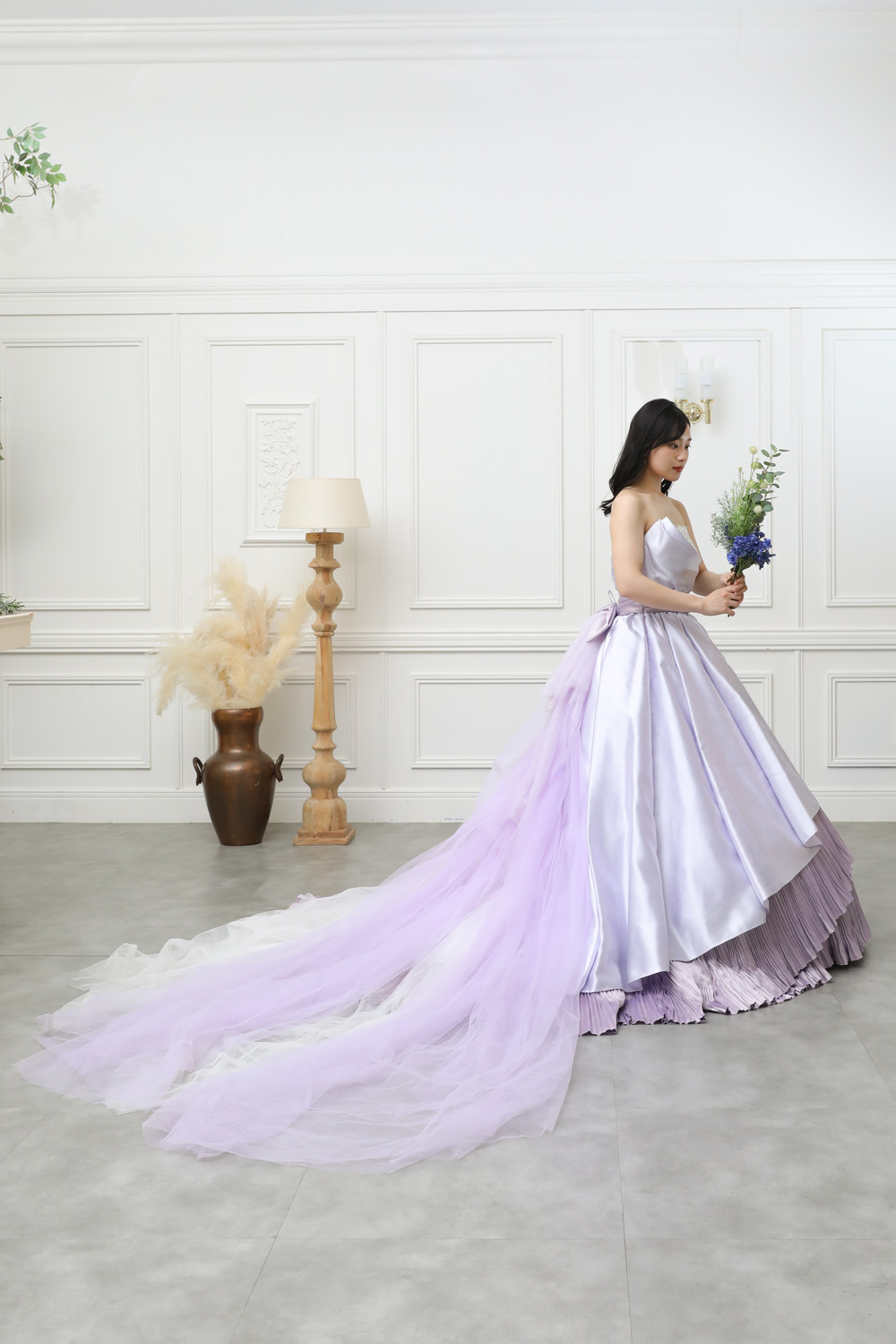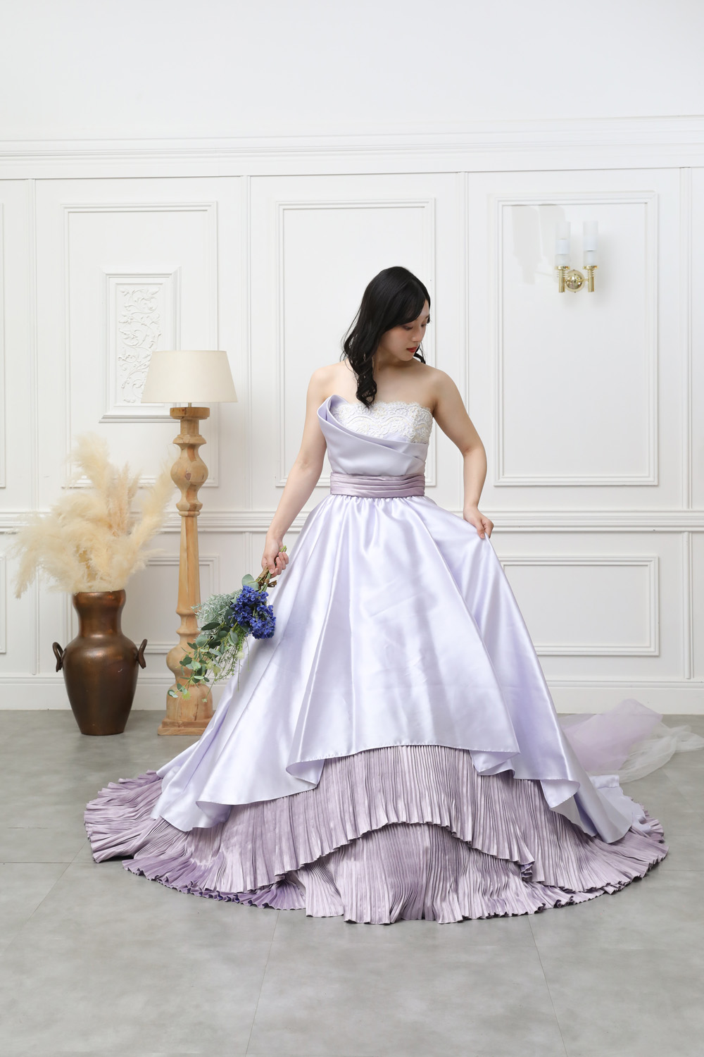 淡いパープルのカラーが肌を明るく見せ、上品な華やかさを引き立てます。