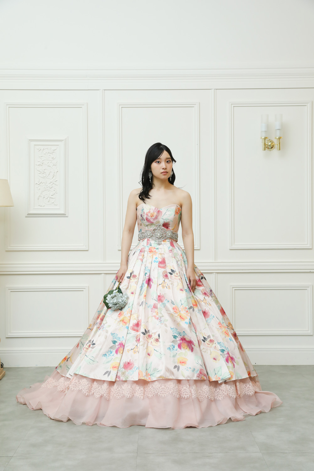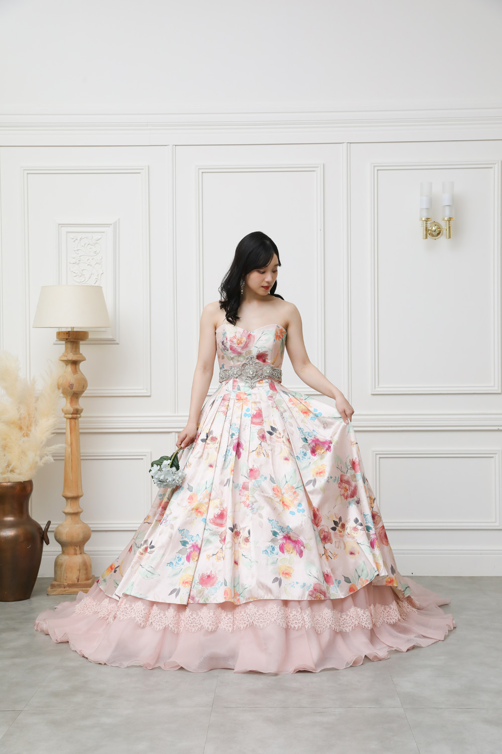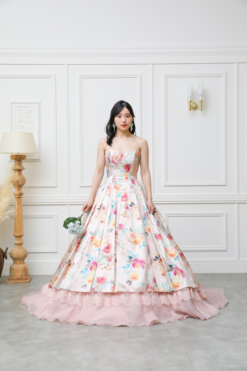 スカート下段にはピンクのオーガンジーが重ねられ、やわらかい光をまとうような透明感を演出します。
