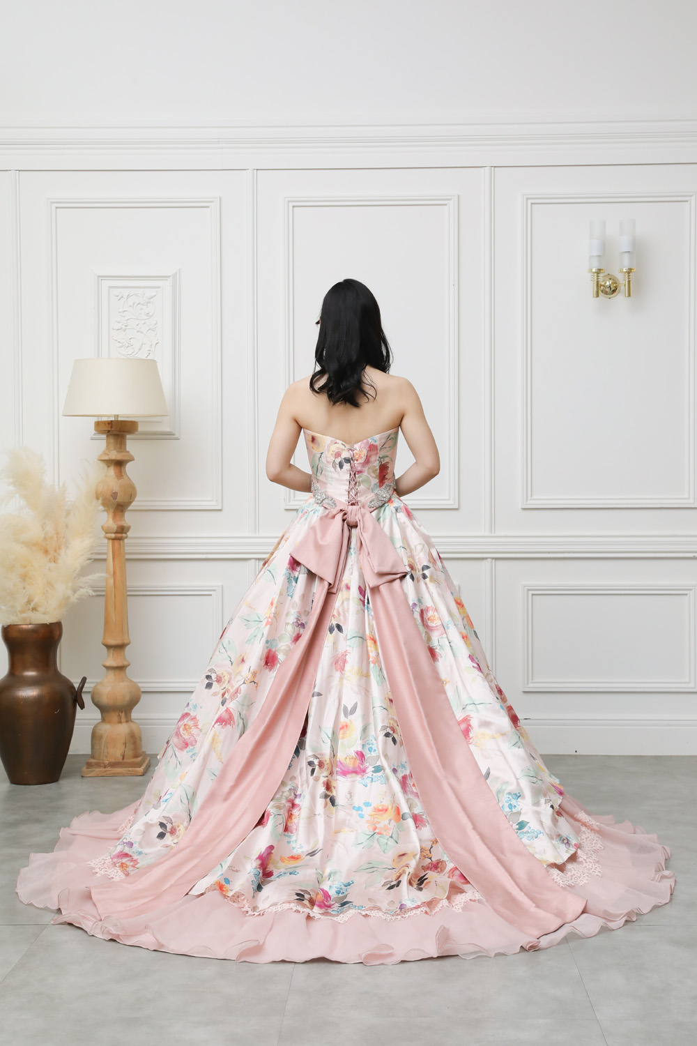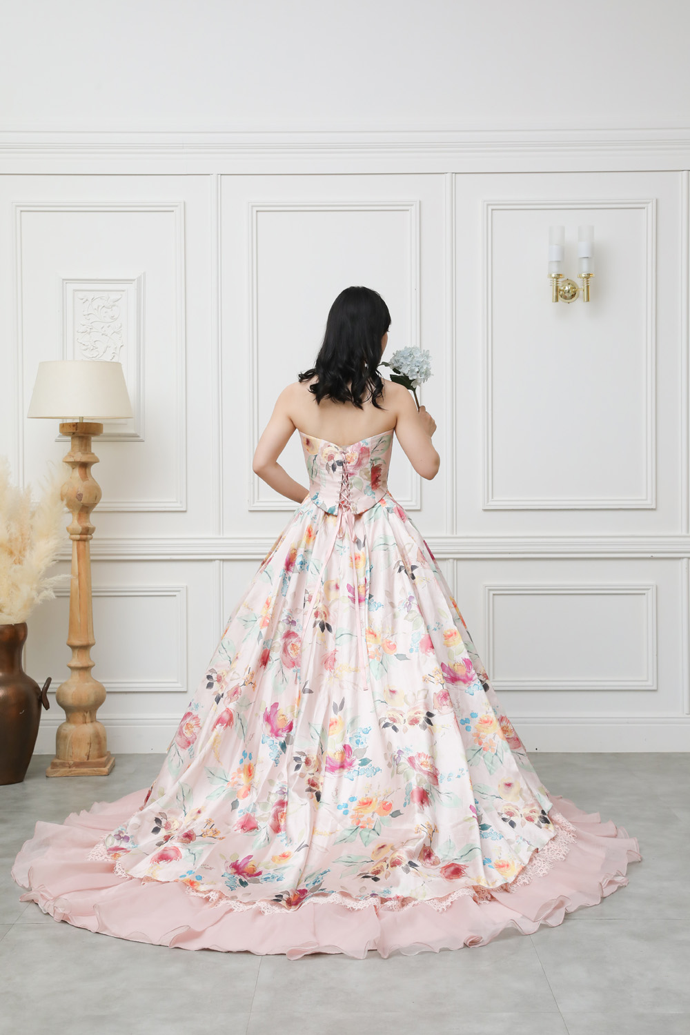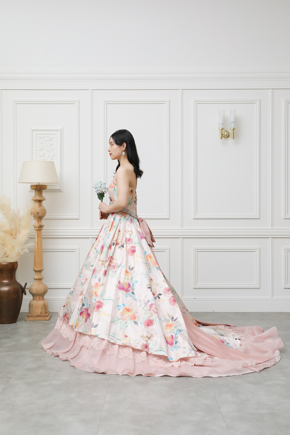 淡いピンクのバッスルデザインは、歩くたびにふわりと揺れ、愛らしさと優雅さを両立。