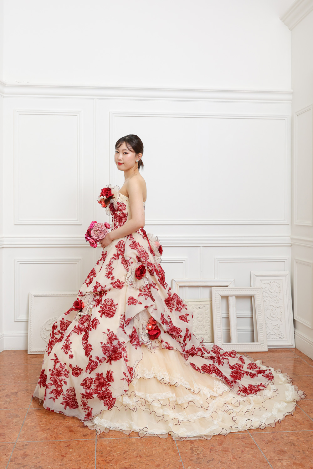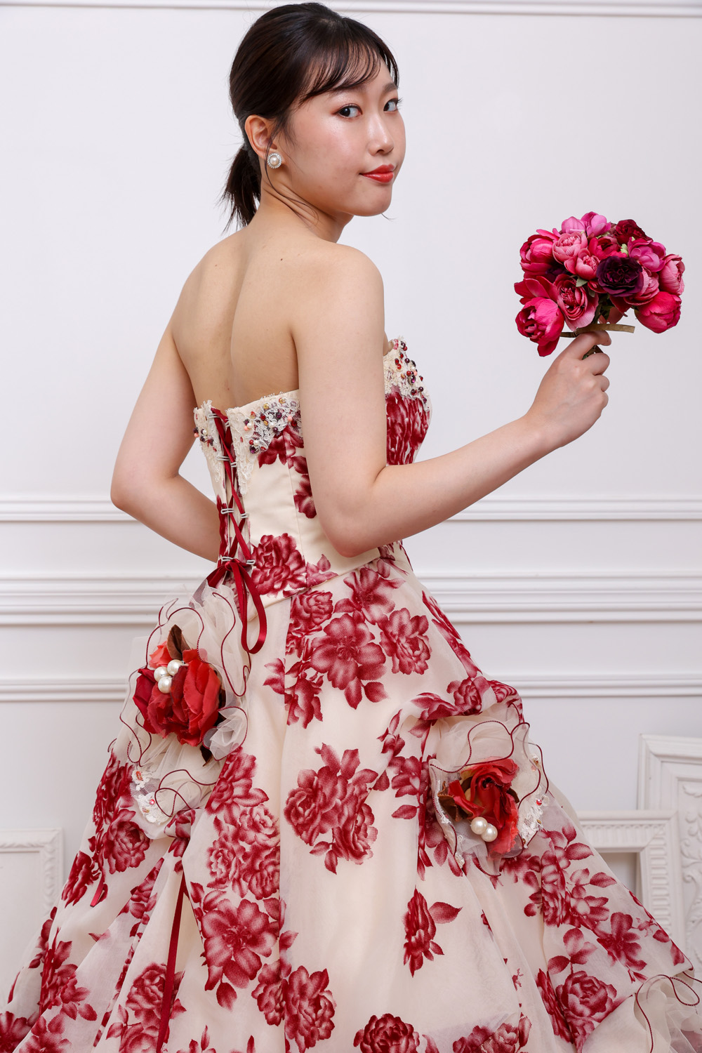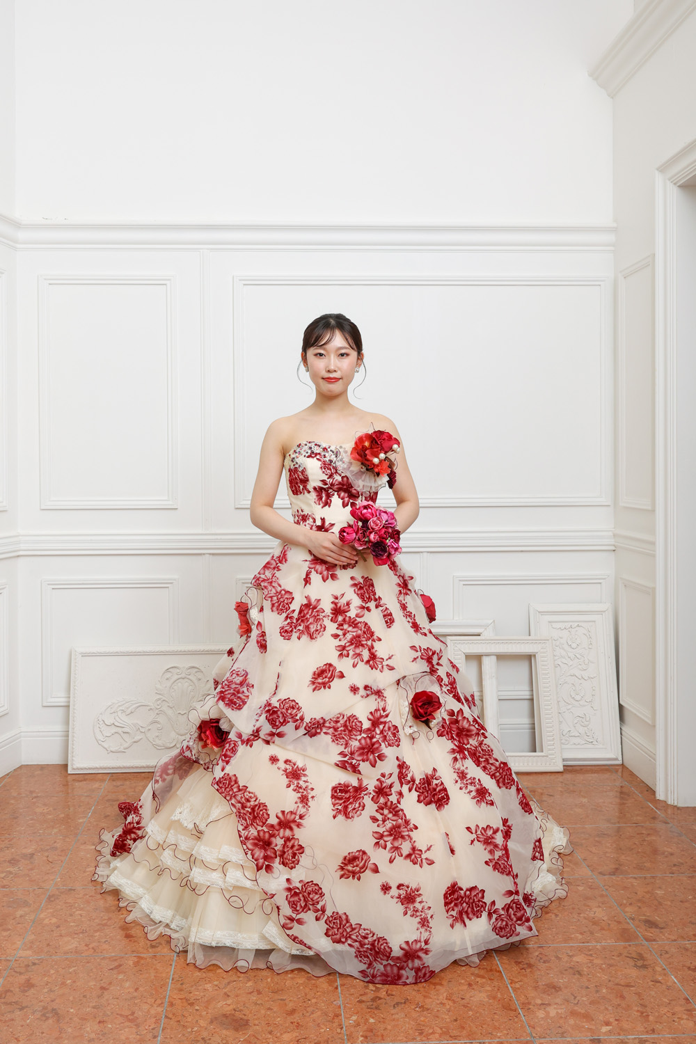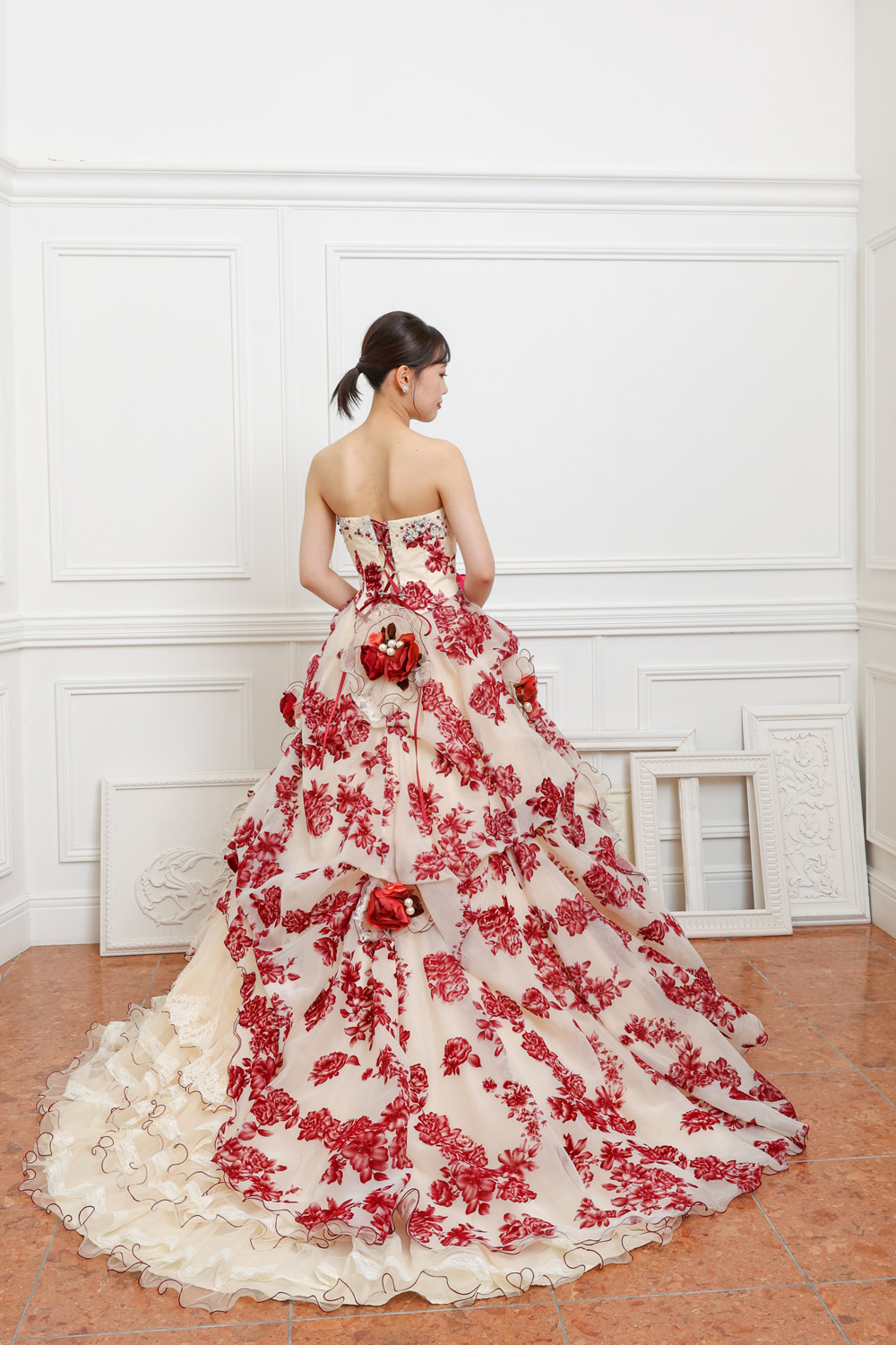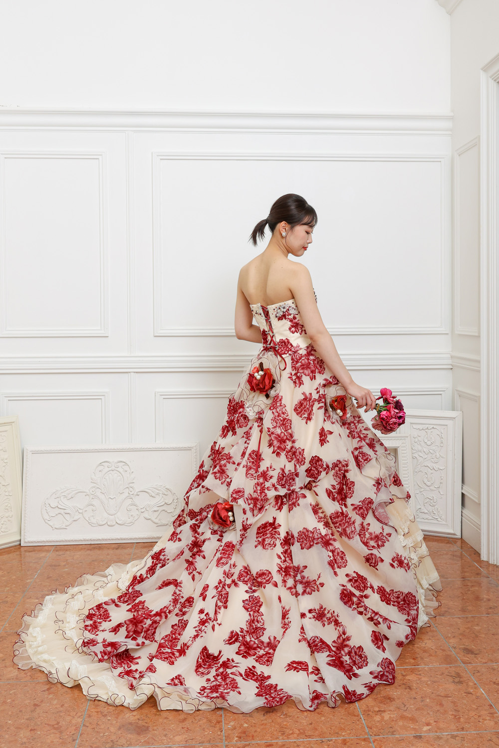 ベースには透け感のあるソフトチュールを使用し、赤の刺繍モチーフが華やかに浮かび上がる、存在感あふれる1着です。