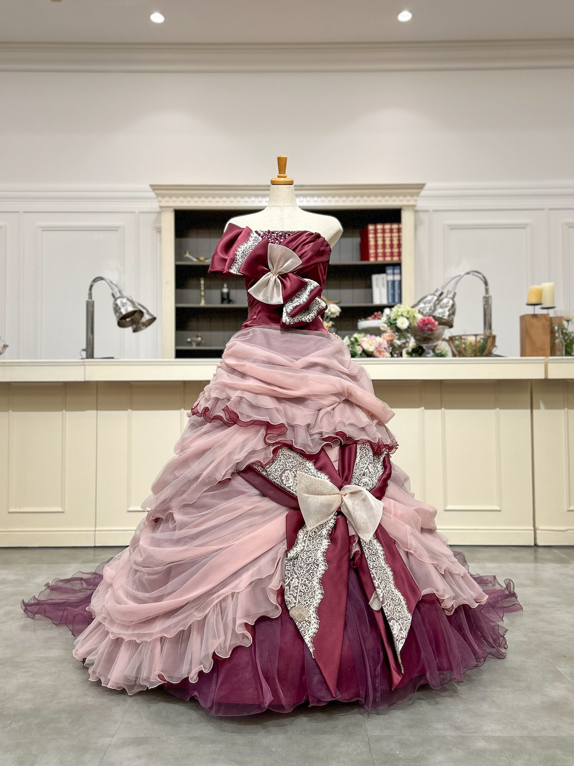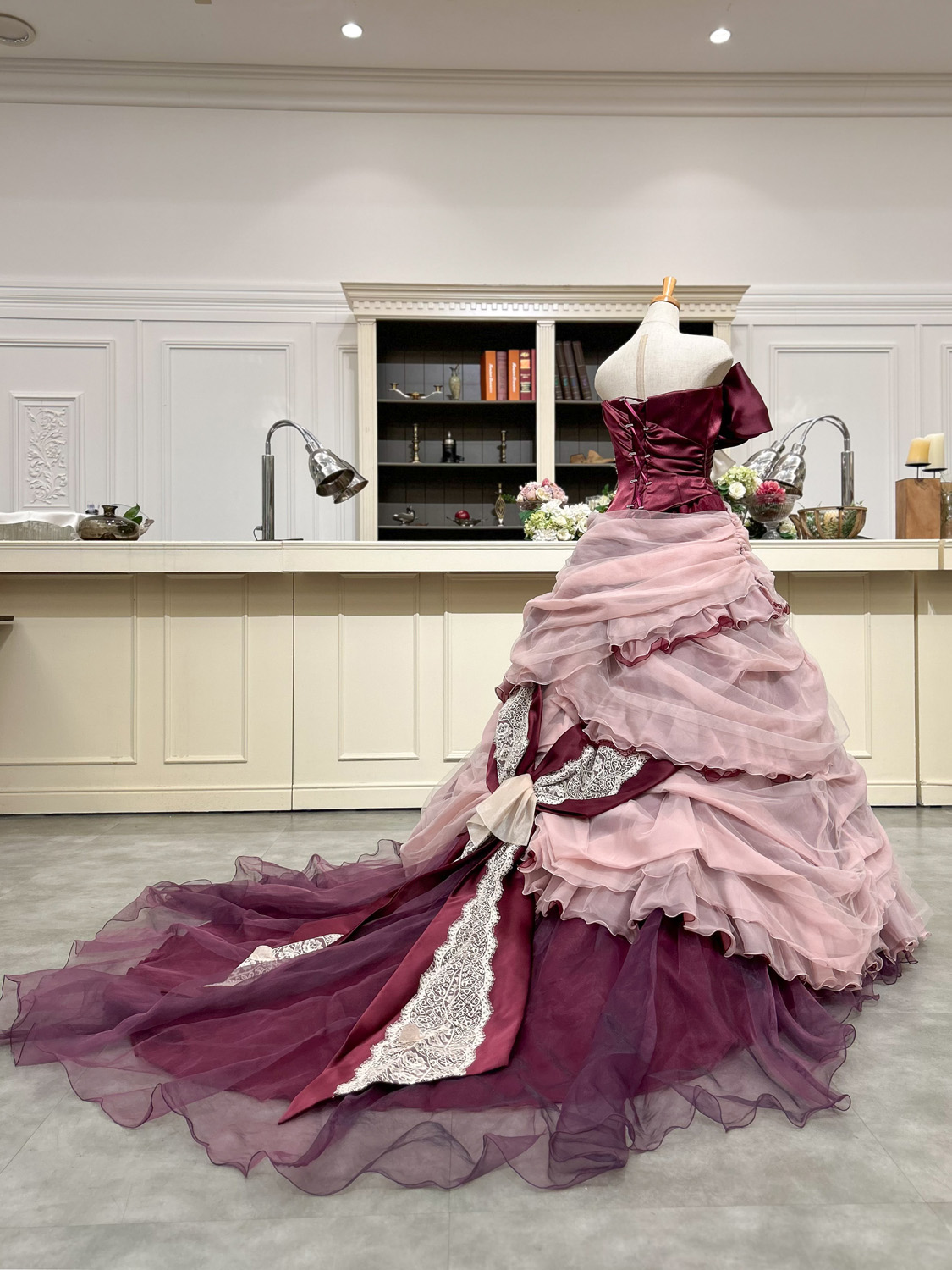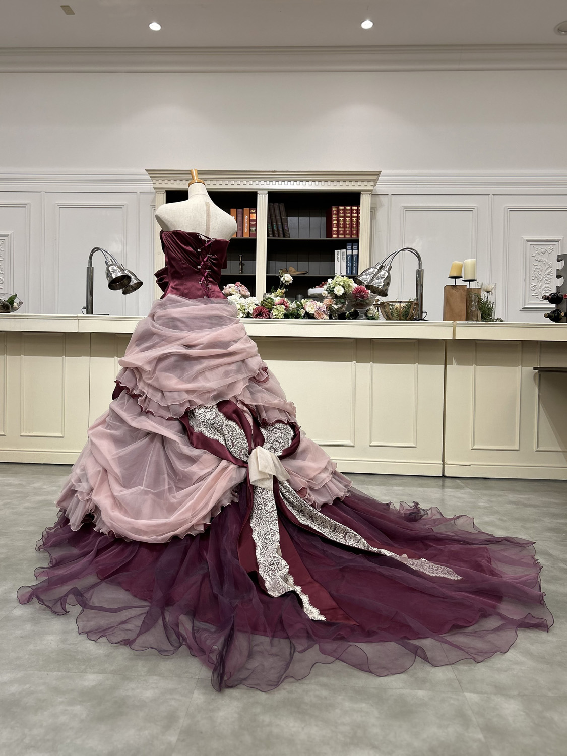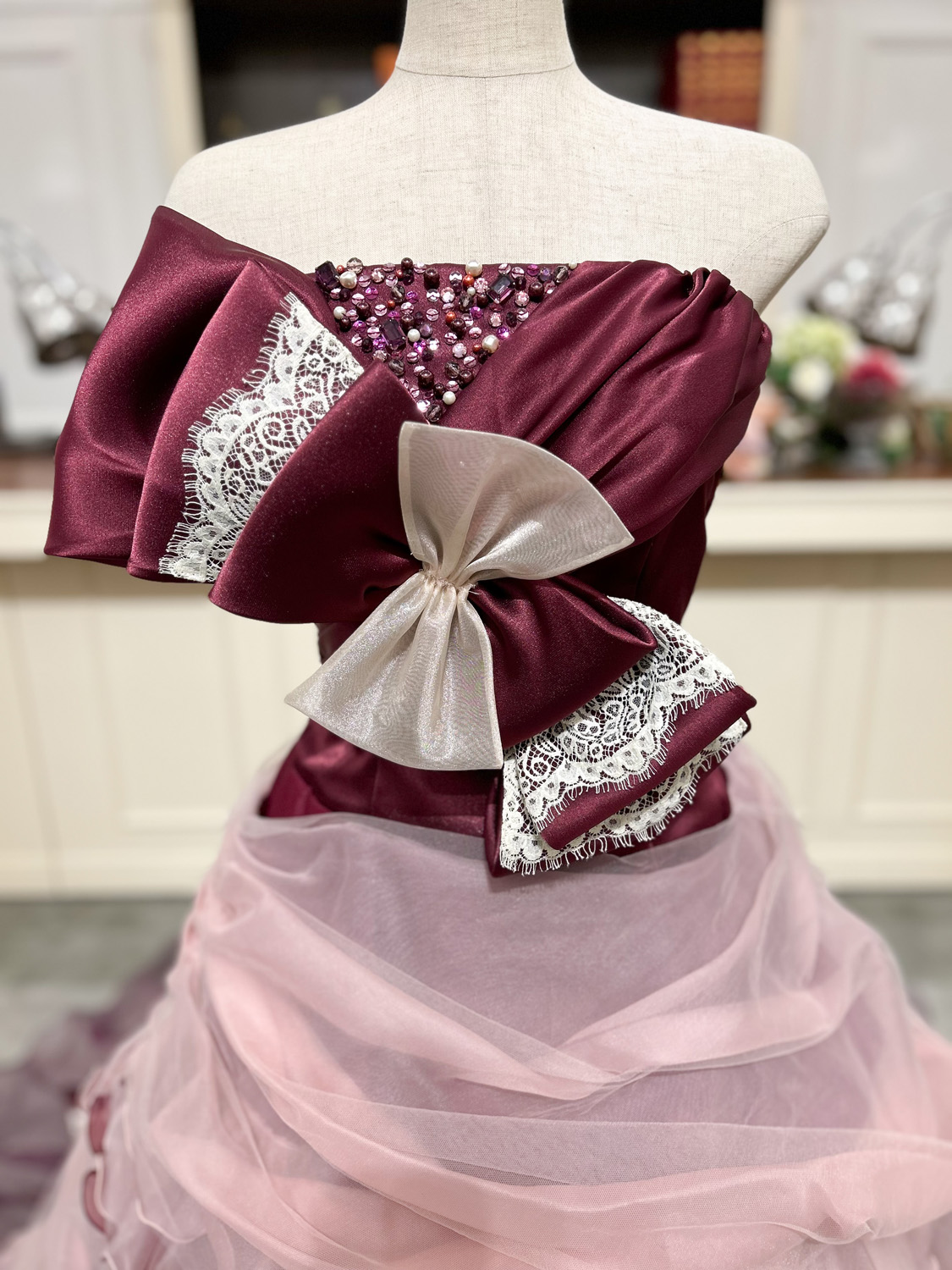 落ち着きのあるワインレッドとくすみピンクのコントラストが美しい、クラシカルロマンティックなカラードレス。