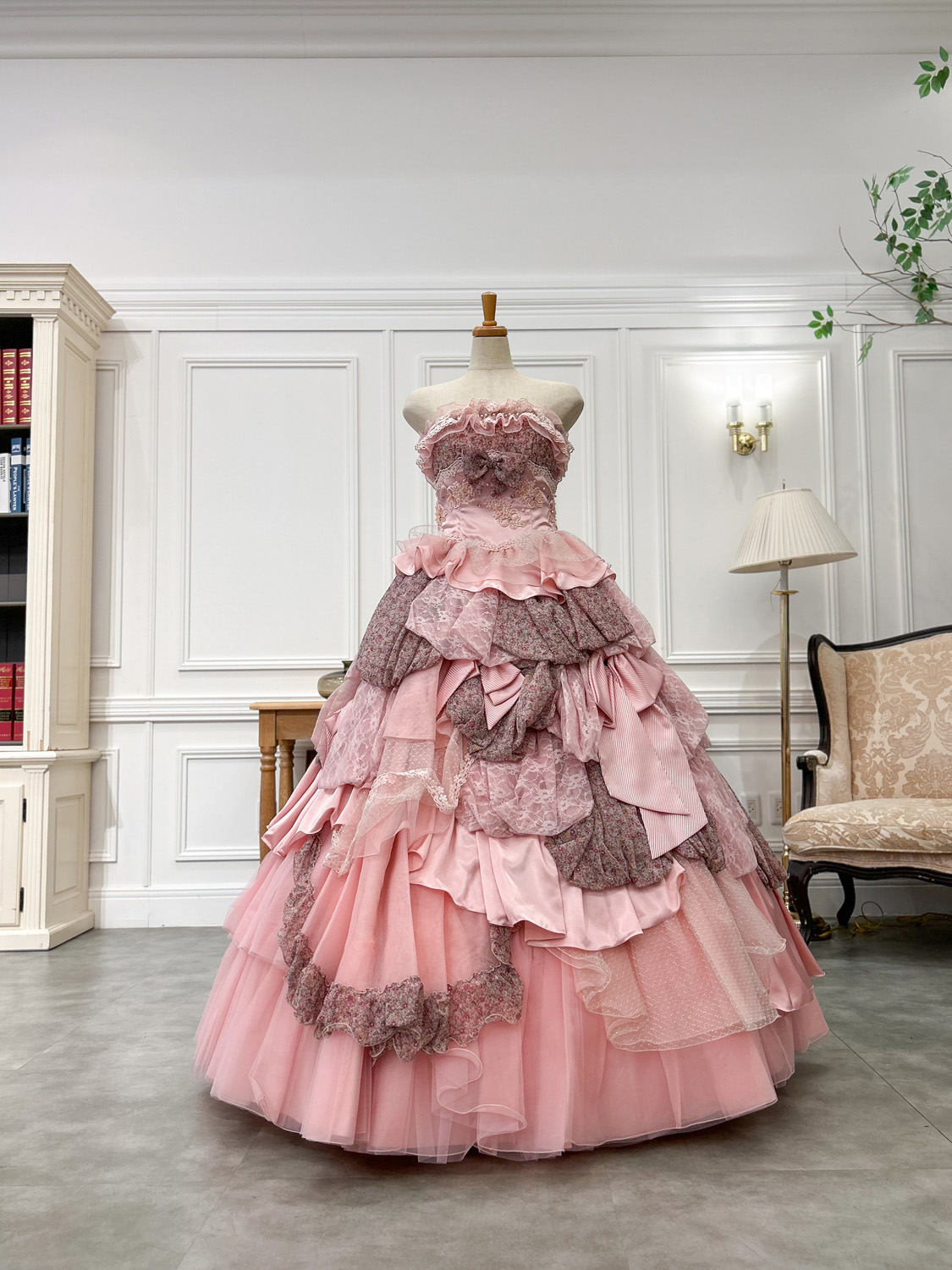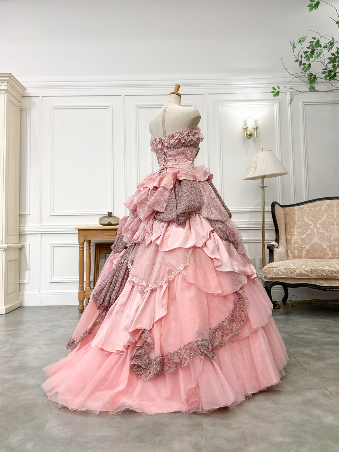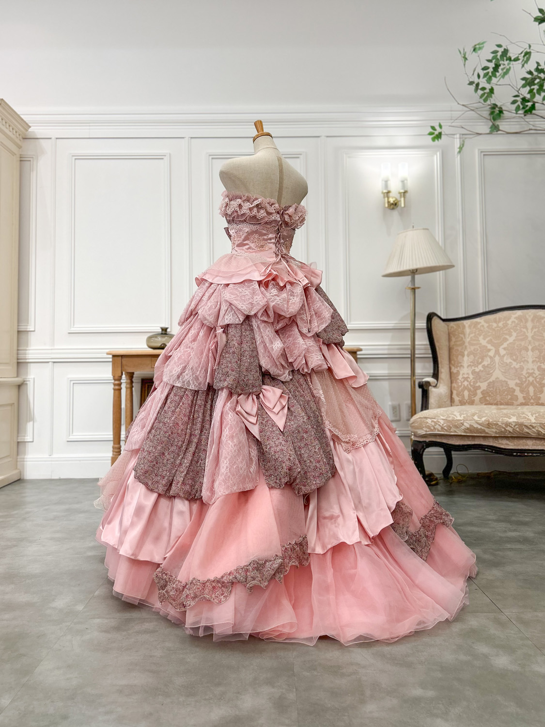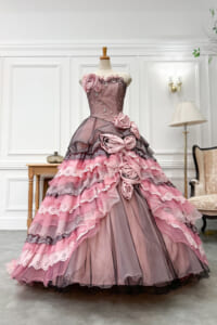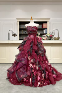 スカート部分は段々に重ねられたラッフルがふんわりと広がり、ボリューム感のある華やかなフォルムをつくり上げます。