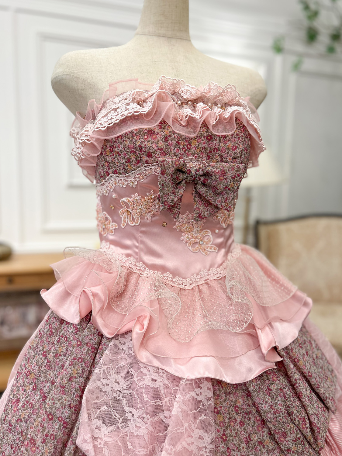 胸元はフリルとレースで装飾されたストレートビスチェ。