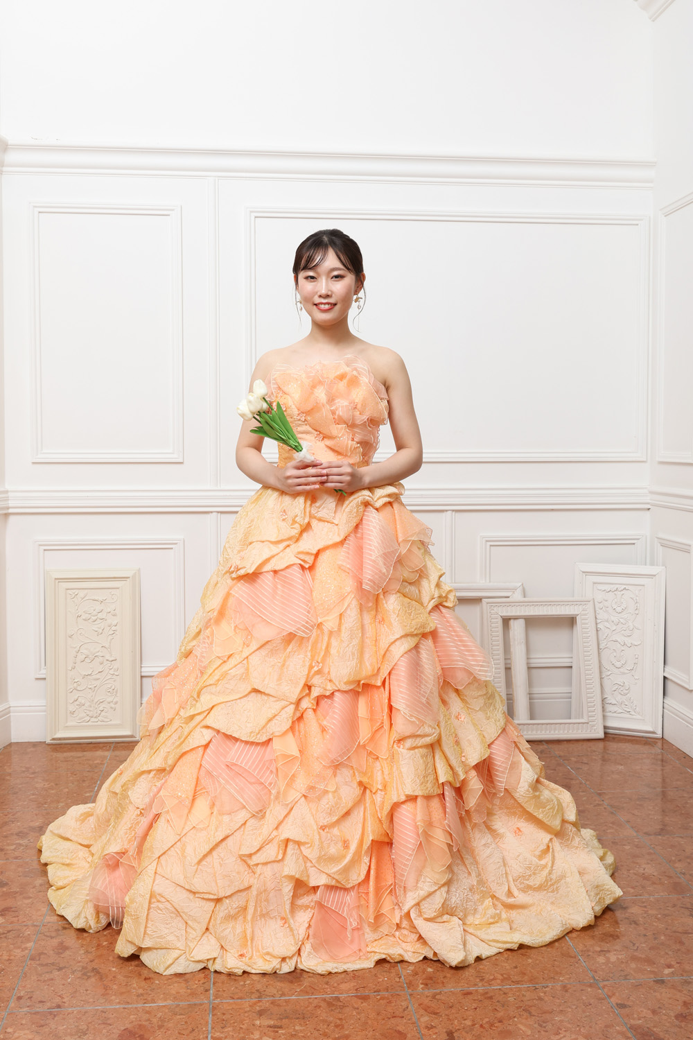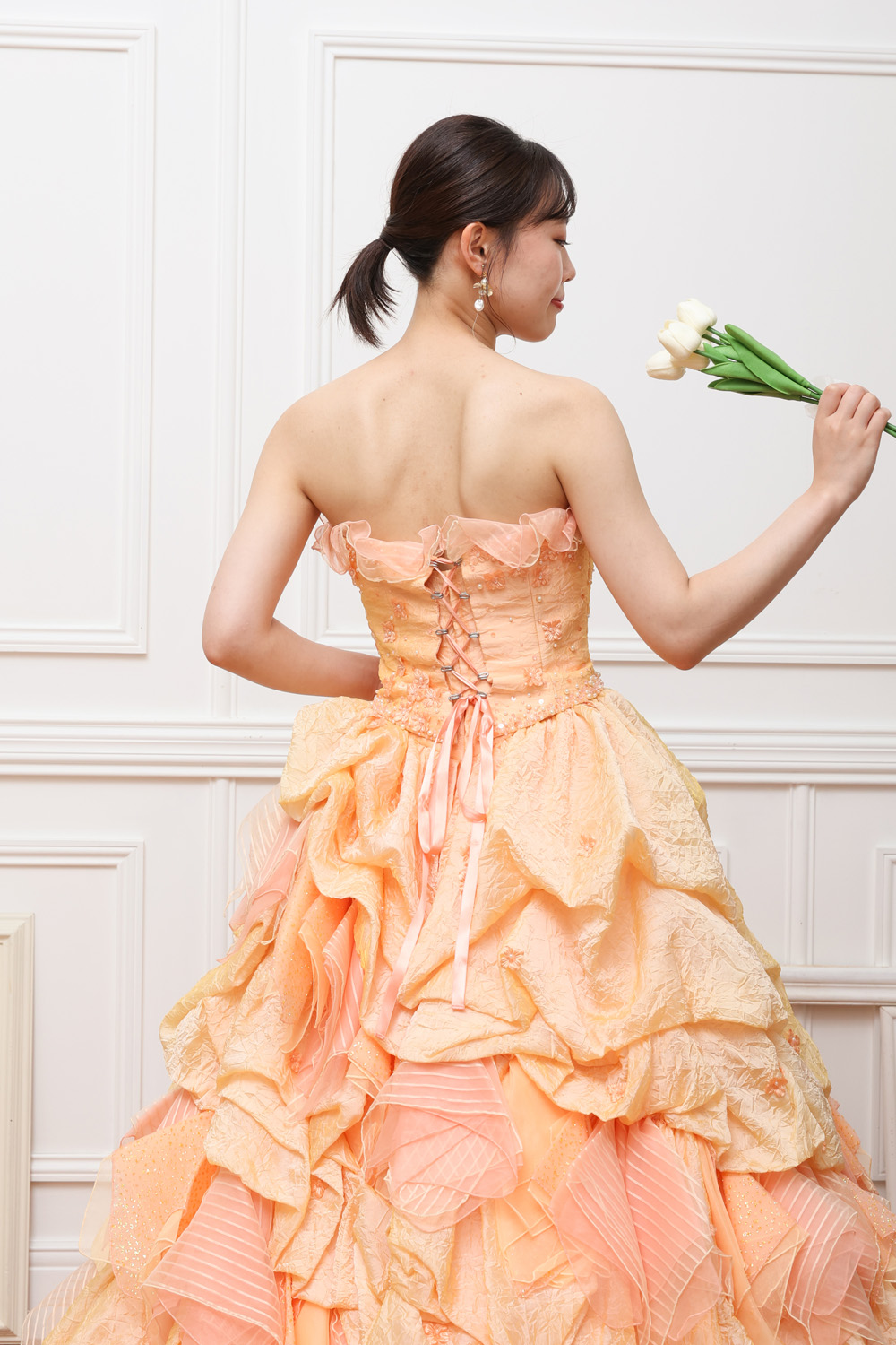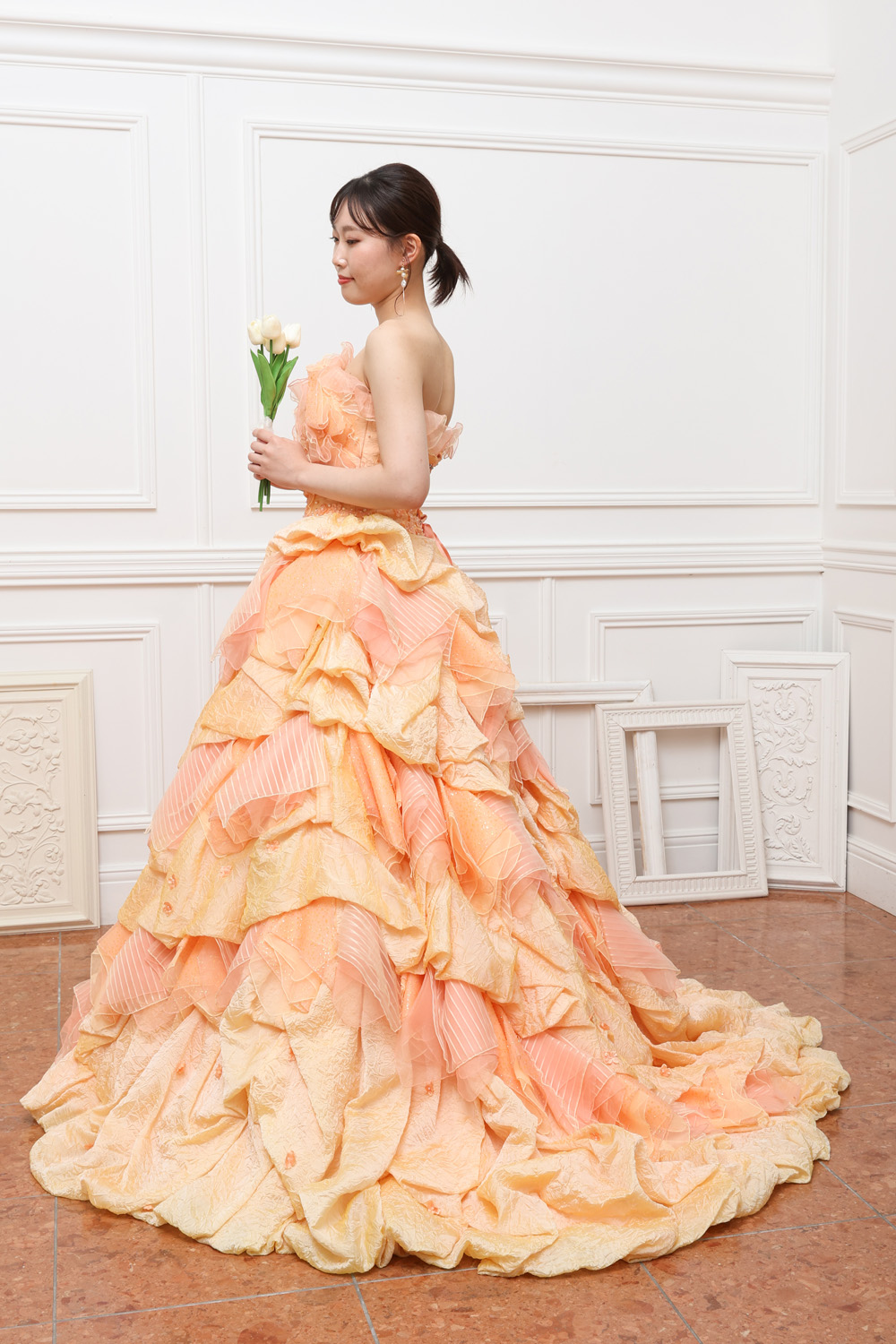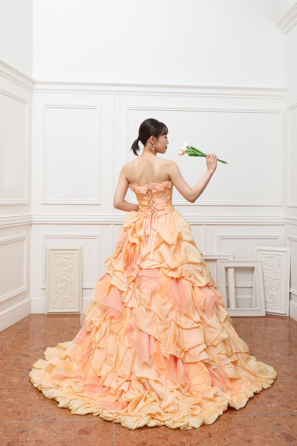 オレンジ×サーモンピンクのグラデーションがふんわりと広がる、明るく優しい印象のカラードレス。