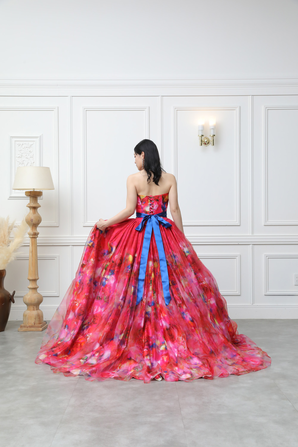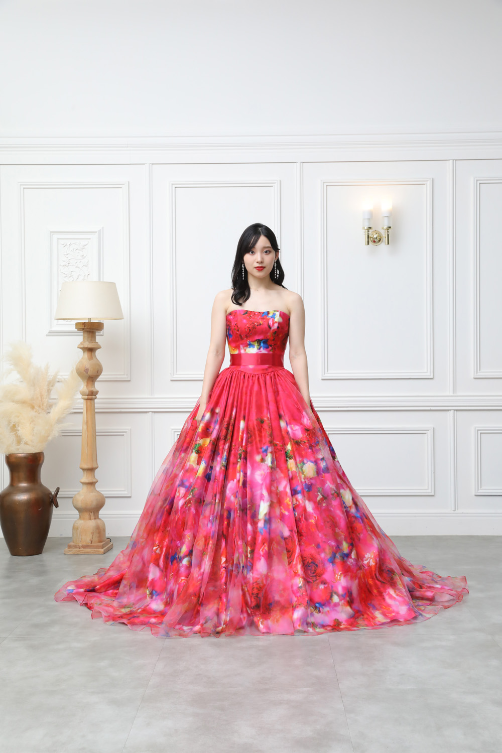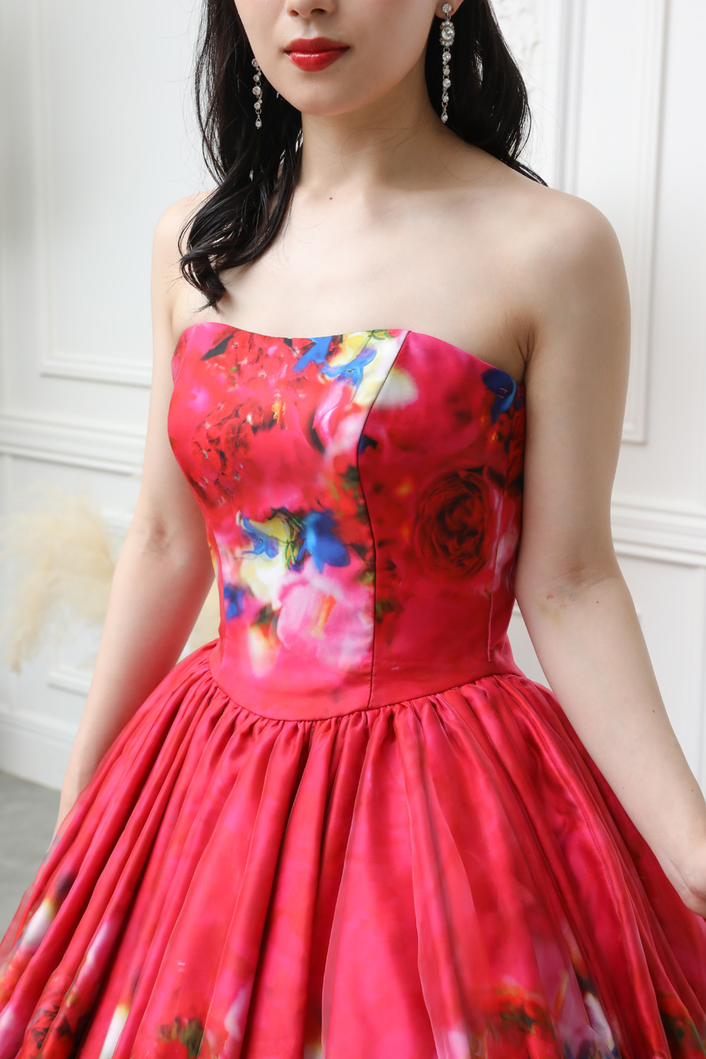 【蜷川実花】鮮やかな赤をベースに、絵画のようなフラワープリントが広がる、印象的なカラードレス。