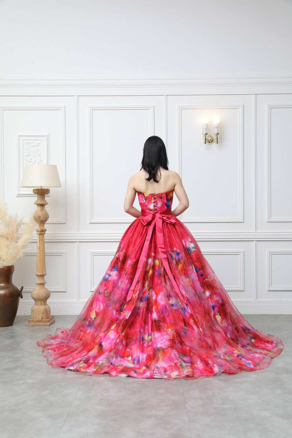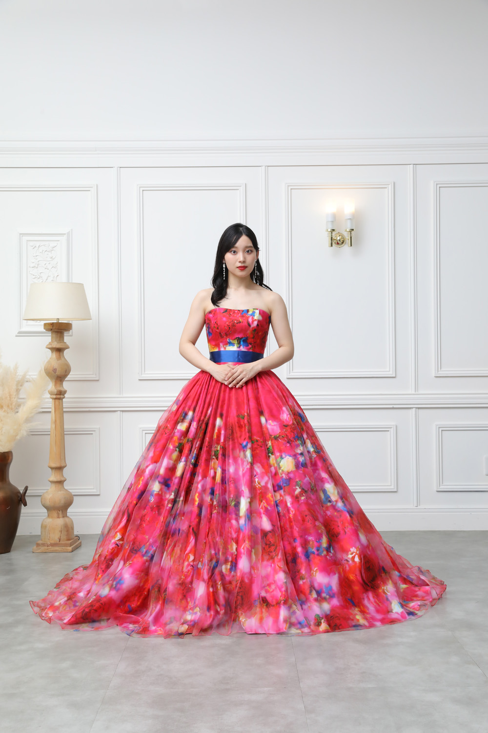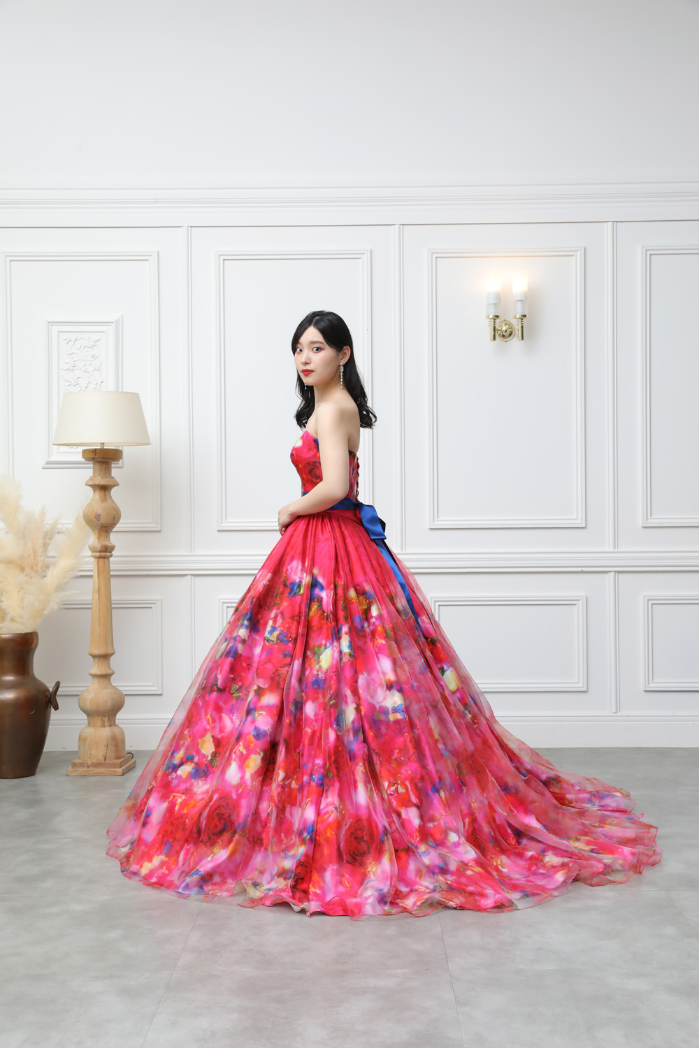 【蜷川実花】鮮やかな赤をベースに、絵画のようなフラワープリントが広がる、印象的なカラードレス。
