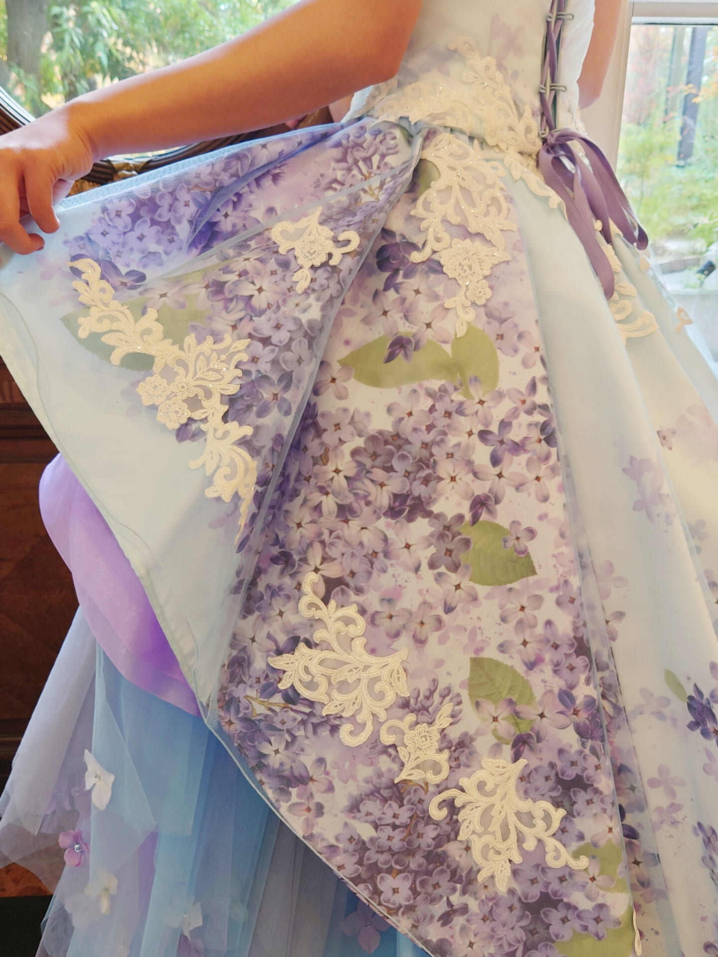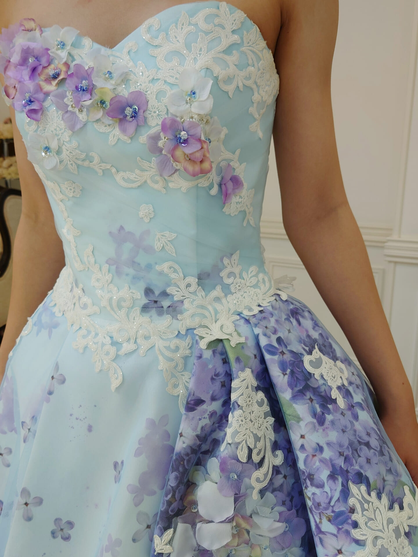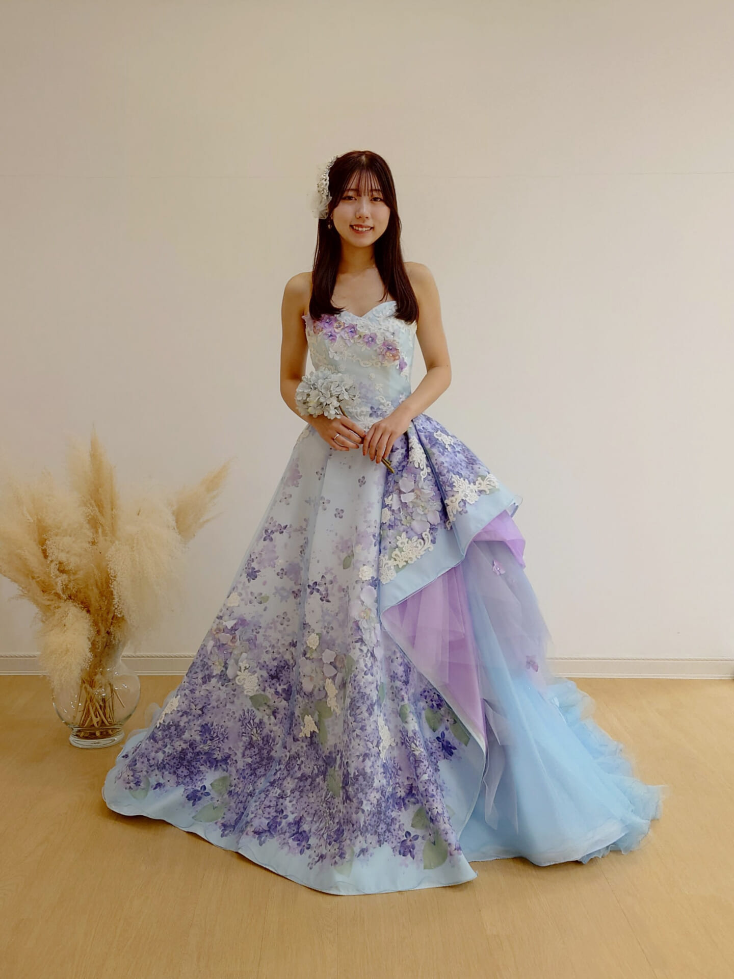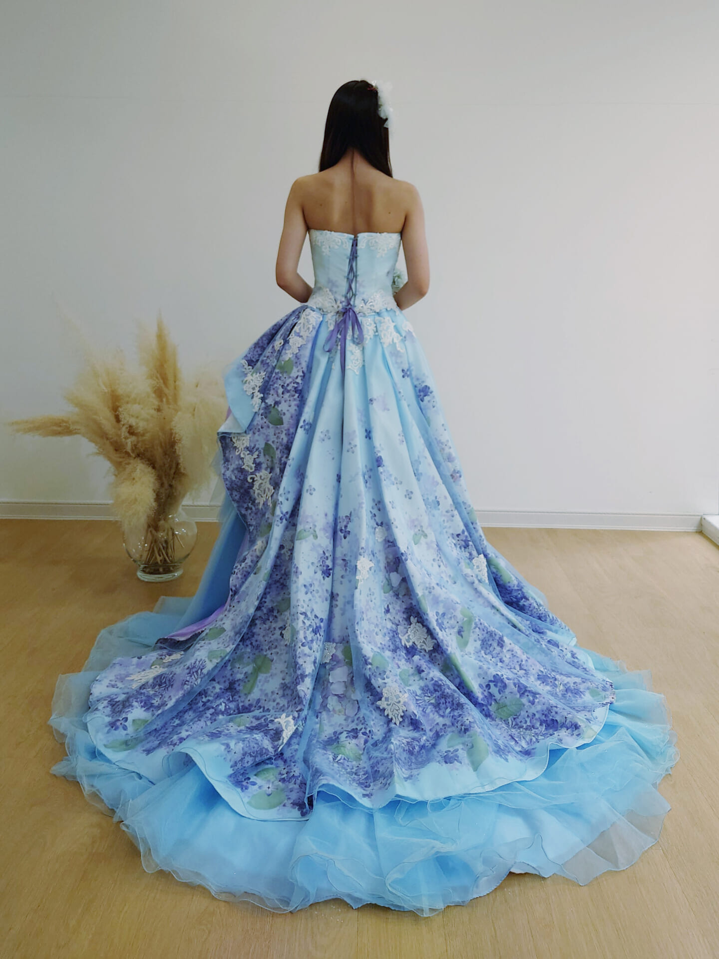 サイドにはラベンダーのチュールやレースを重ねたアシンメトリーのデザインを施し、可愛らしさの中に大人のエレガンスをひとさじ。後ろ姿はプリントの美しさが存分に際立つロングトレーン。ブルーのチュールが階段のように広がり、どこから見ても華やかで立体的なシルエットが叶います。