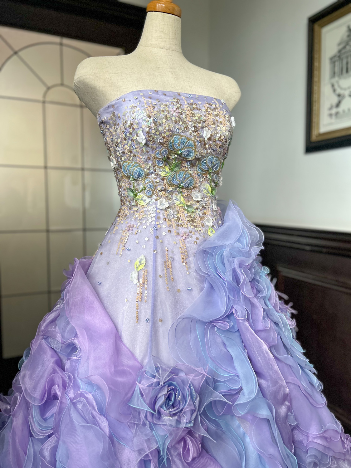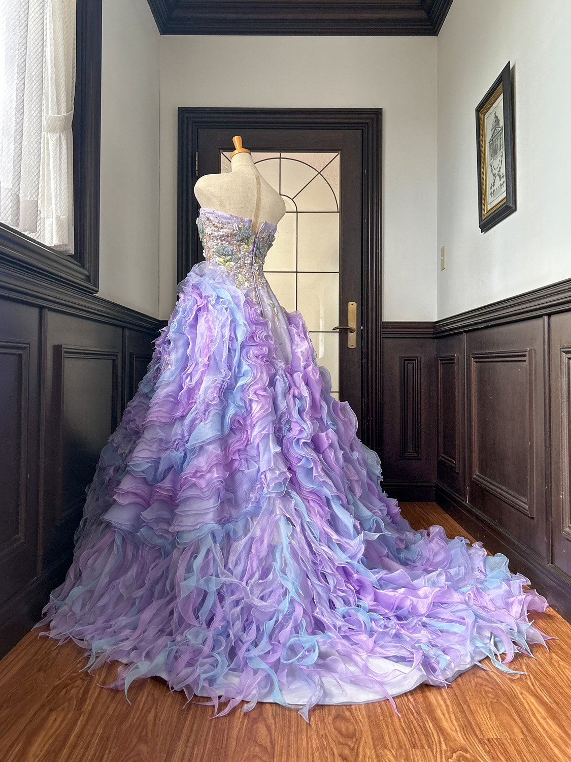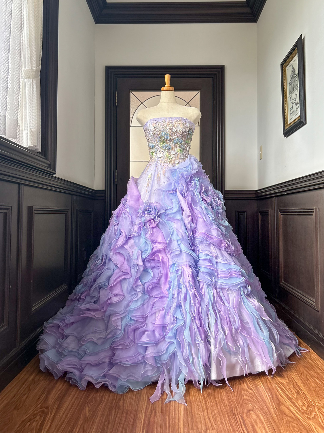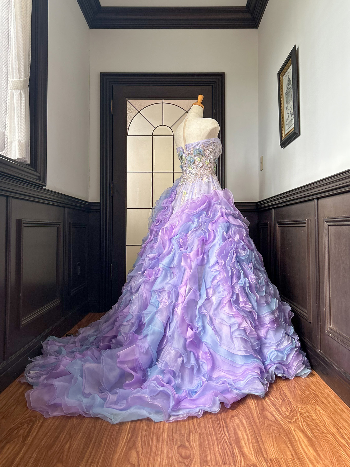 透明感あふれるラベンダーとブルーのグラデーションが美しい、幻想的な印象のカラードレス。