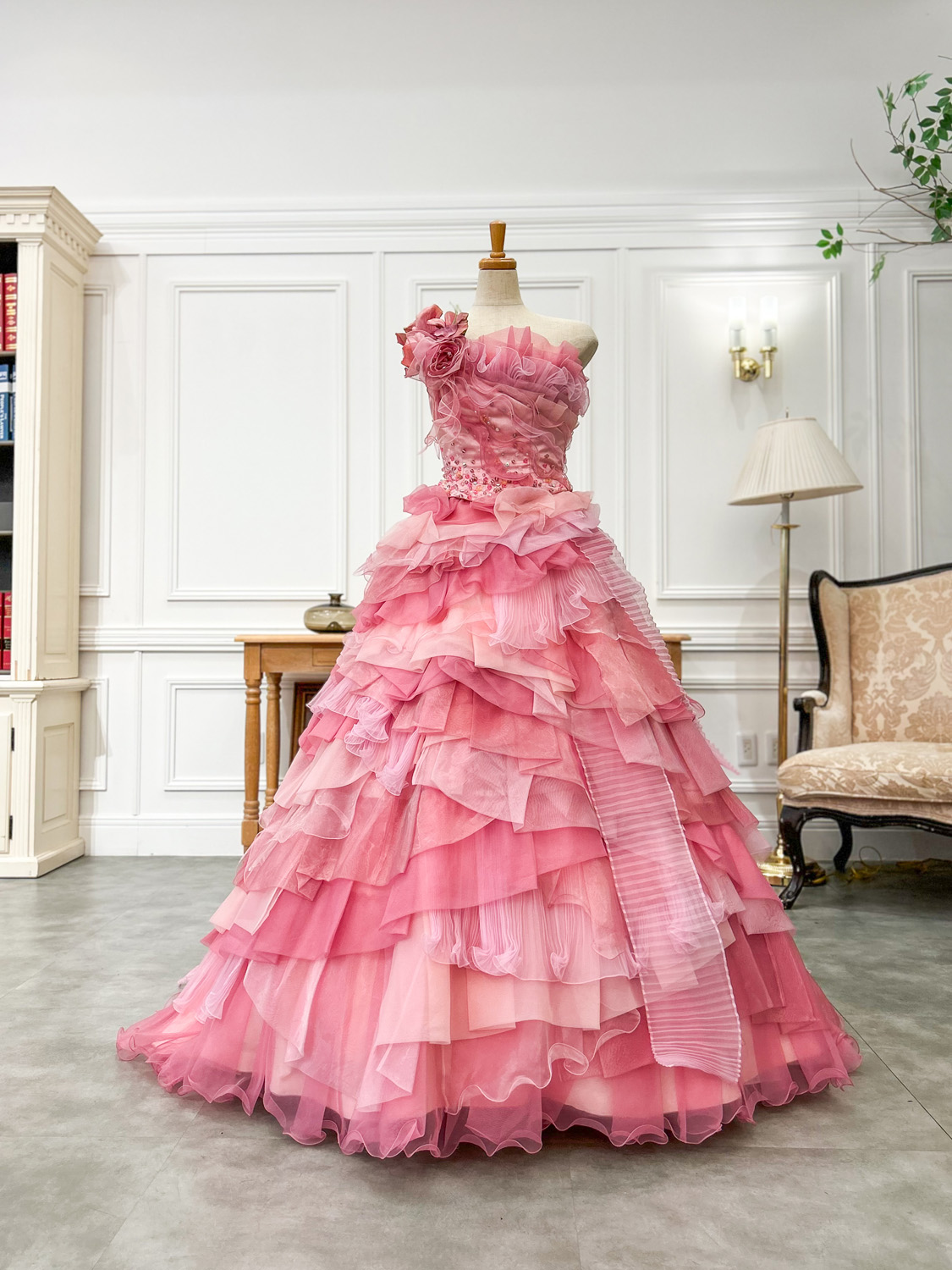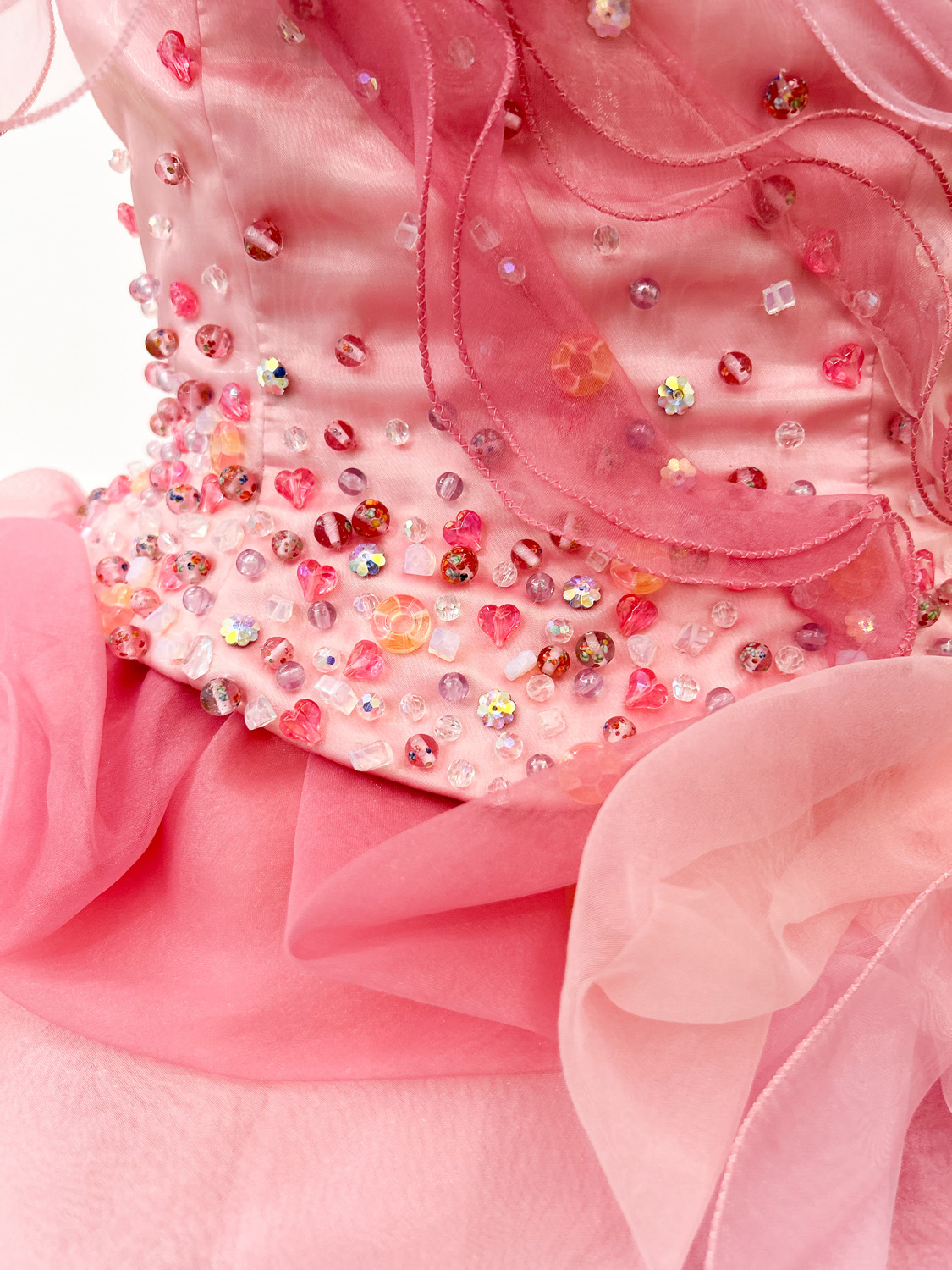 スカートは、ピンクグラデーションの異素材チュールを幾重にも重ねた構造で、立体的なボリュームを表現。