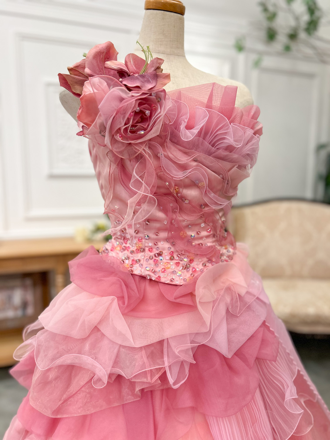 透明感あふれるピンクカラーに、繊細なビーズ刺繍と立体フラワーが華やかに咲き誇る一着。